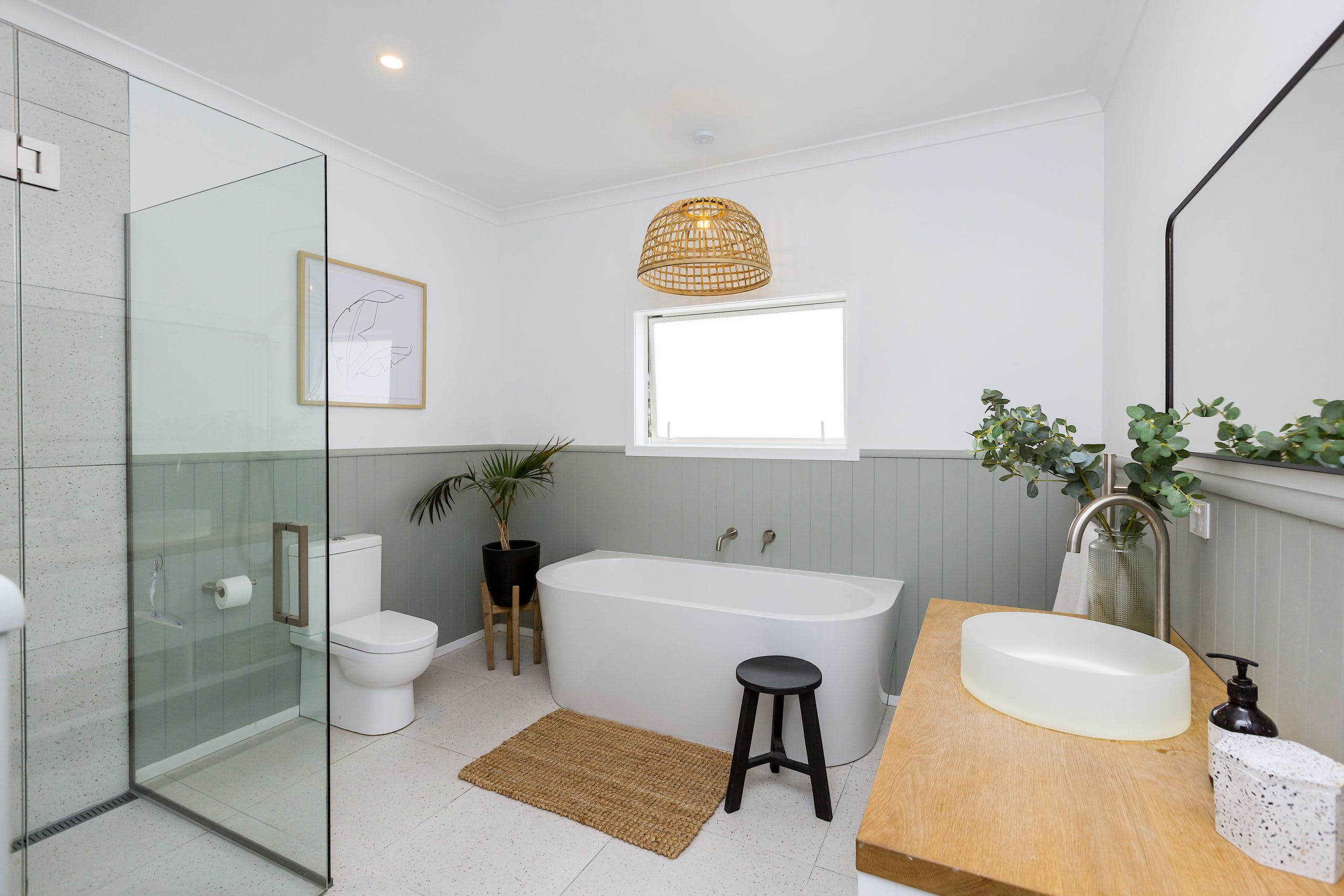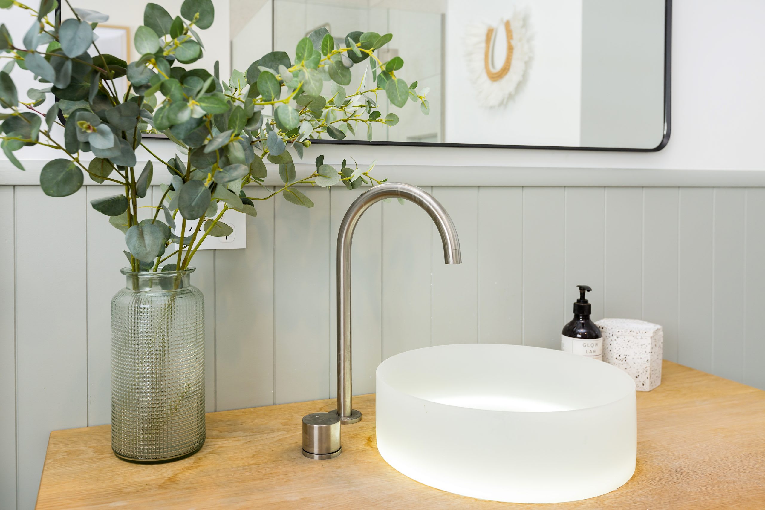 Subtle décor touches, including a potted palm and a vase of eucalyptus, breathe life into the space.