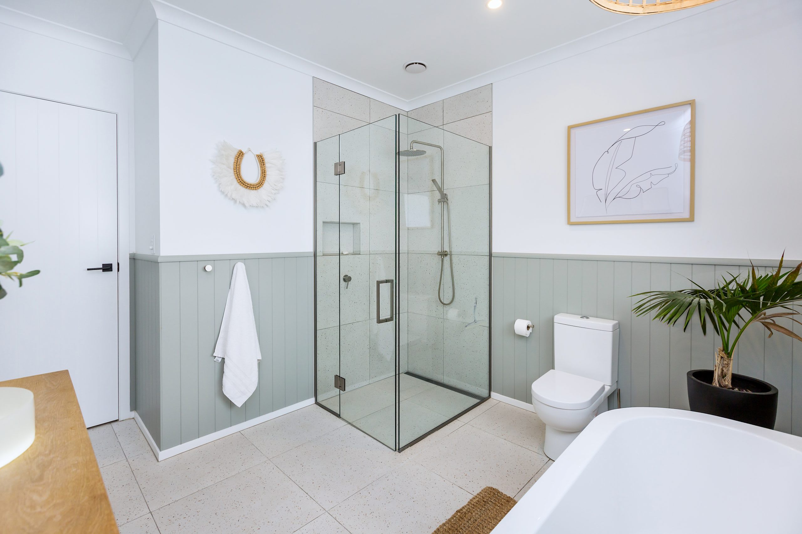 PaintDulux Ohai on Hardie Groove; Dulux Okarito on trims and ceiling | LightingHome lab pendant |