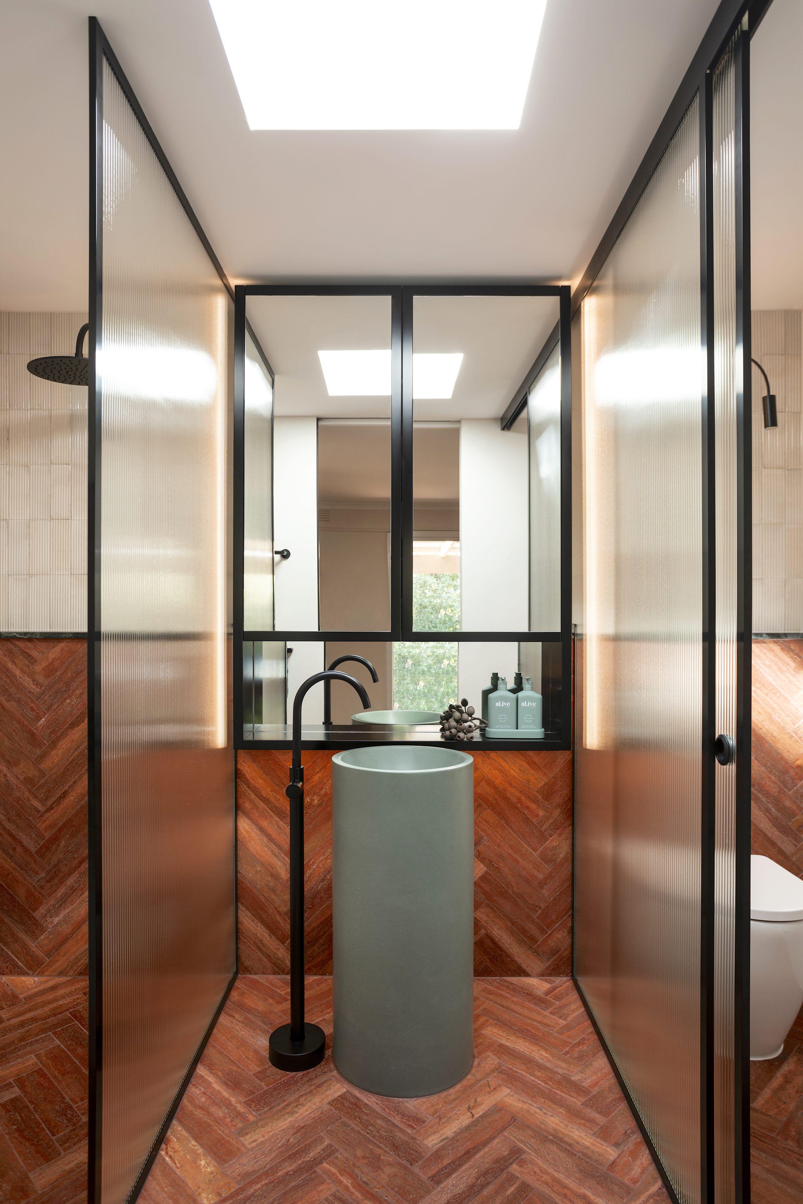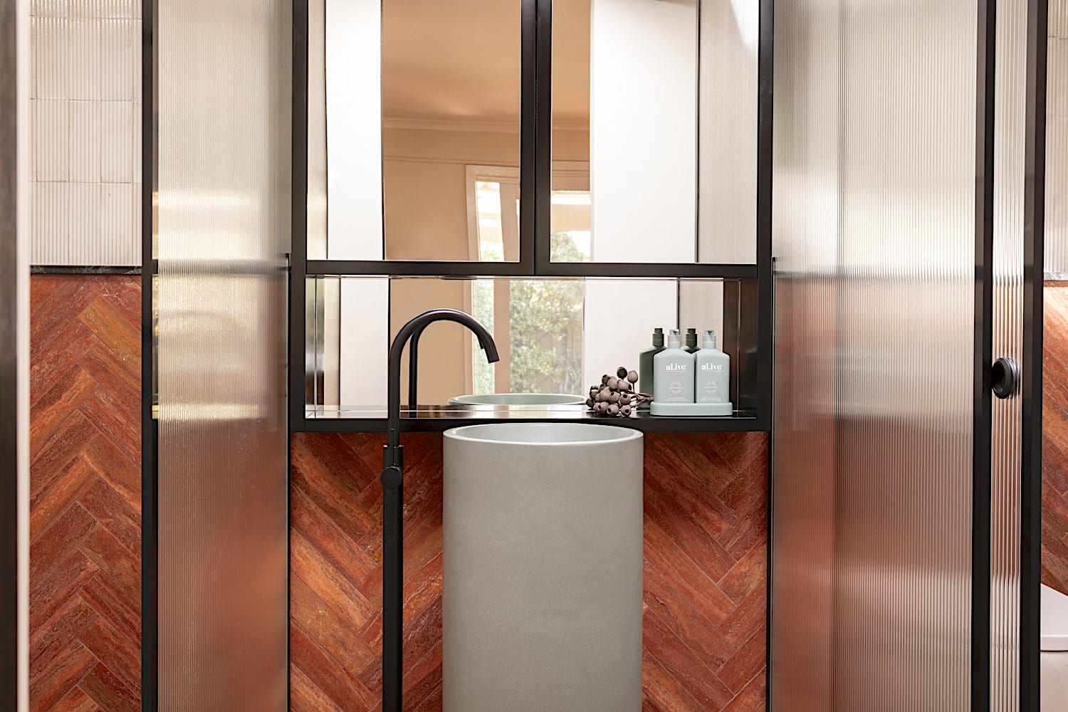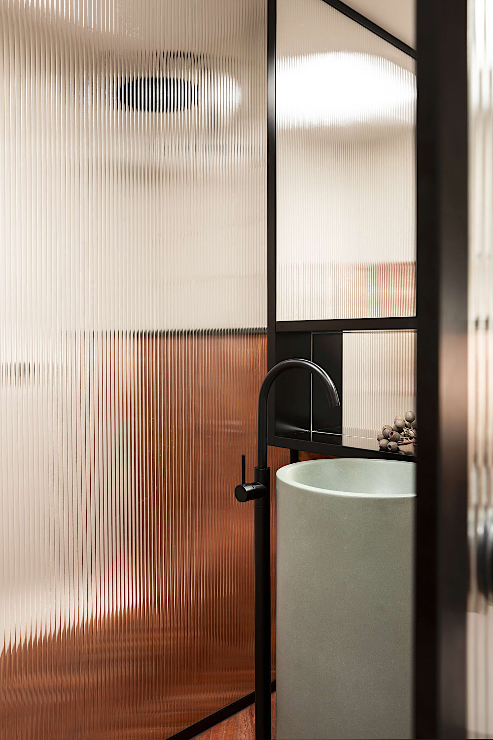 The powder room is loosely divided into areas of use – this was done with the fluted framed glass full height walls.