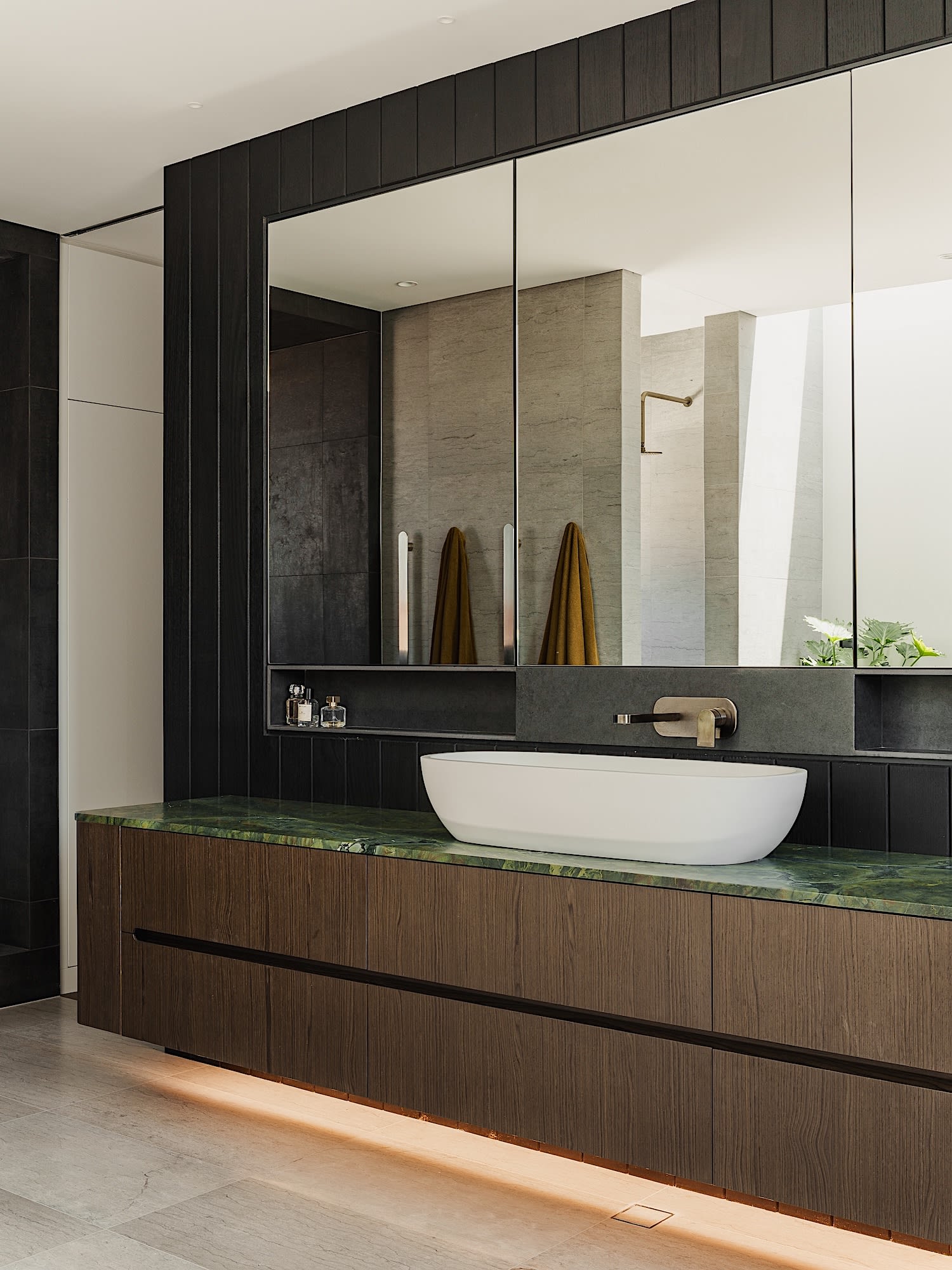 BenchtopNatural stone slabs – Hiroshi Green, from Bernini/Zuccari; Dekton Eter porcelain sheets | MirrorClear glass with polished edge, from Glass Australia |