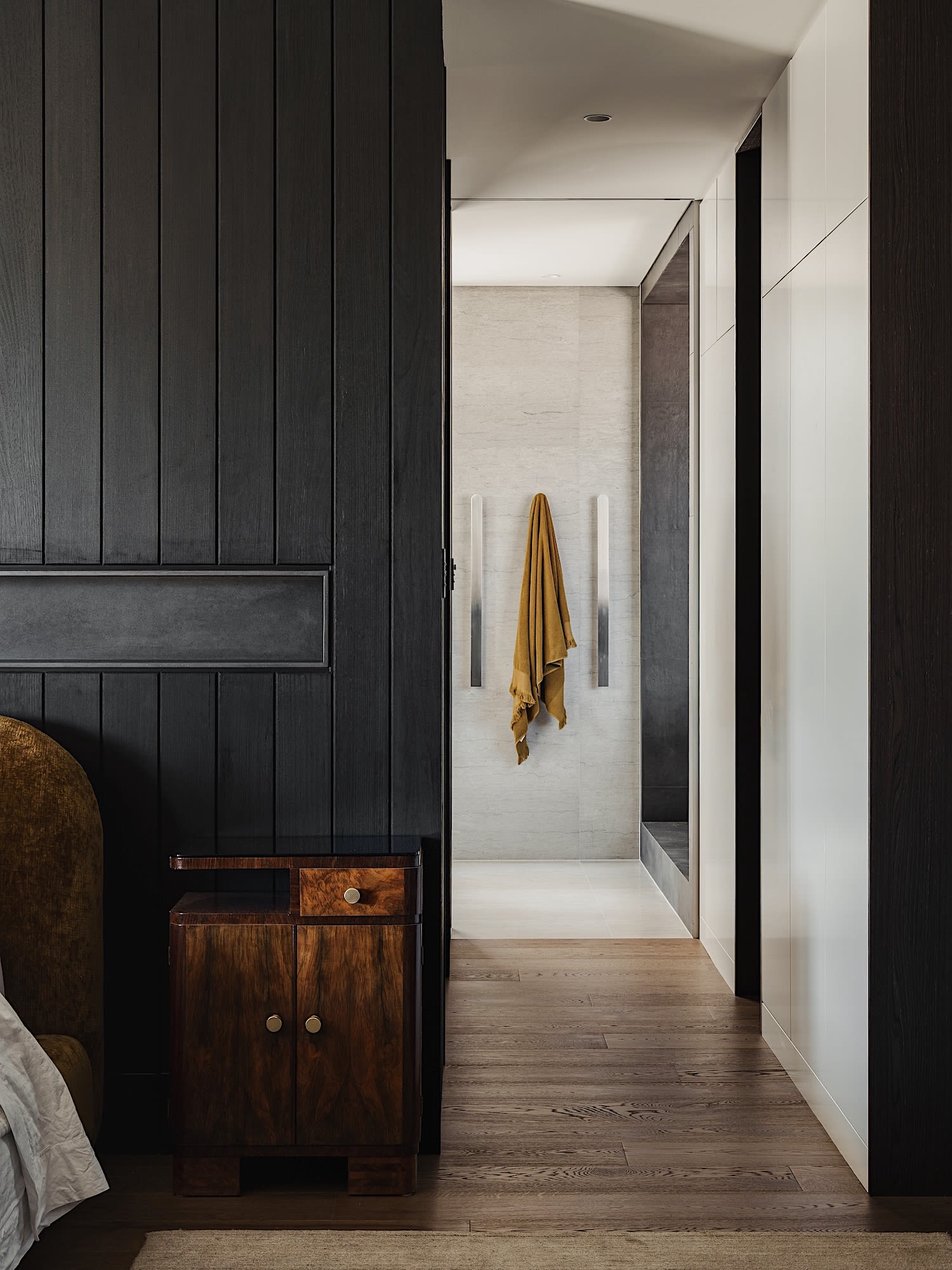 The owner sought a retreat that could stand alone as an elevated, apartment-like sanctuary combining bedroom, robe and ensuite into a cohesive experience with a luxurious feel.