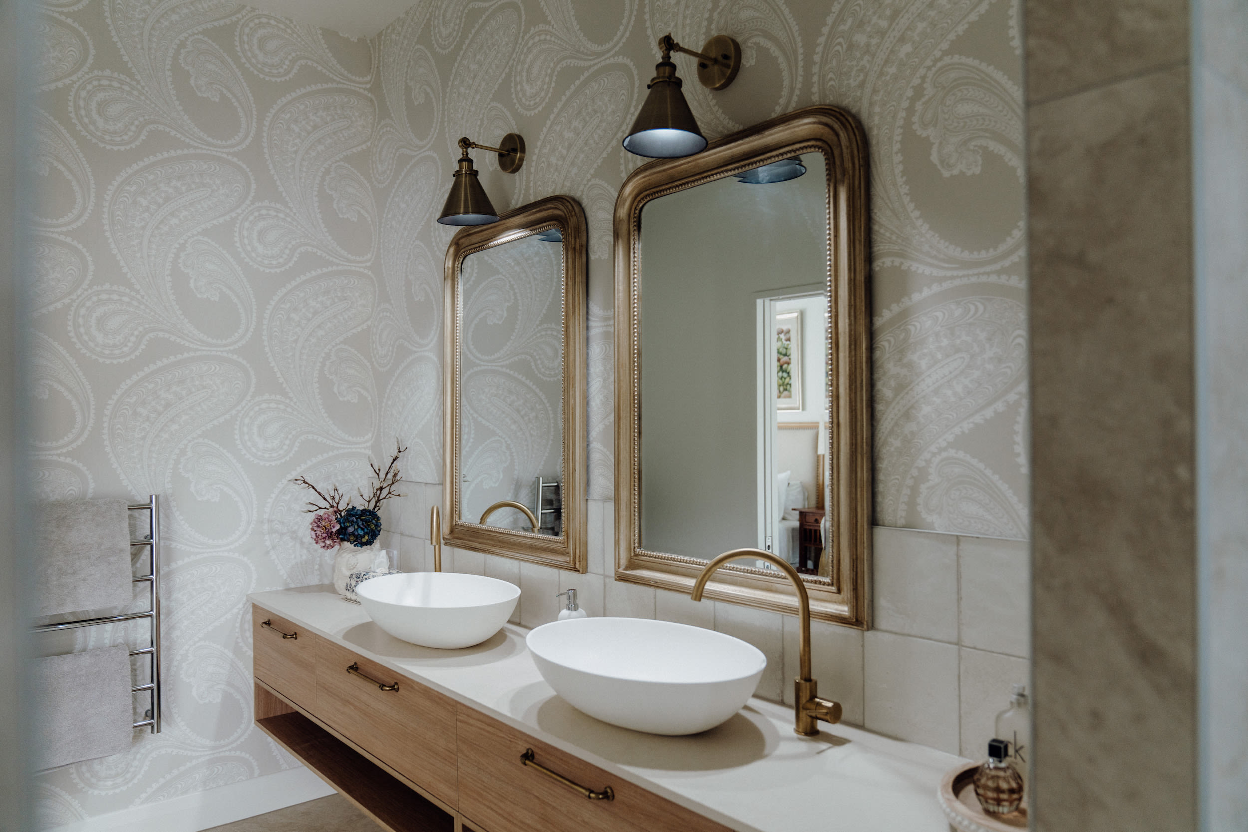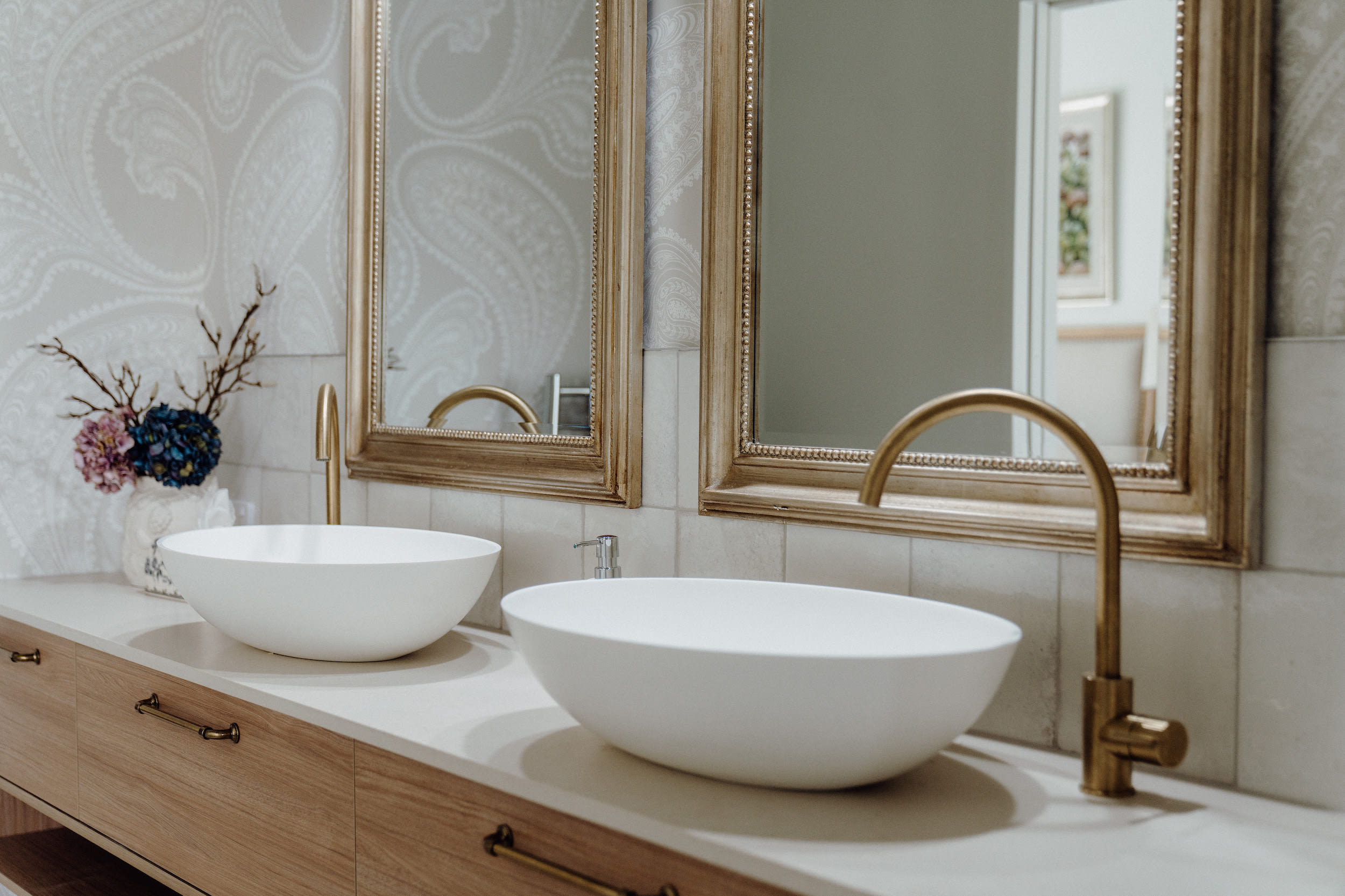 To elevate the space while honouring its original structure, we layered warm travertine-style tiles with a bold feature wallpaper, selected for its soft curves and subtle movement.