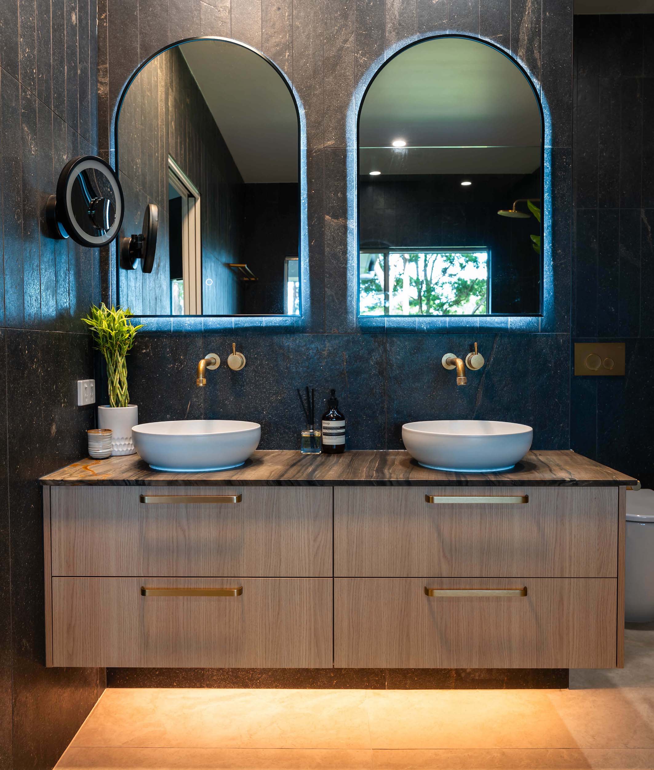 Vanity cabinetryBlum Antaro – Tandombox | Vanity benchtopSequoia Brown Satin Natural Stone, from ACE Stone & Tile |