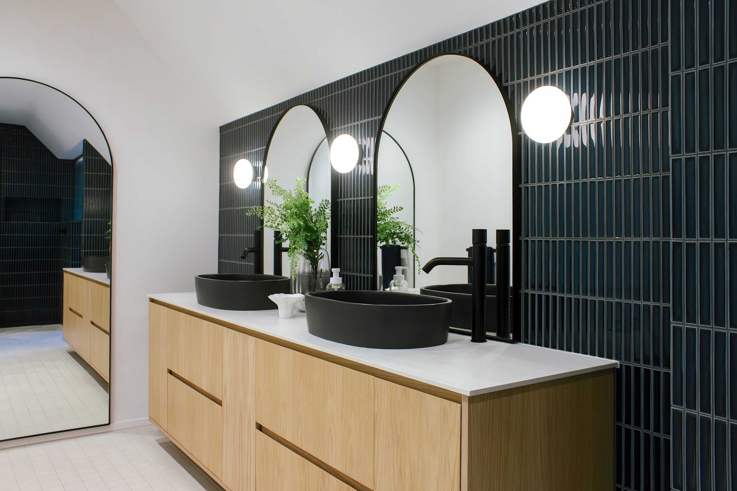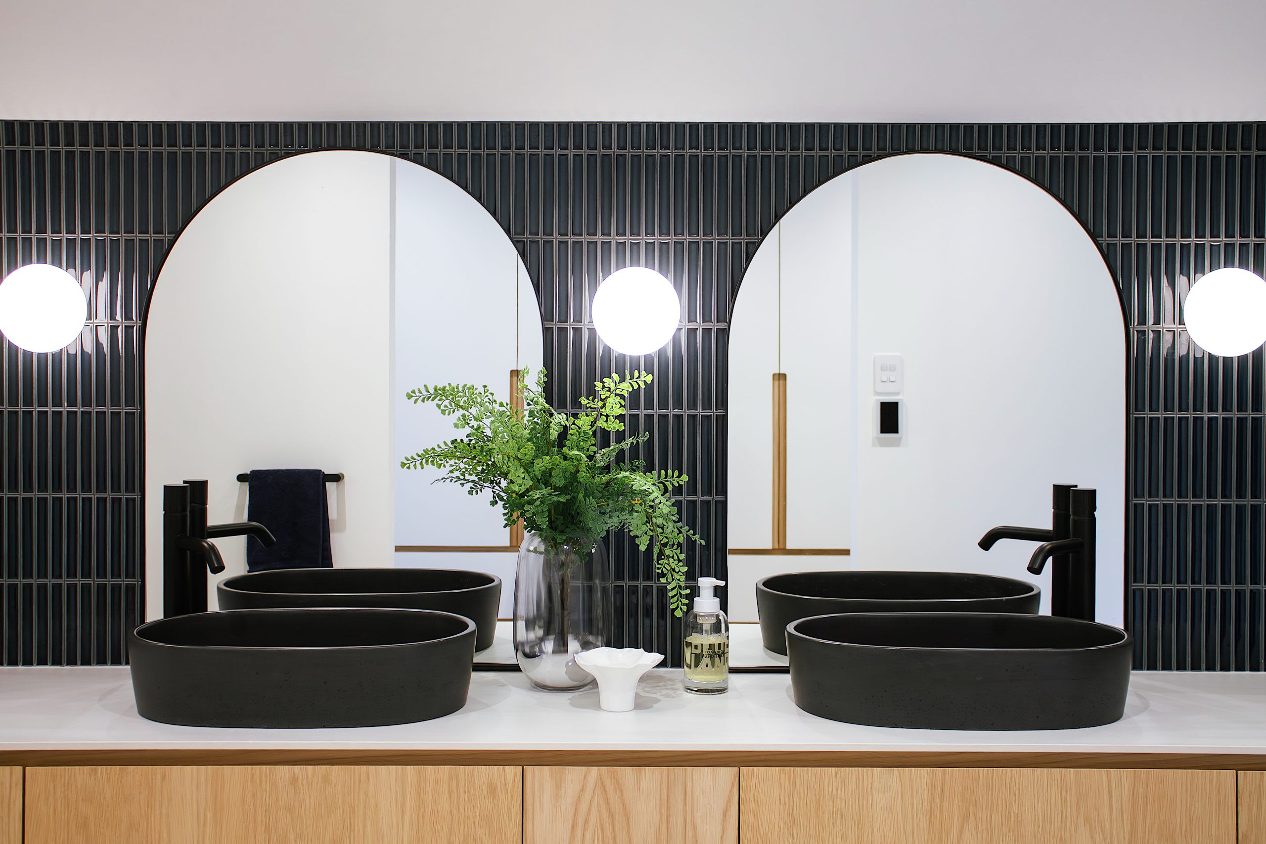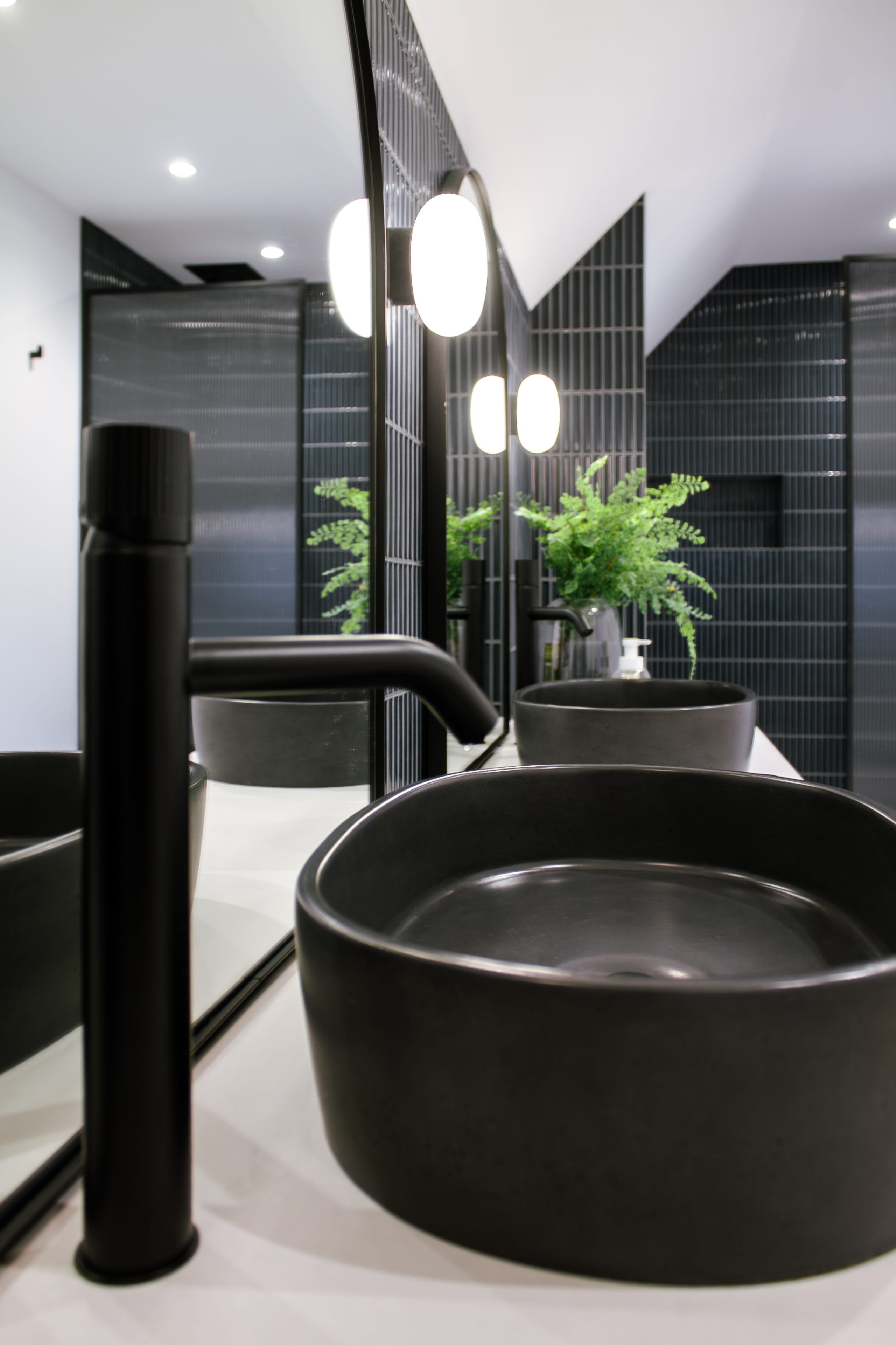 Black concrete basins, large arched mirrors, and elegant lighting create a sense of understated luxury.