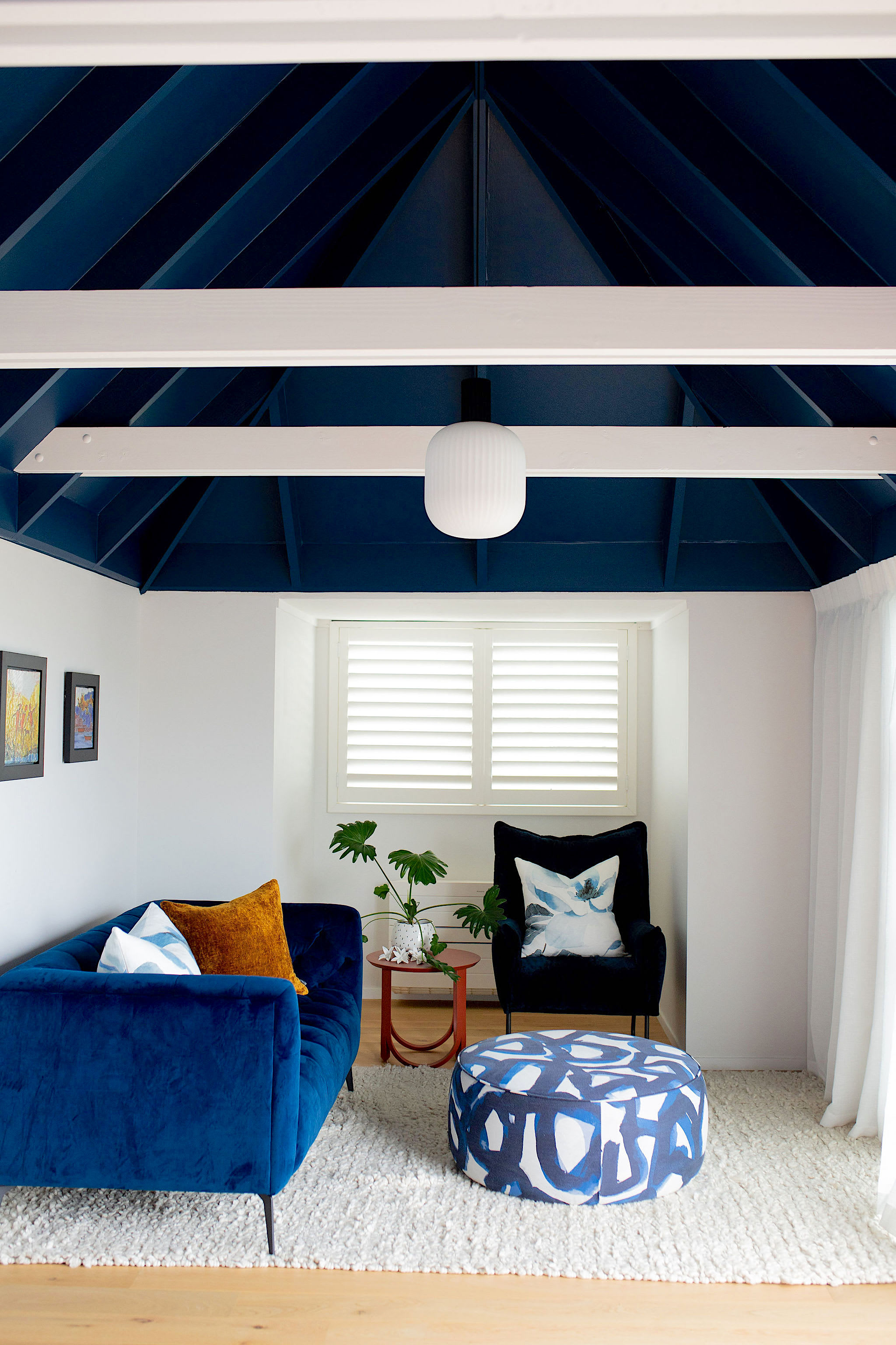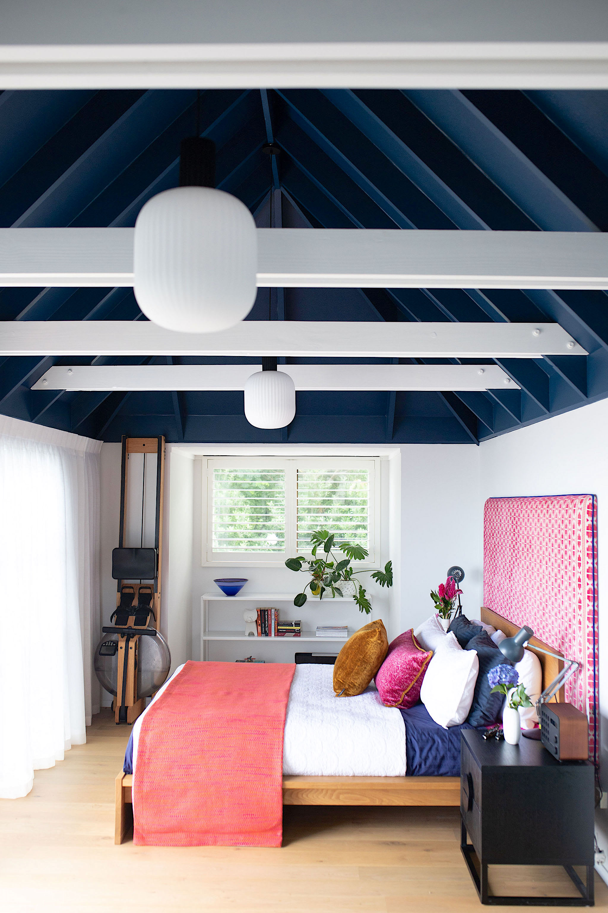 In the master bedroom, soaring ceilings were transformed into a defining feature by painting them a rich navy.