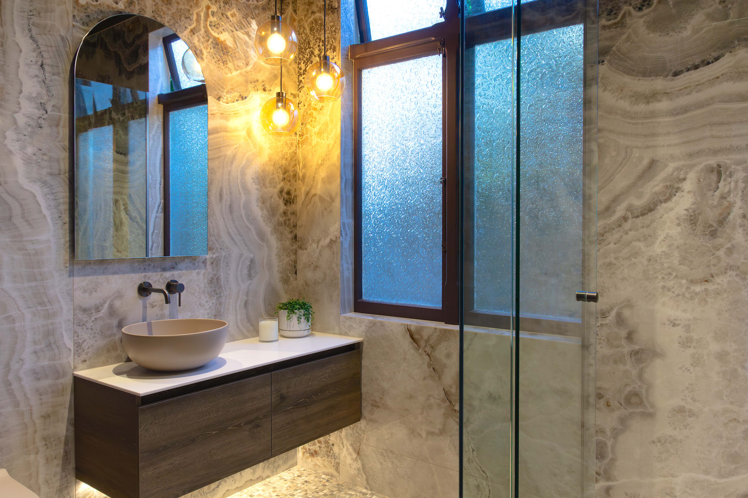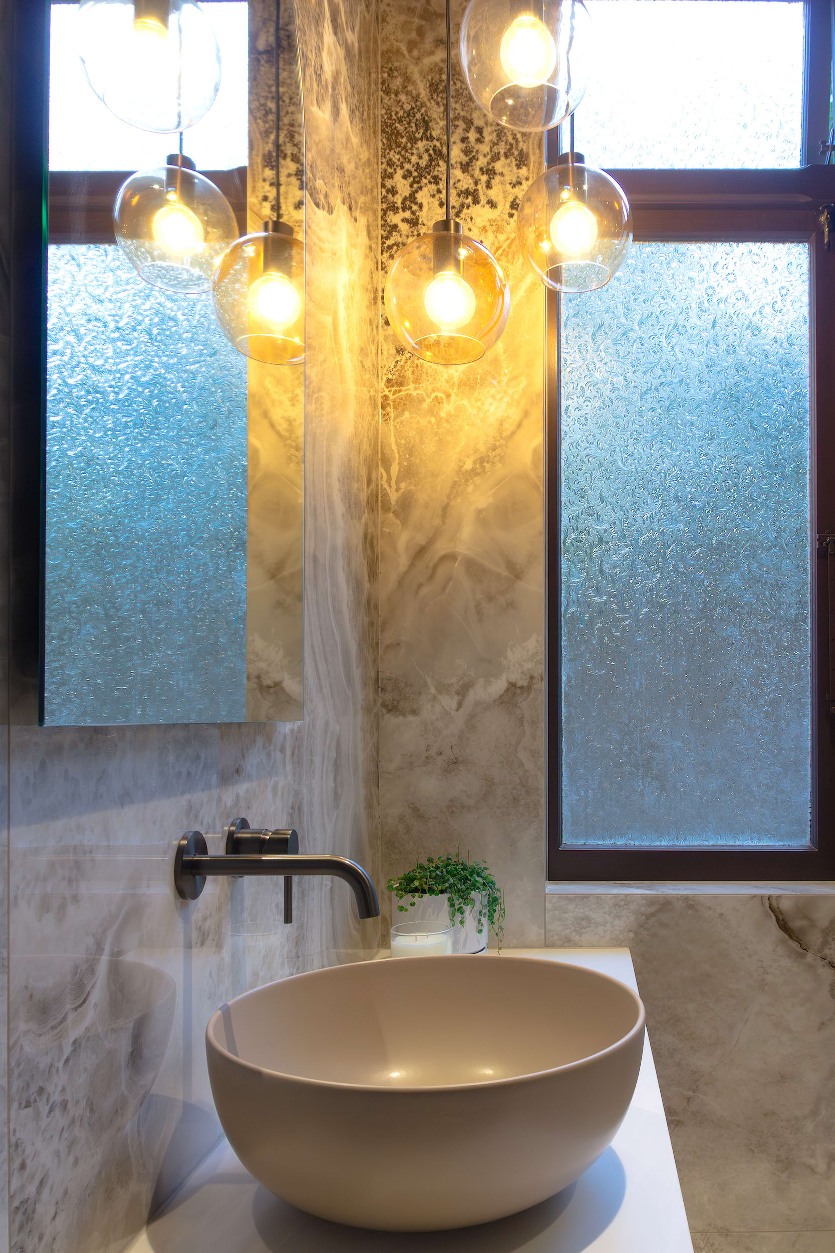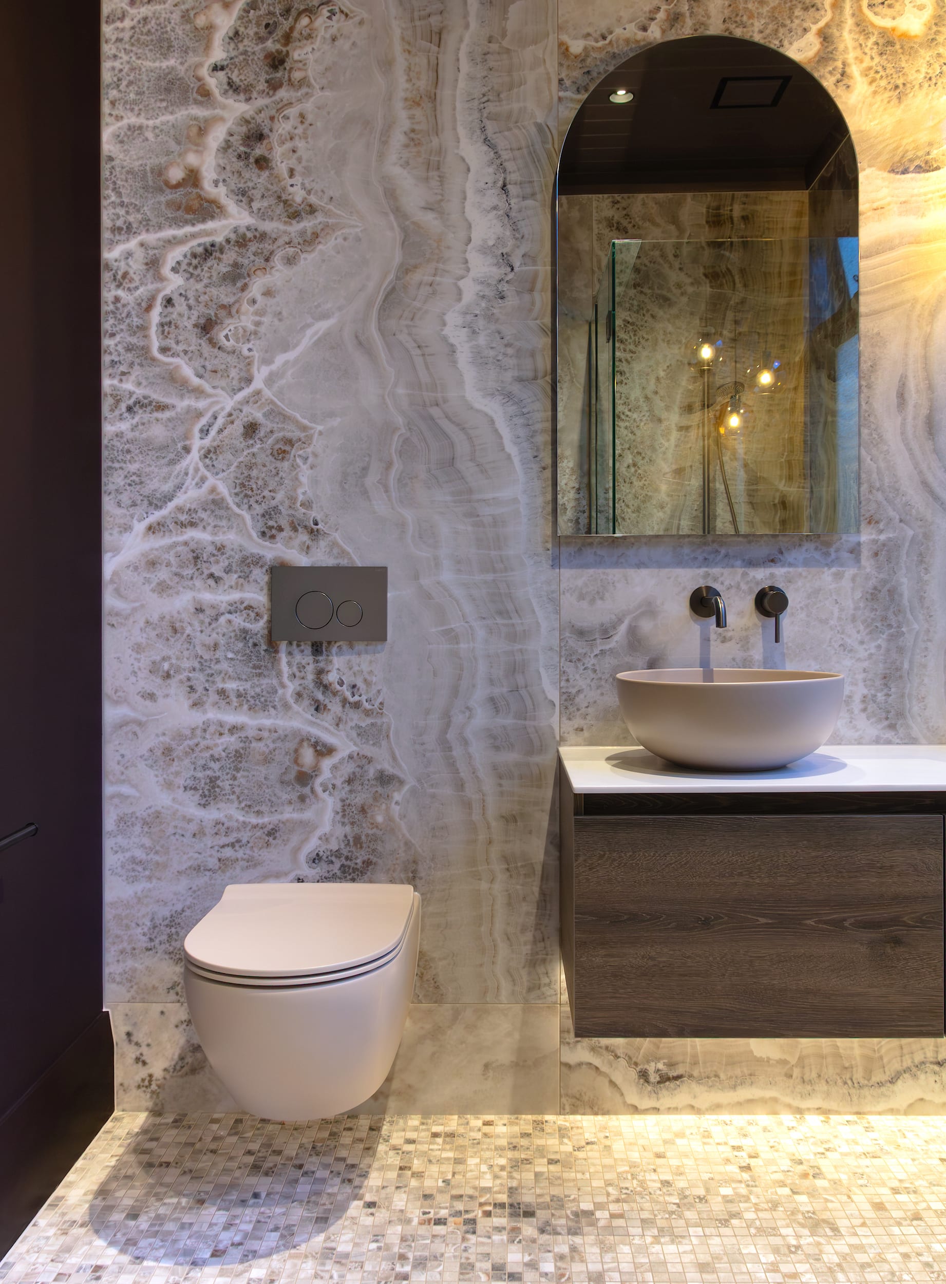 This space functions as both the family and guest bathroom and the owners’ brief was to create a ‘showstopper’ space that would wow their guests but still function well on a daily basis.