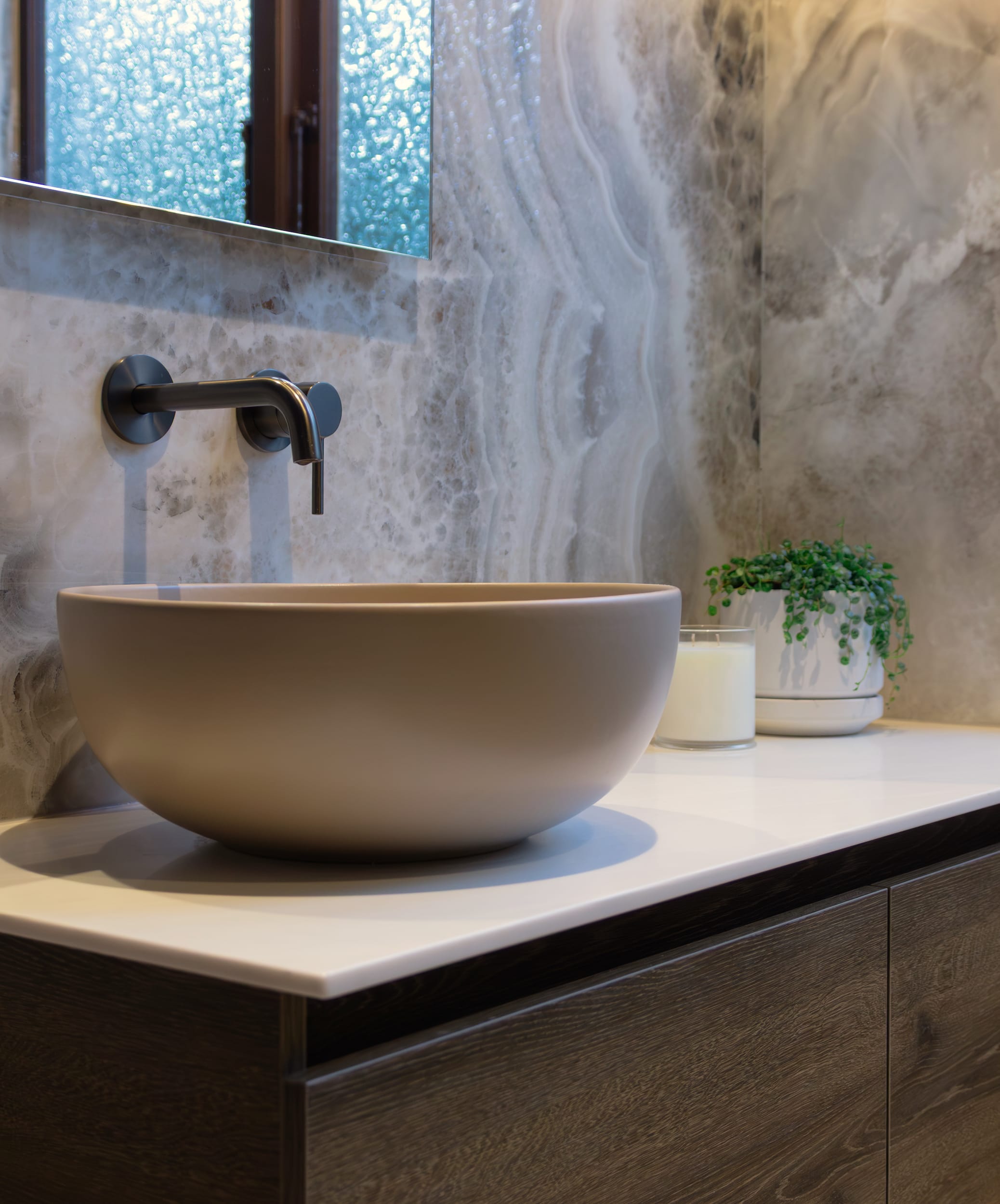 The solid surface vanity benchtop has a lovely swirling pattern and provides a highly functional material for the bathroom.