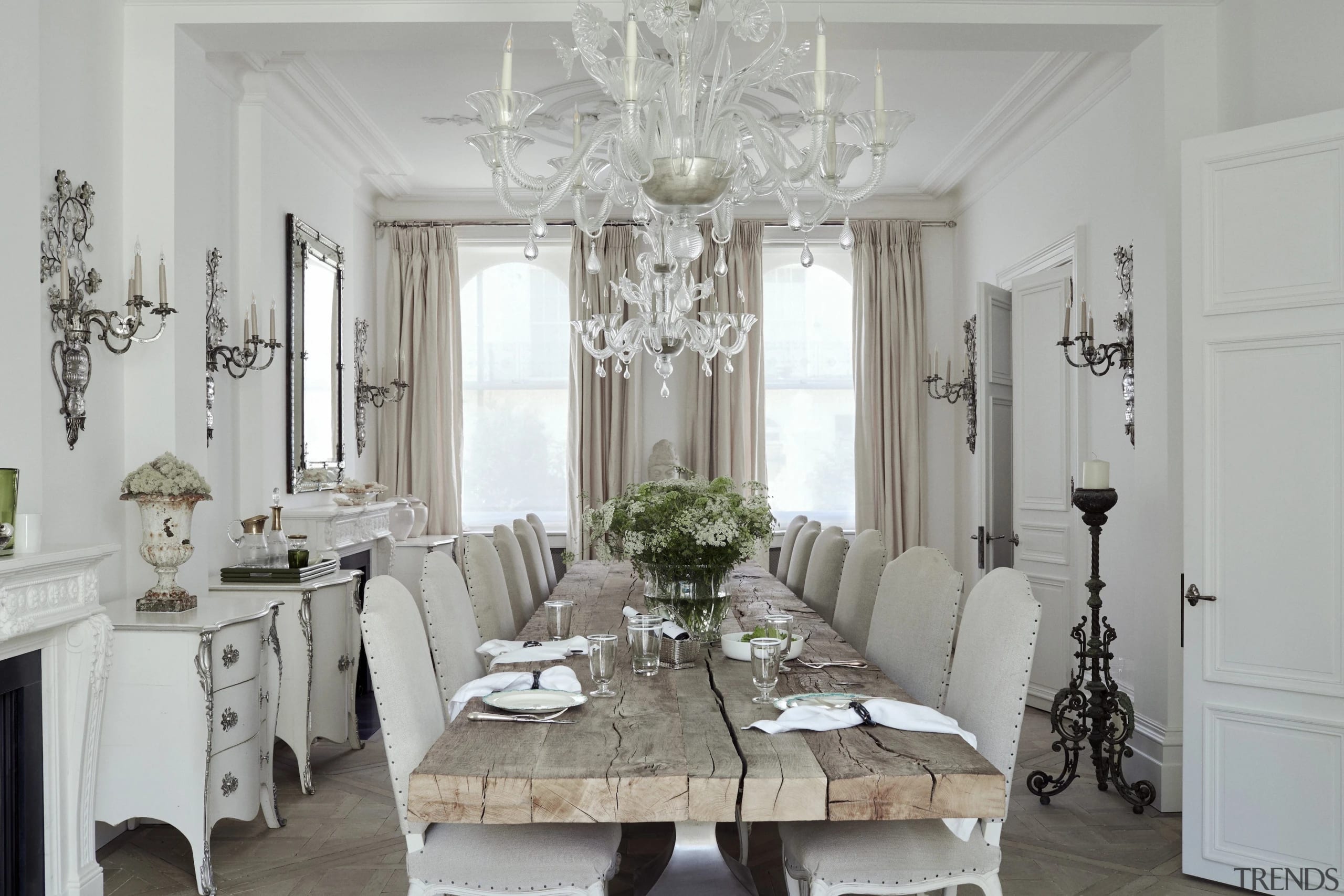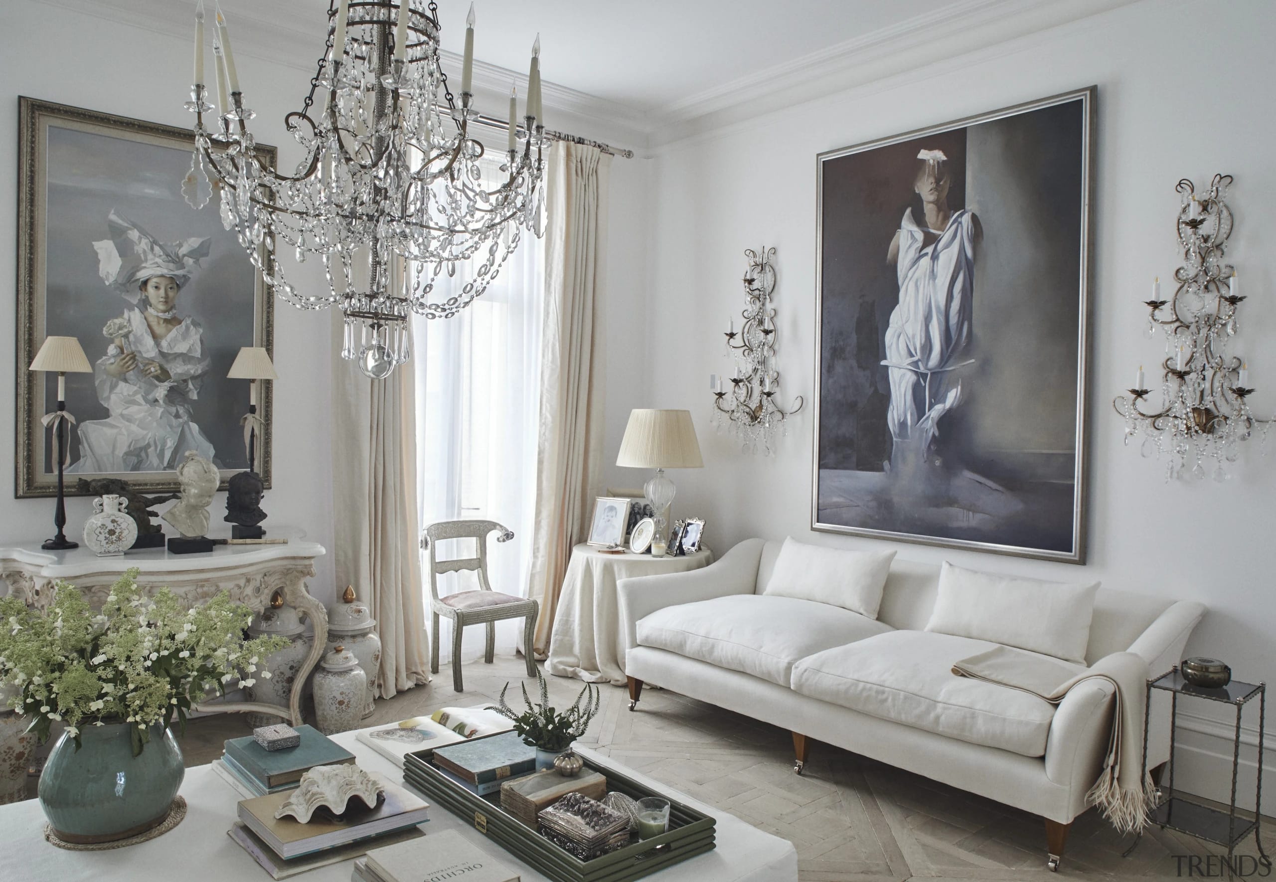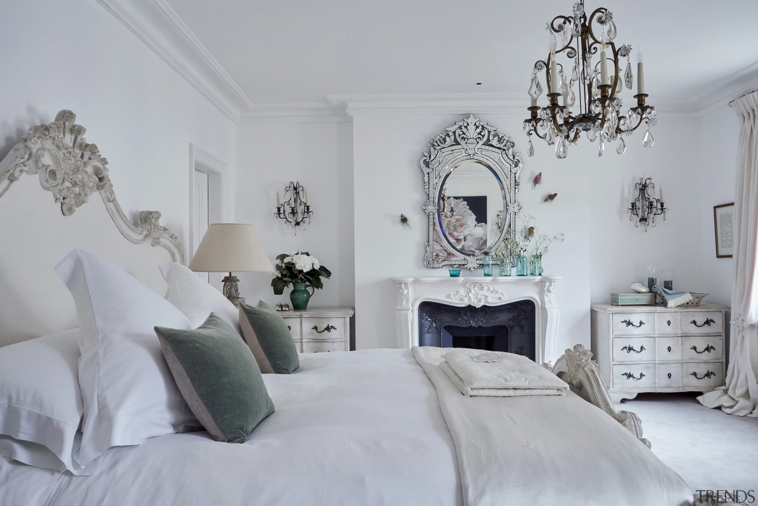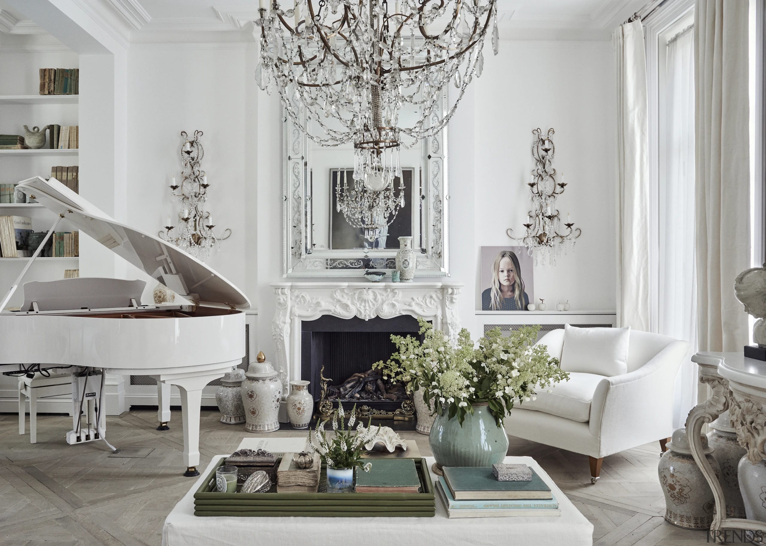 Playing with an almost monochromatic white scheme, Henry brought in characterful layers of texture with white oiled oak floorboards, white chalk-finished walls, pale grey silk rugs, handpicked antiques, bespoke crystal Murano chandeliers, and French-style carved marble fireplaces.