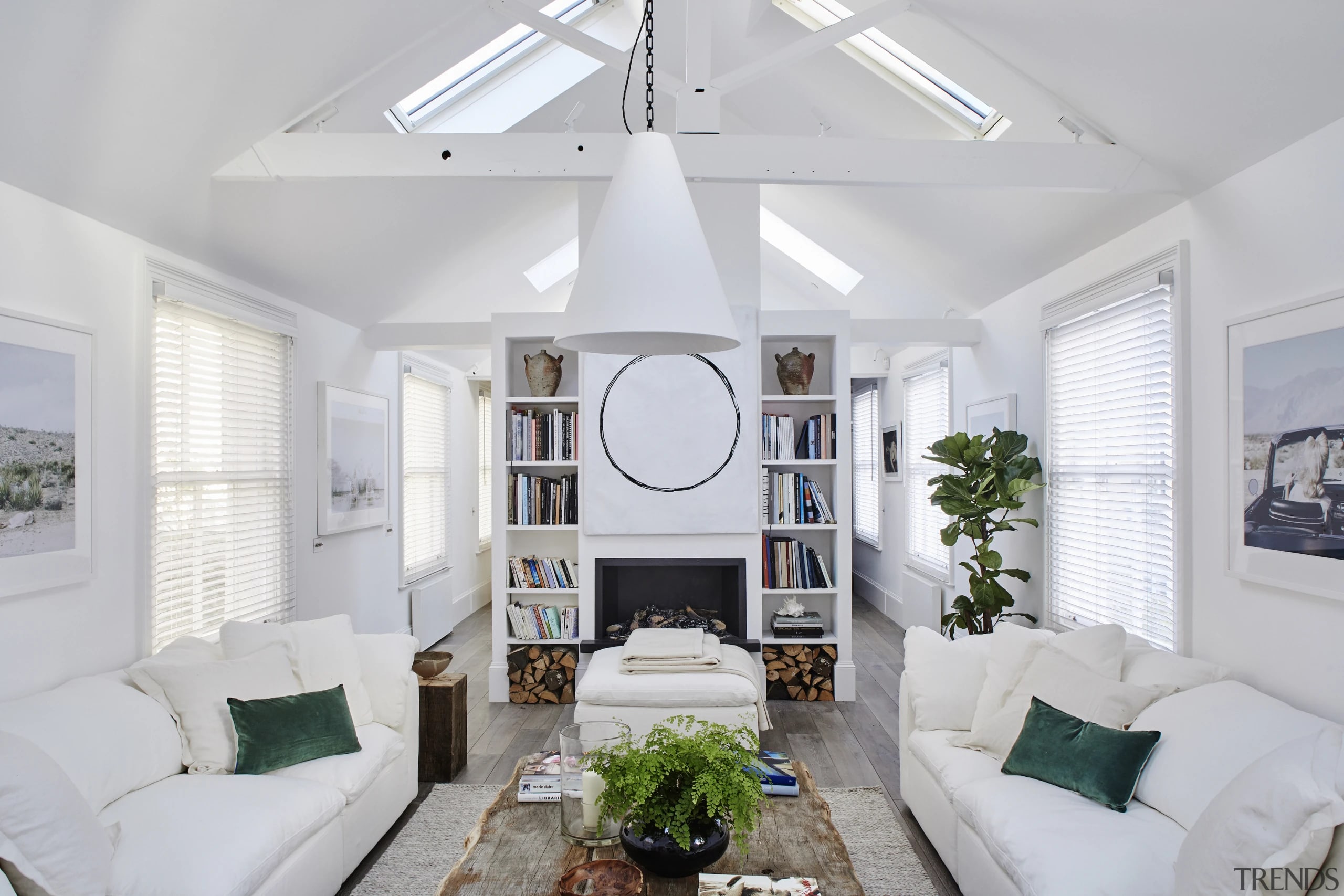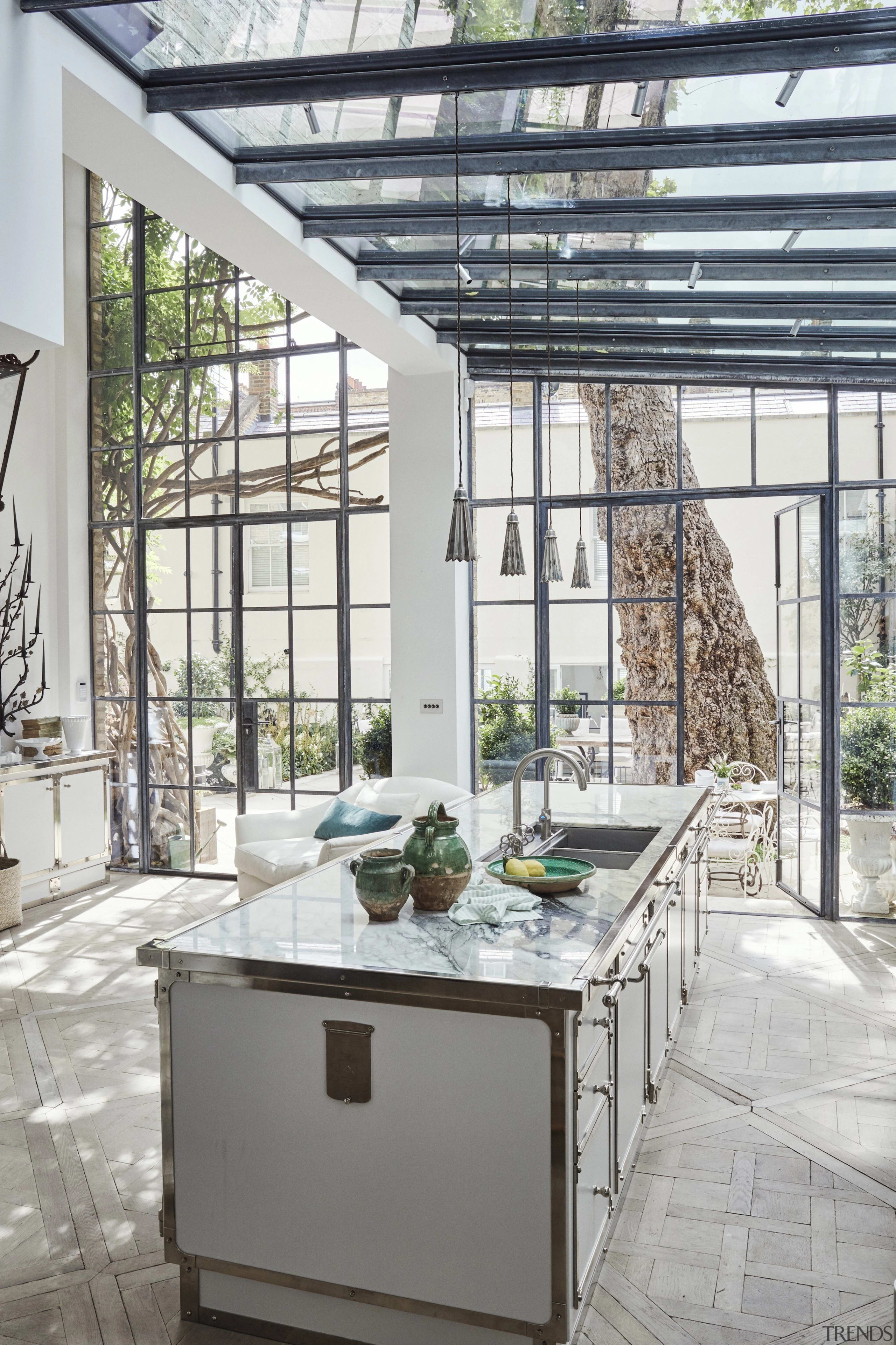 Just as in the main house, she has opened the space with skylights and picture windows, letting light stream in and, in turn, reflect off the bright white kitchen and its expansive brushed steel splashback.