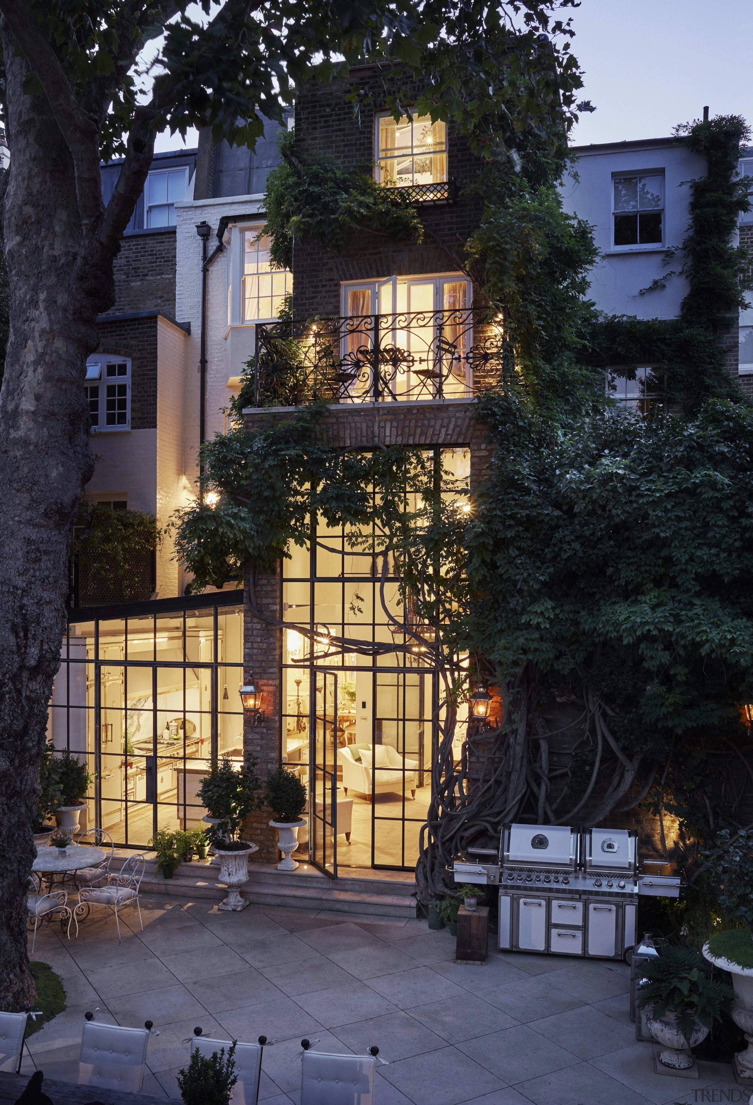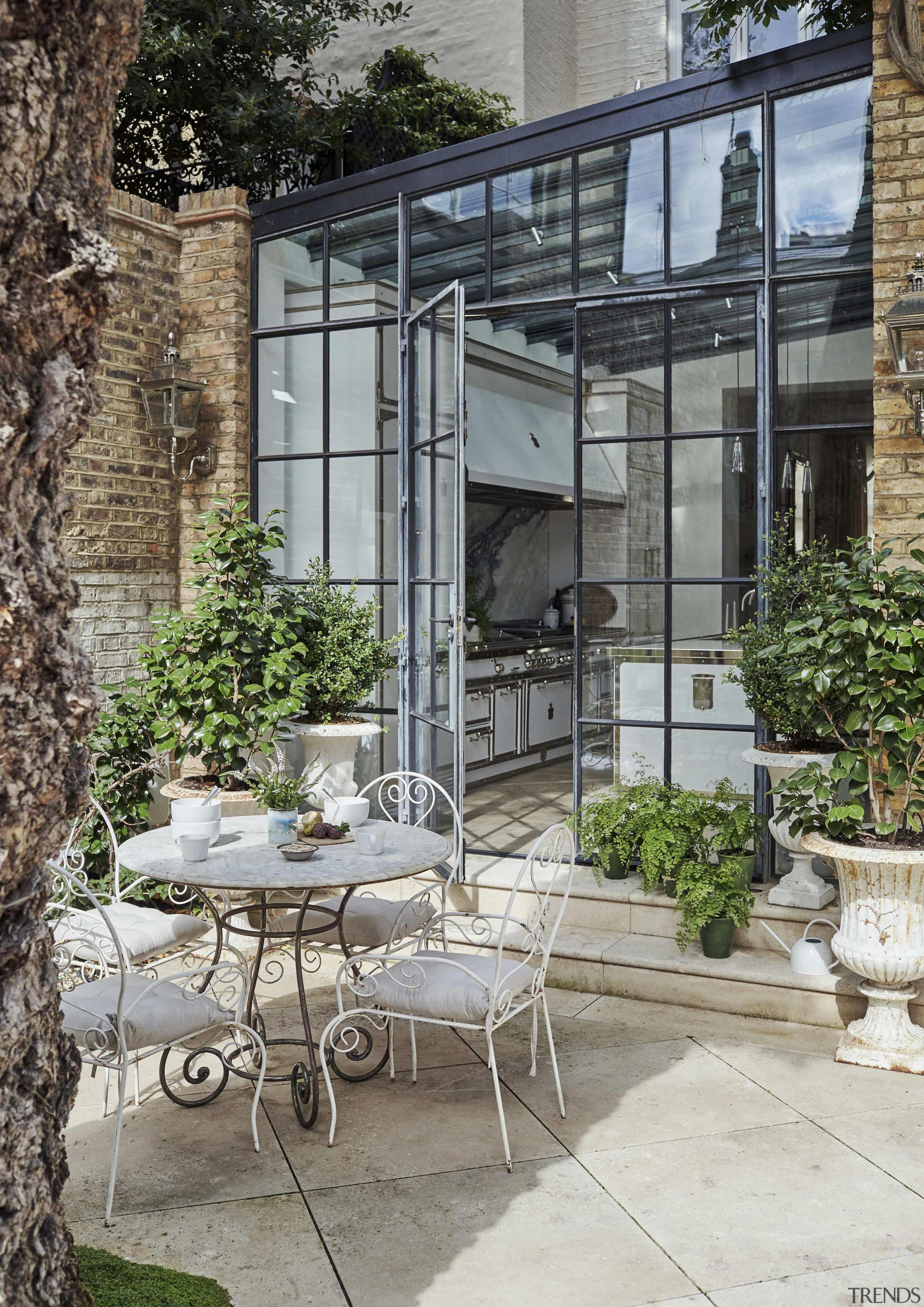 There lies a wonderful surprise – a double-height floor-to-ceiling glass wall and roof, which feels like a palatial orangery, with climbers and antique camellia urns.