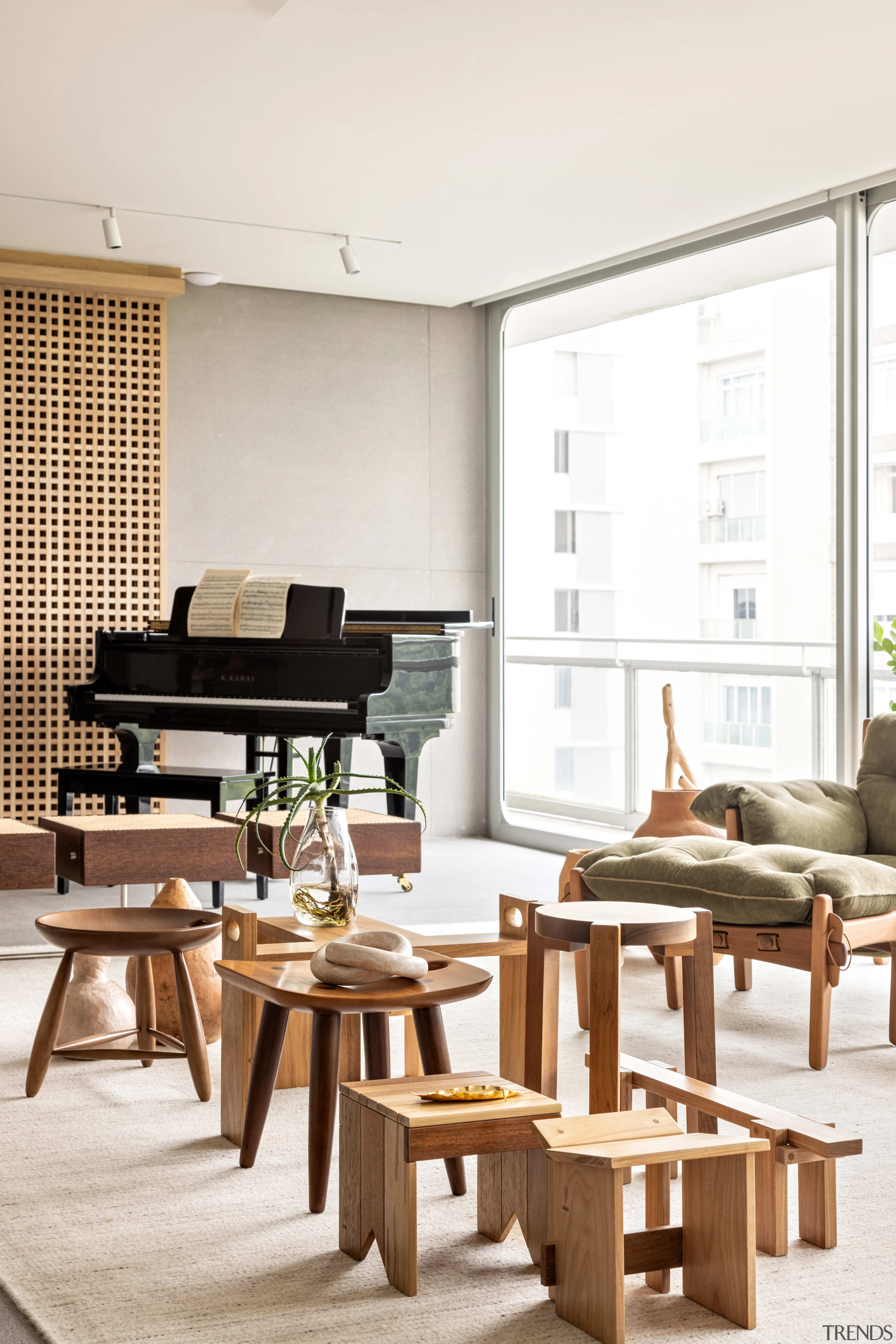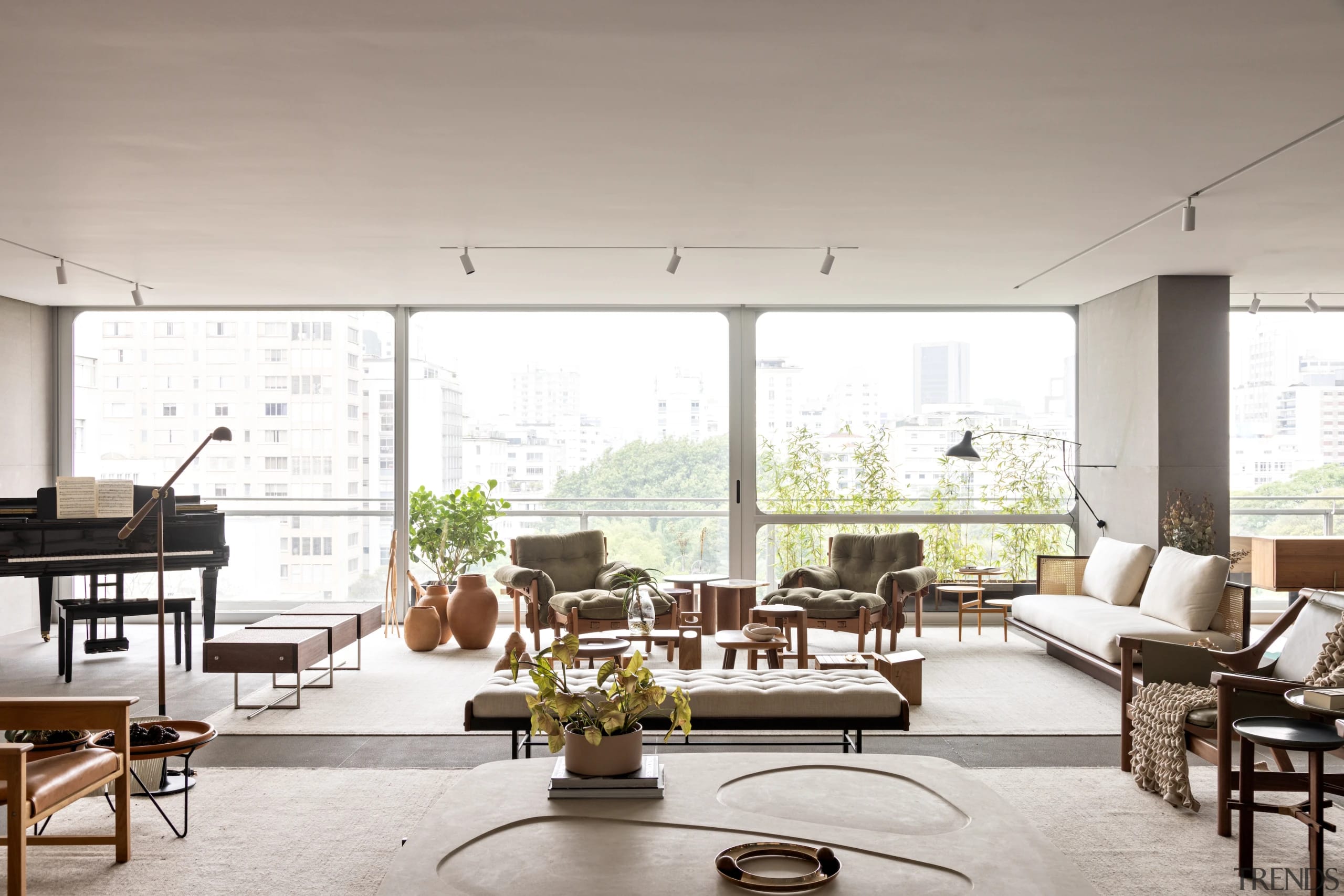 Secondary layers such as luminaires, objects, and compositions followed the same reasoning, as it is possible to observe on the coffee table composed of traditional Brazilian stools in a kind of artistic-functional installation.