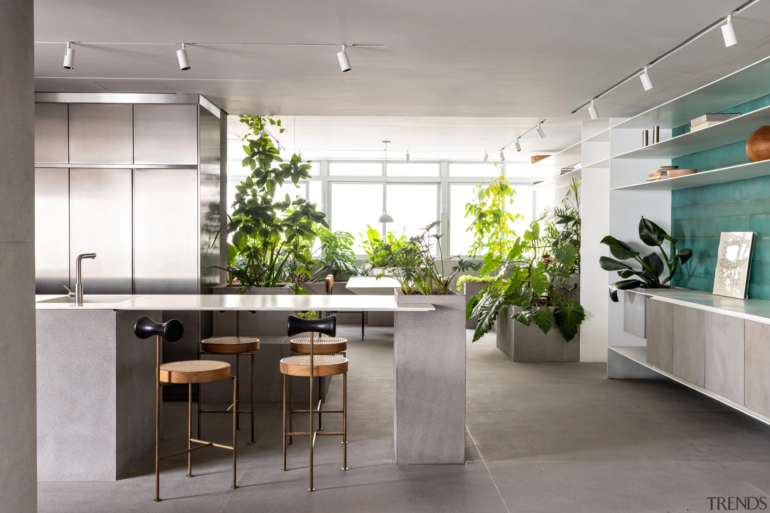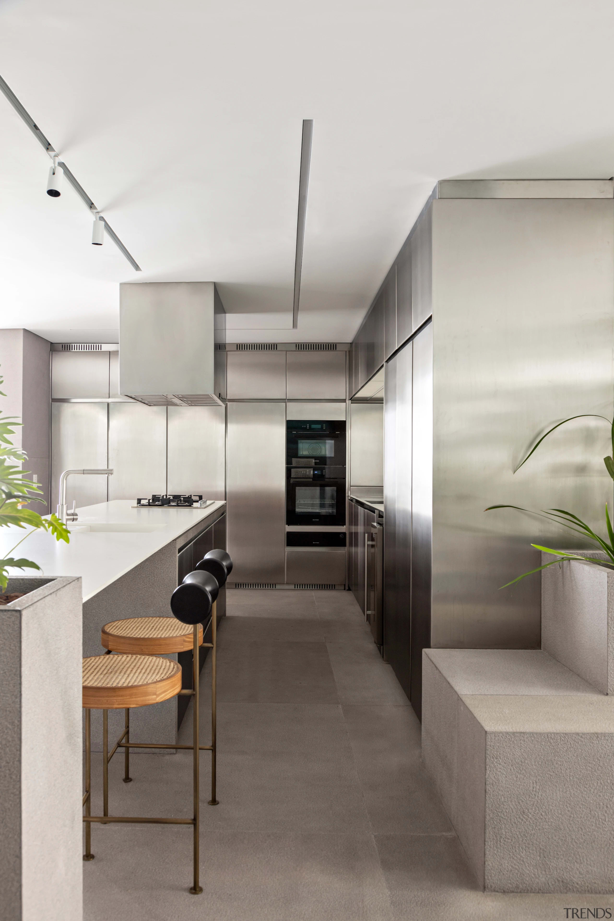 These volumes also arrange the large open central island of the kitchen which is finished with stainless steel furniture.