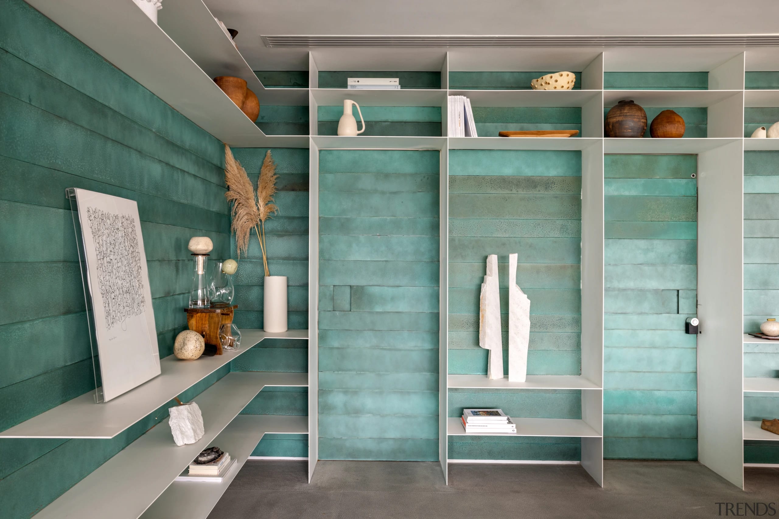 Thin metal plates anchored to the walls and inserted between the copper plates become a bookcase that runs through the social and service area, organising the doors of elevators and toilet, and encompassing the wine cellar and becoming support furniture of the kitchen area.