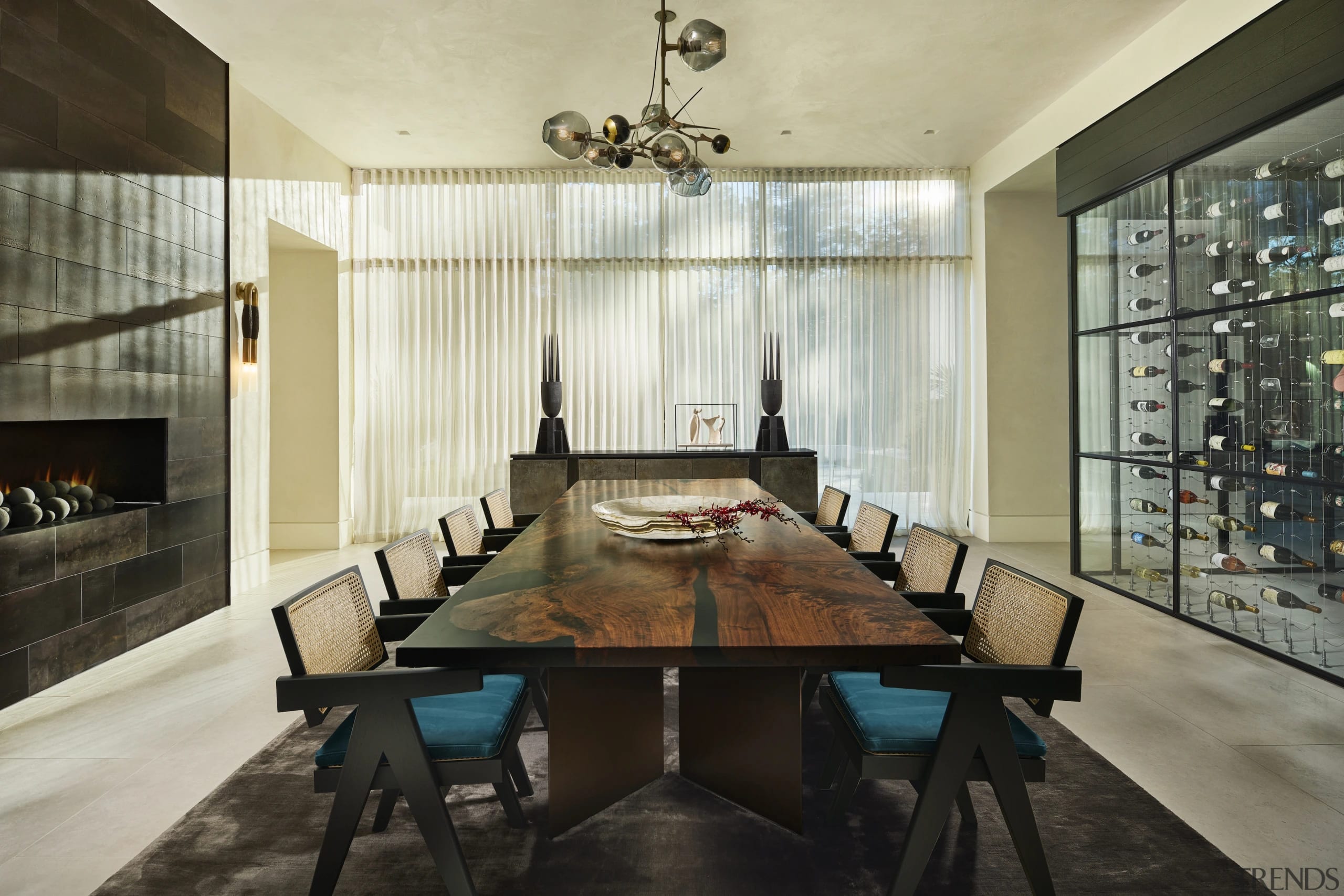 On the other side of the dining room is the enclosed wine room, completely clad in an age-old Japanese material called Shou Sugi Ban, which consists of a charred black cypress wood.