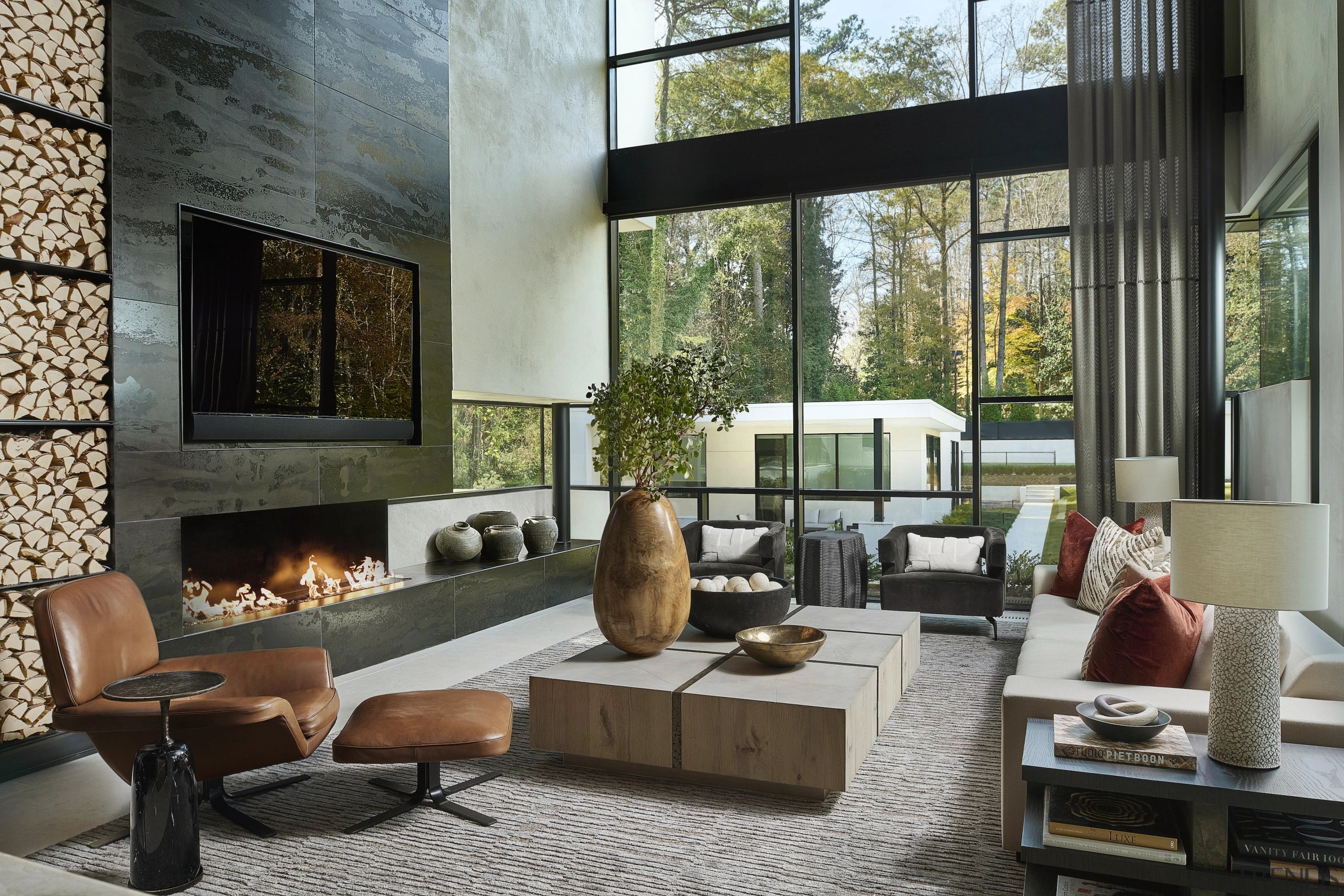Our firm designed many interior architectural features, from the custom kitchen and bar to the Shou Sugi Ban clad wine room to the towering kindling fireplace feature in the great room.