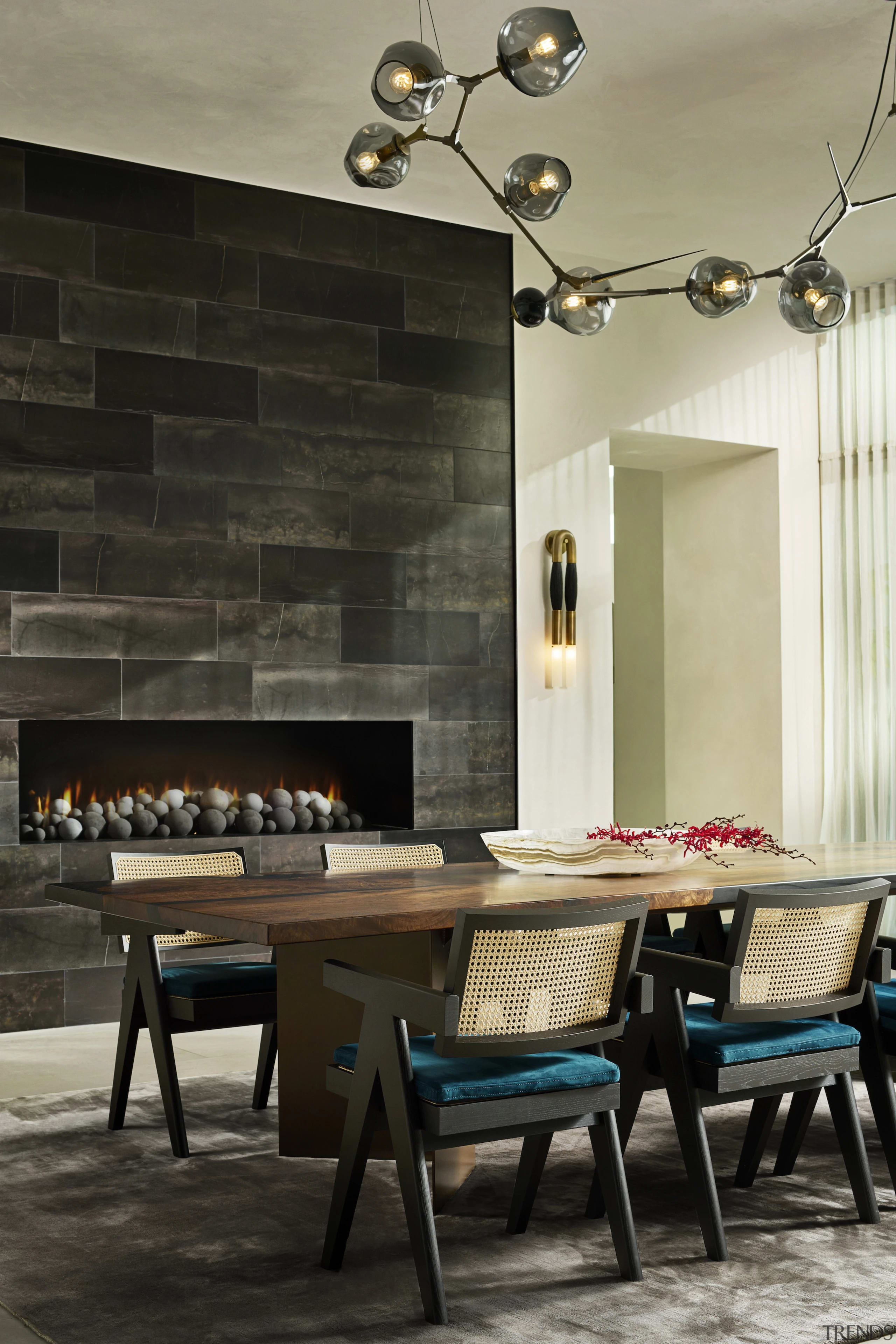 The dining room was surrounded by windows with no walls to place art – so Lindsey Adelman’s sculptural chandelier in hand-blown glass with cast bronze details, from her Burst collection, provided the perfect focal point.