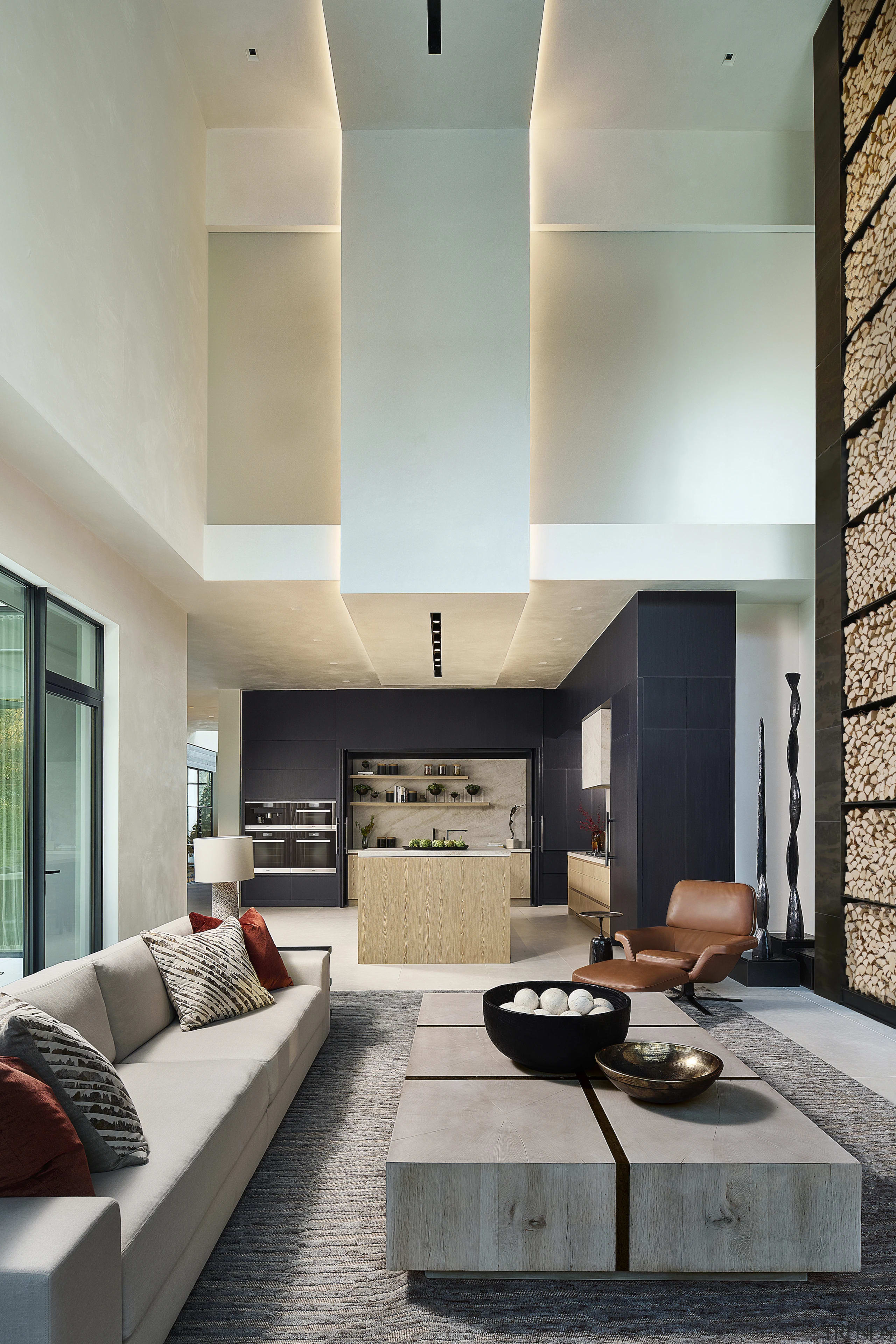 One example is the custom kitchen millwork – the kitchen ceiling is 13.6m high, so we created a visual division with the cabinets using natural and ebonised rift oak.