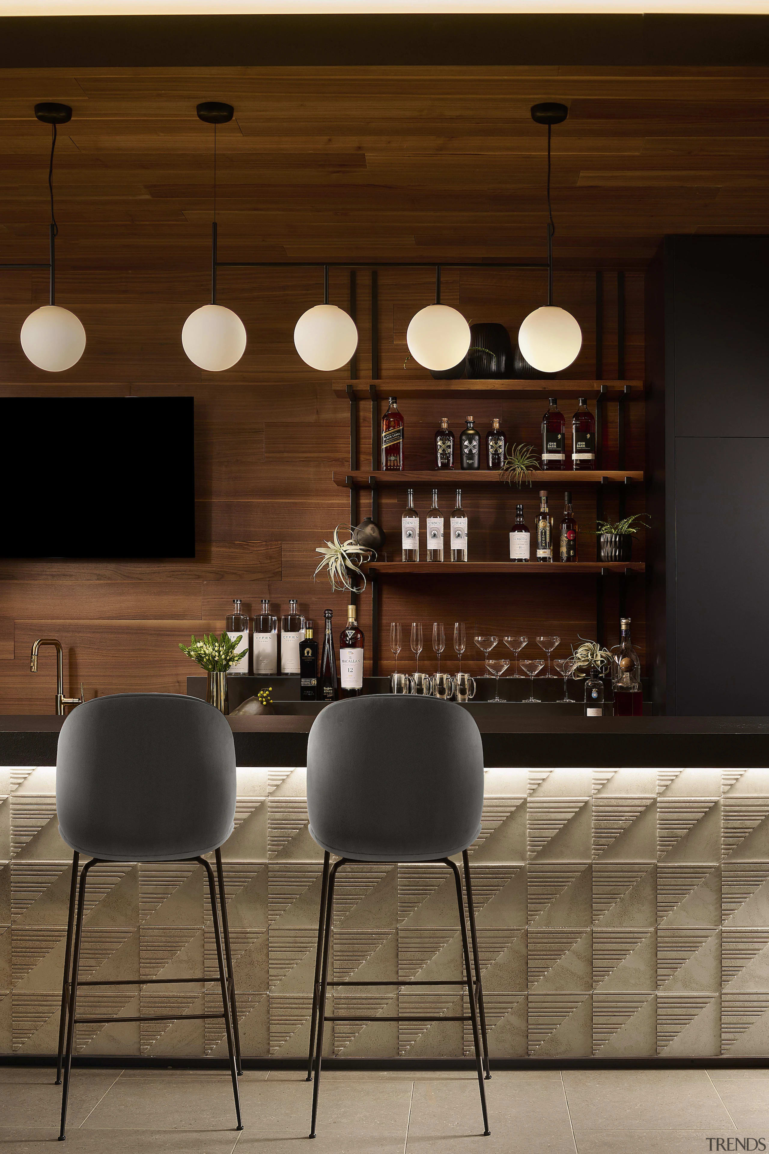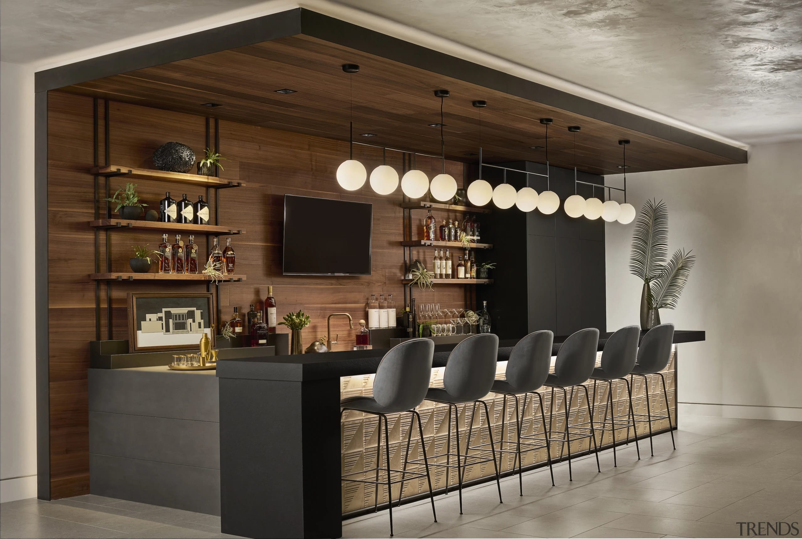 The globe light fixtures seen over the bar – TR Bulb suspension, from Danish company Menu Design – they also make a statement, just offer more of a fun, retro look and feel.