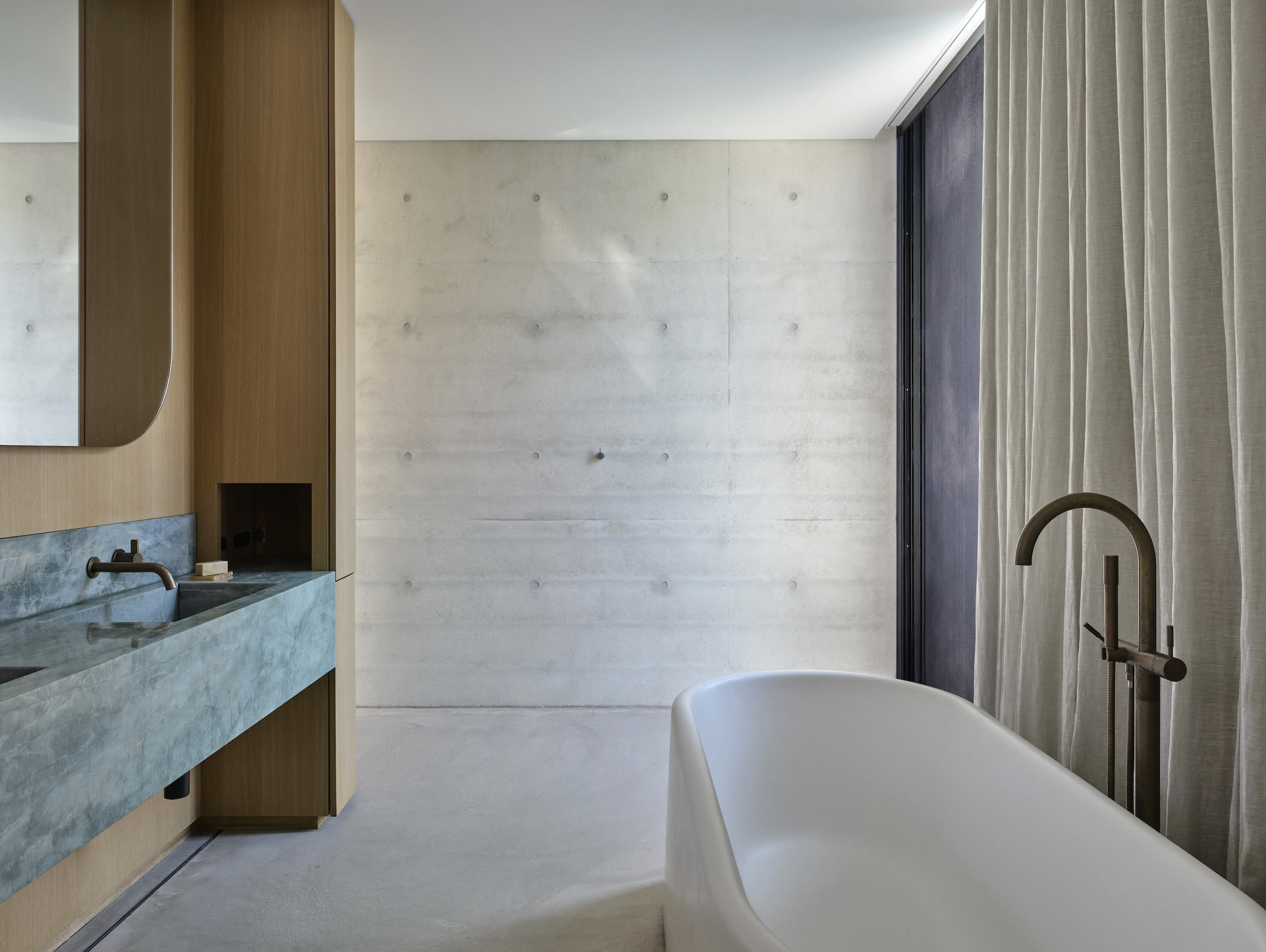 In tune with the calm, pared back feel of the wider home, this main bathroom delivers a relaxing 'bath house' vibe where the stonework and dramatic tub take centre stage and the shower is tucked away