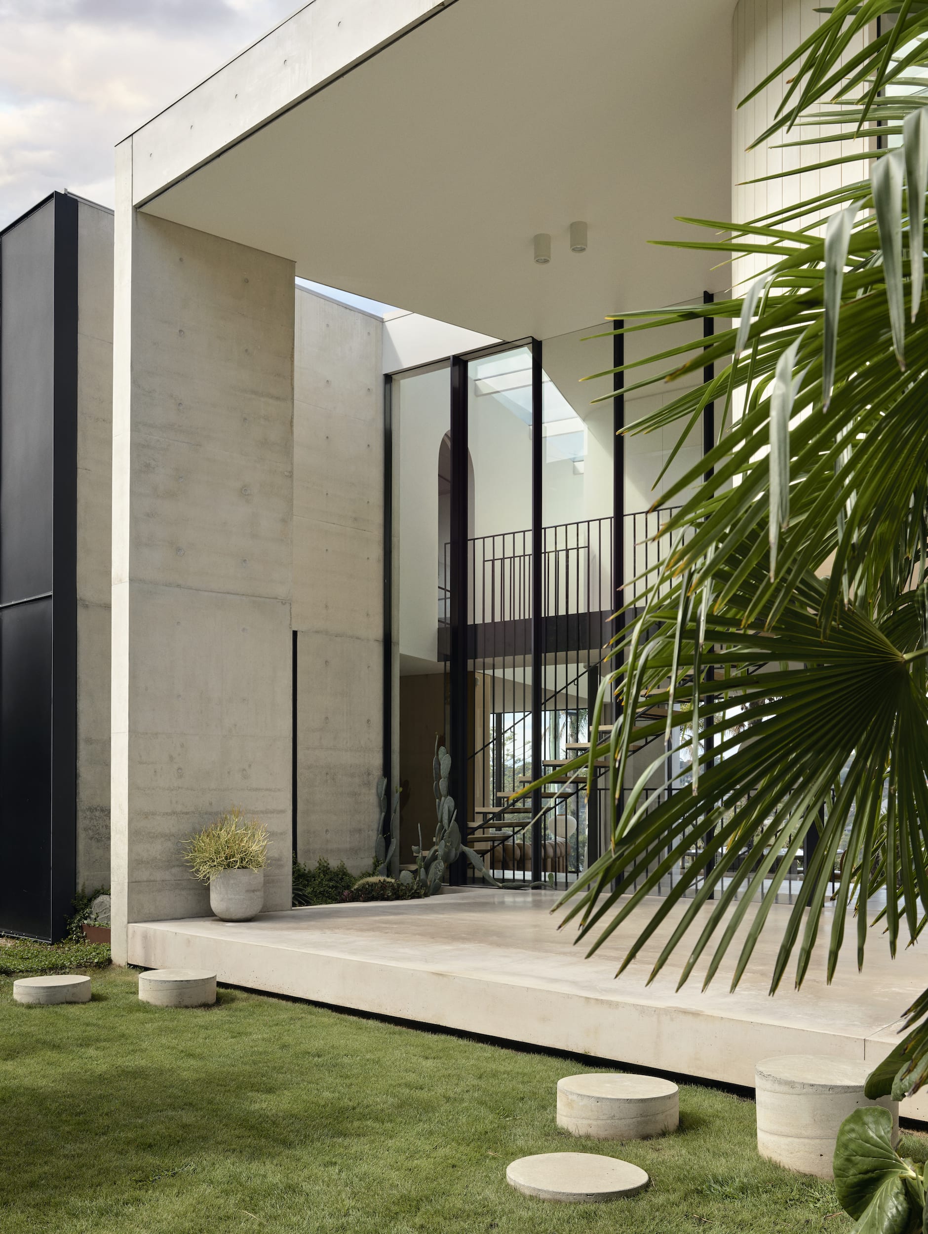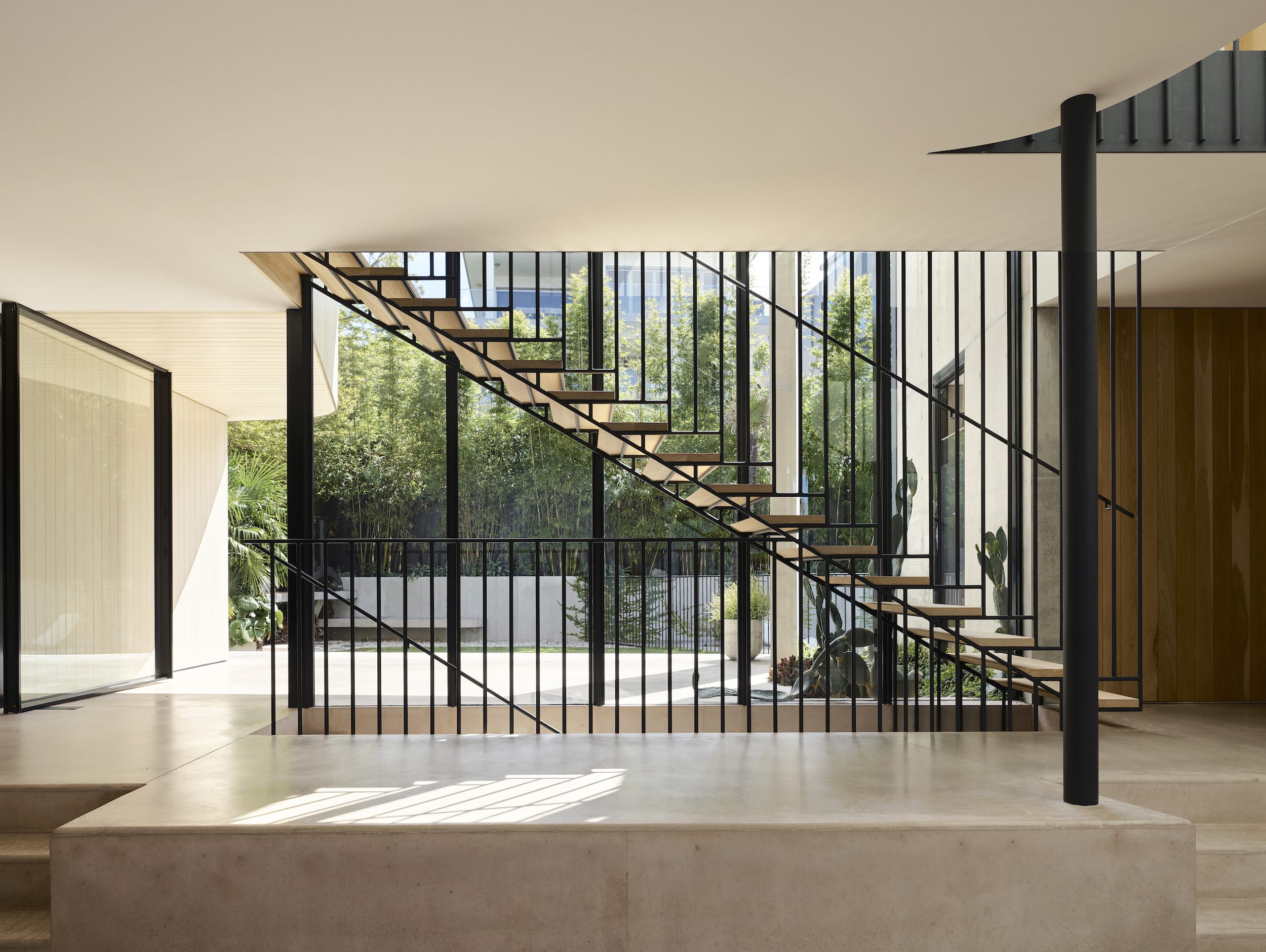 Off form concrete and timber combine as the dominant materials of the home’s palette, with the finer elements typically being detailed in black steel/metal.