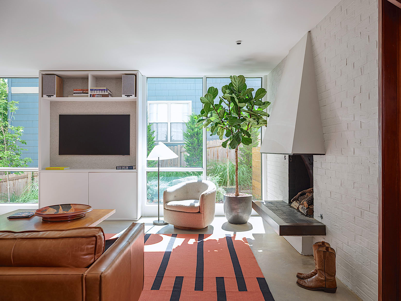 The existing built-in seating and storage were restored while a new large window has been added to provide views to the site.
