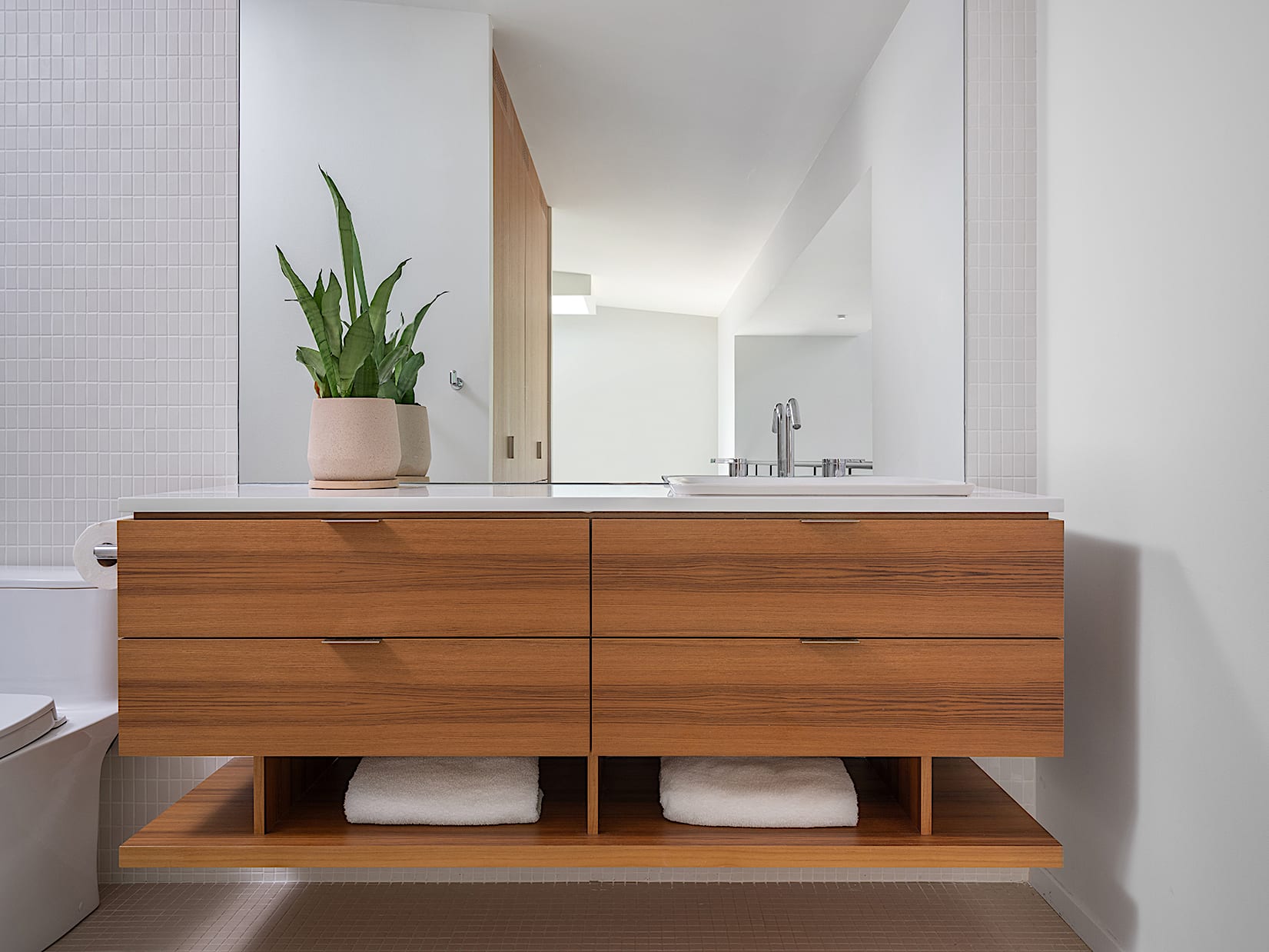The kitchen is treated like mid century furniture with the exception of the appliance wall and pantries.
