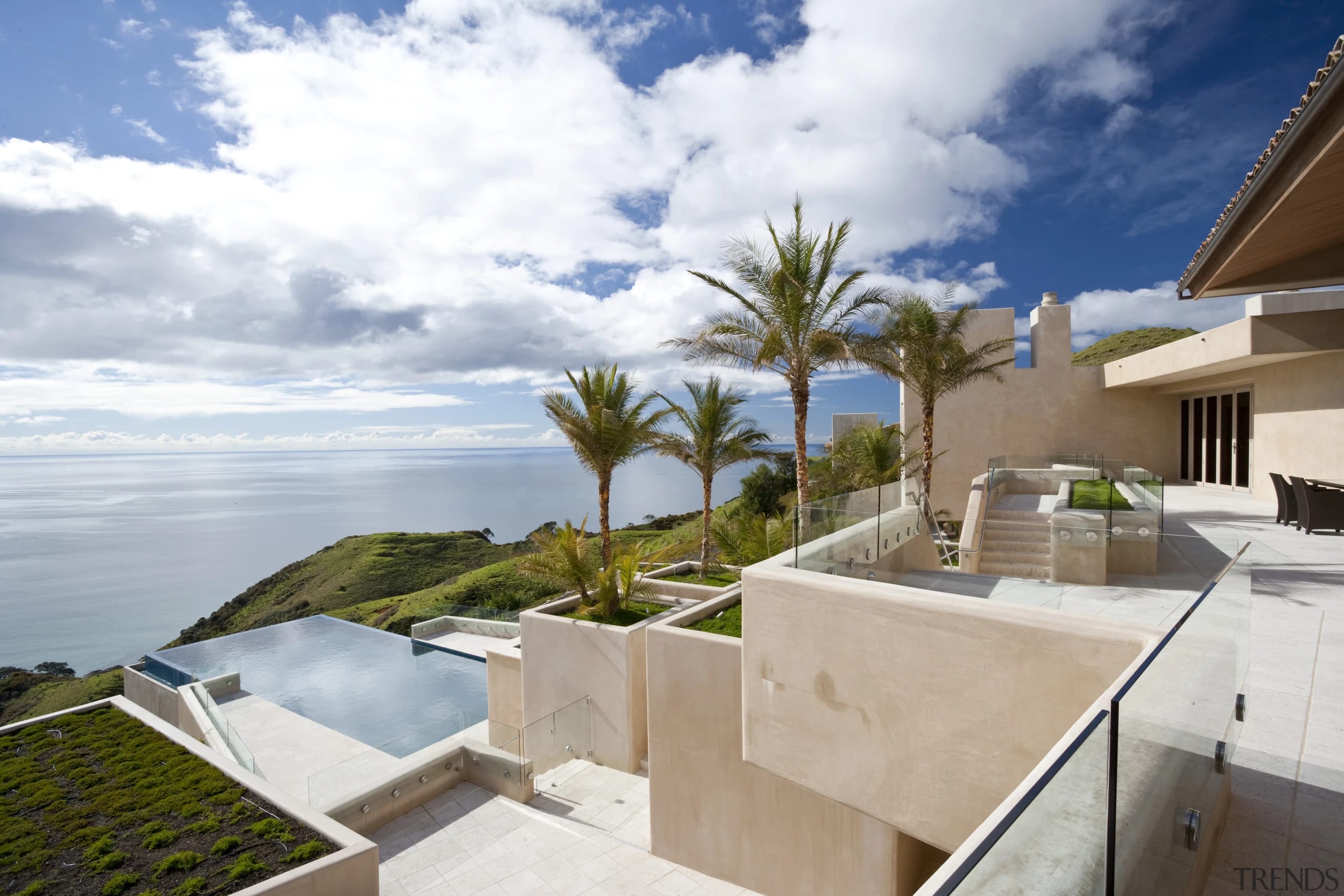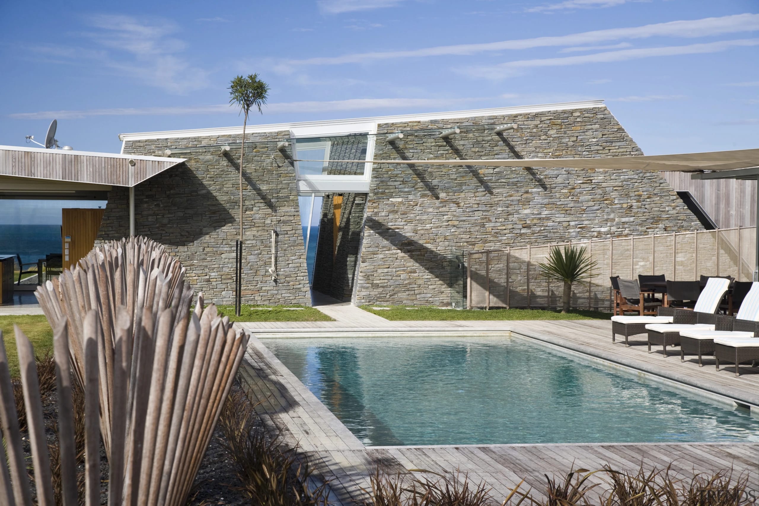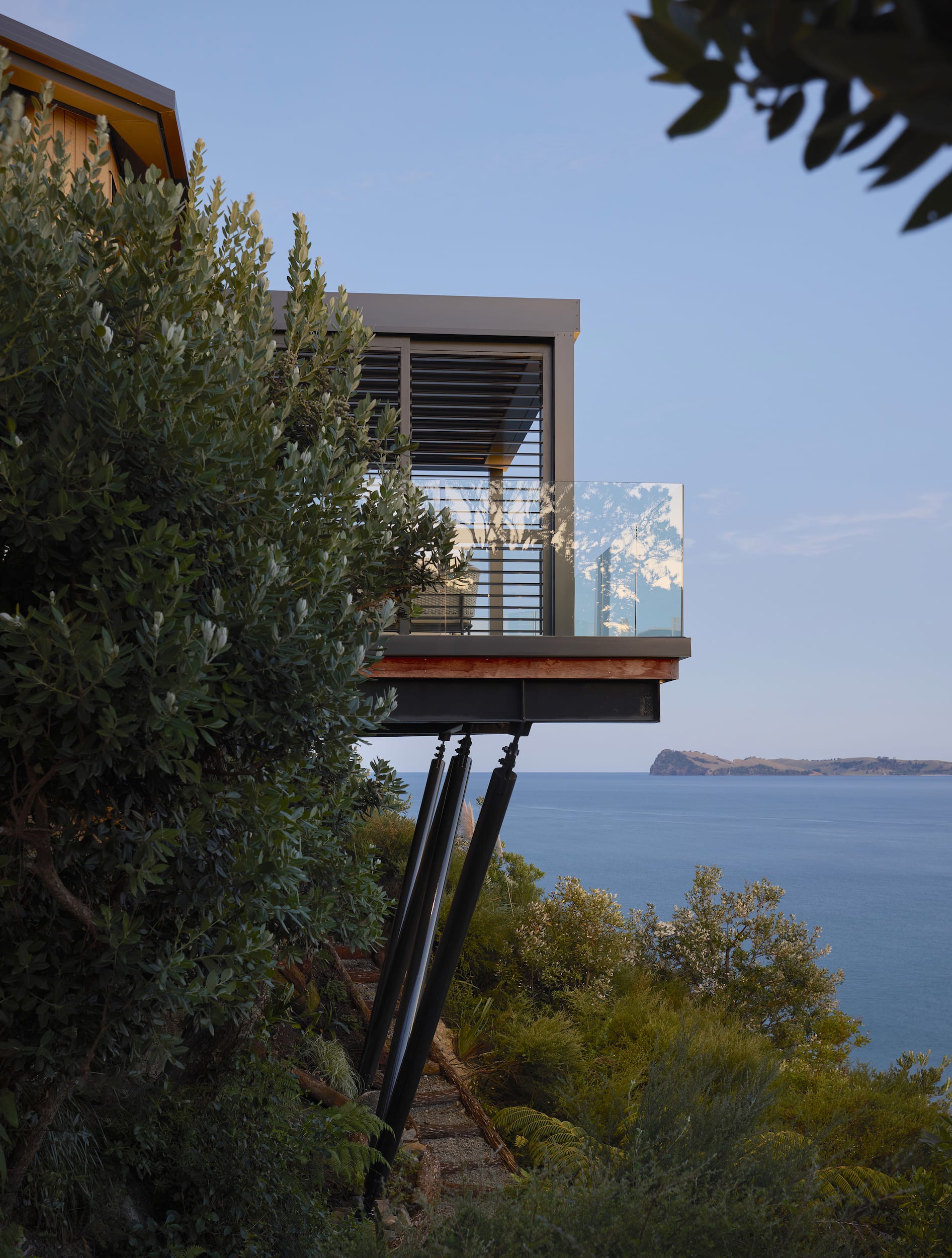 This dramatic Piha beach house is right on point – the seemingly impossible cantilever inspires wonder while the solid floating form itself references wartime coastal bunkers
