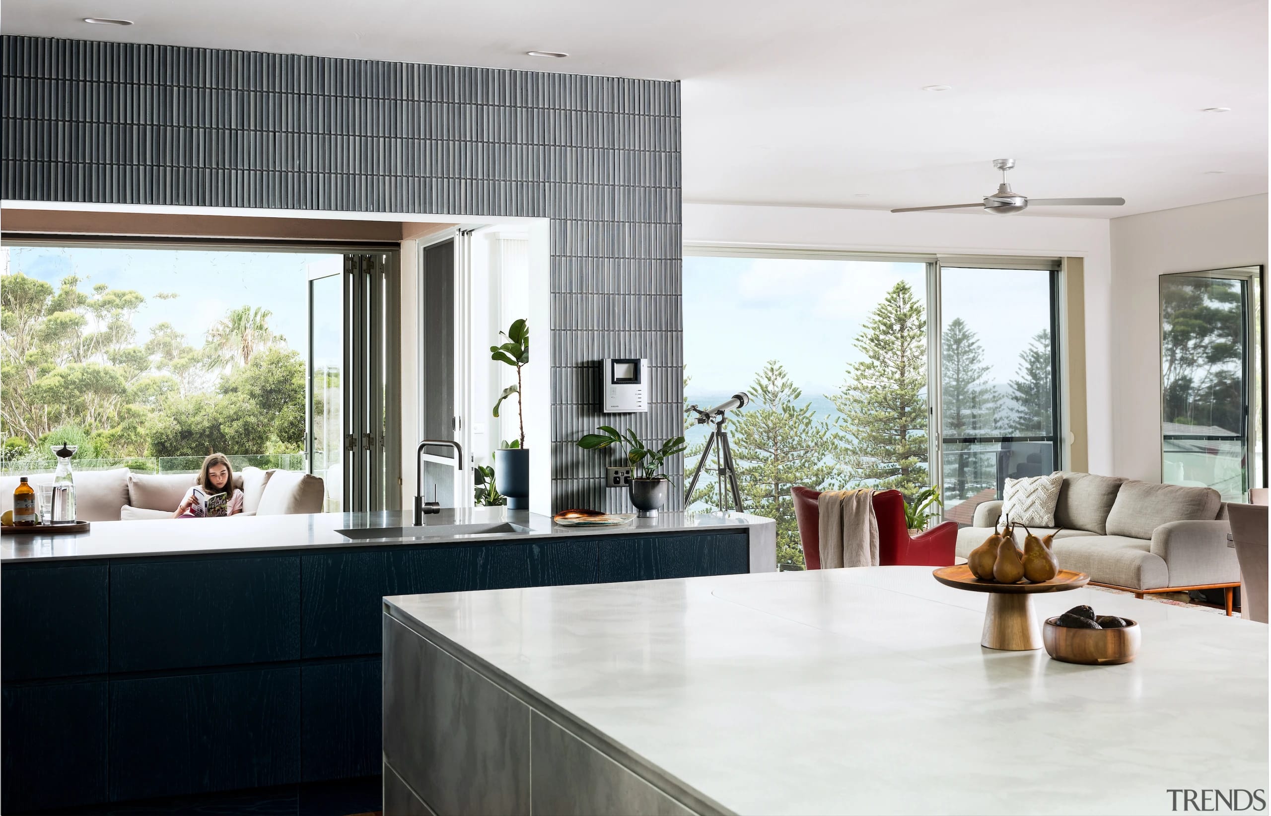 Modern kitchen in contemporary beach house features white lacquered island with waterfall sides, dark American oak cabinets, marble splashback