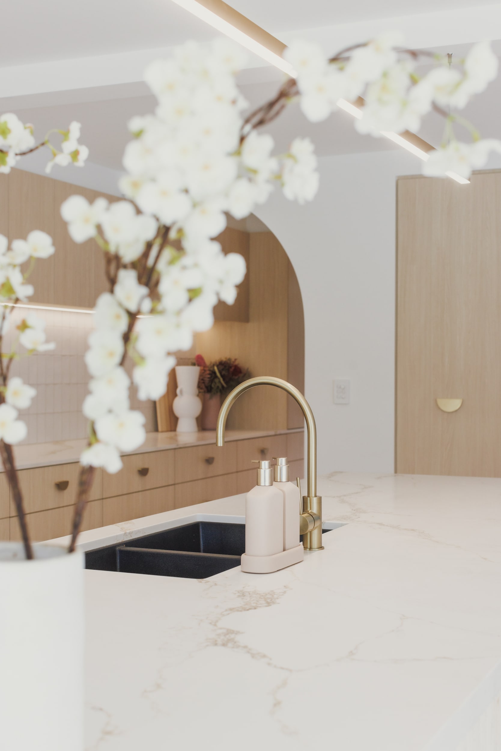 A dark, timber-clad kitchen is reimagined as a bright, timeless hub with Taj Mahal stone, an open scullery, and streamlined storage.