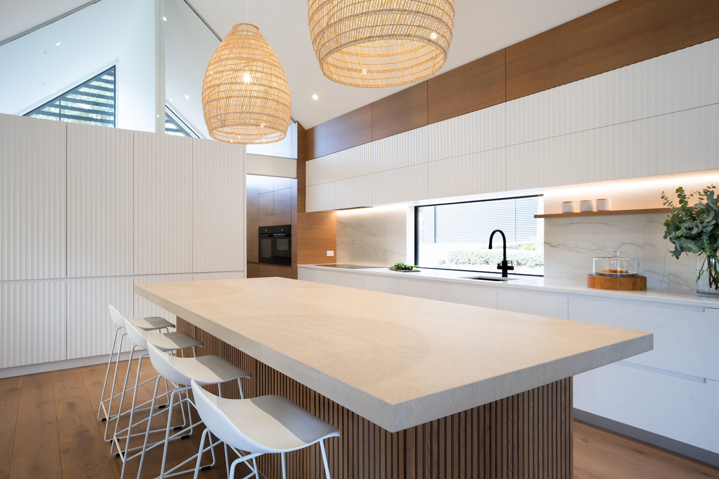 Robust materials, a room-for-two-chefs layout and a stand-out curved island for entertaining all feature in this light-filled, wood accented family kitchen