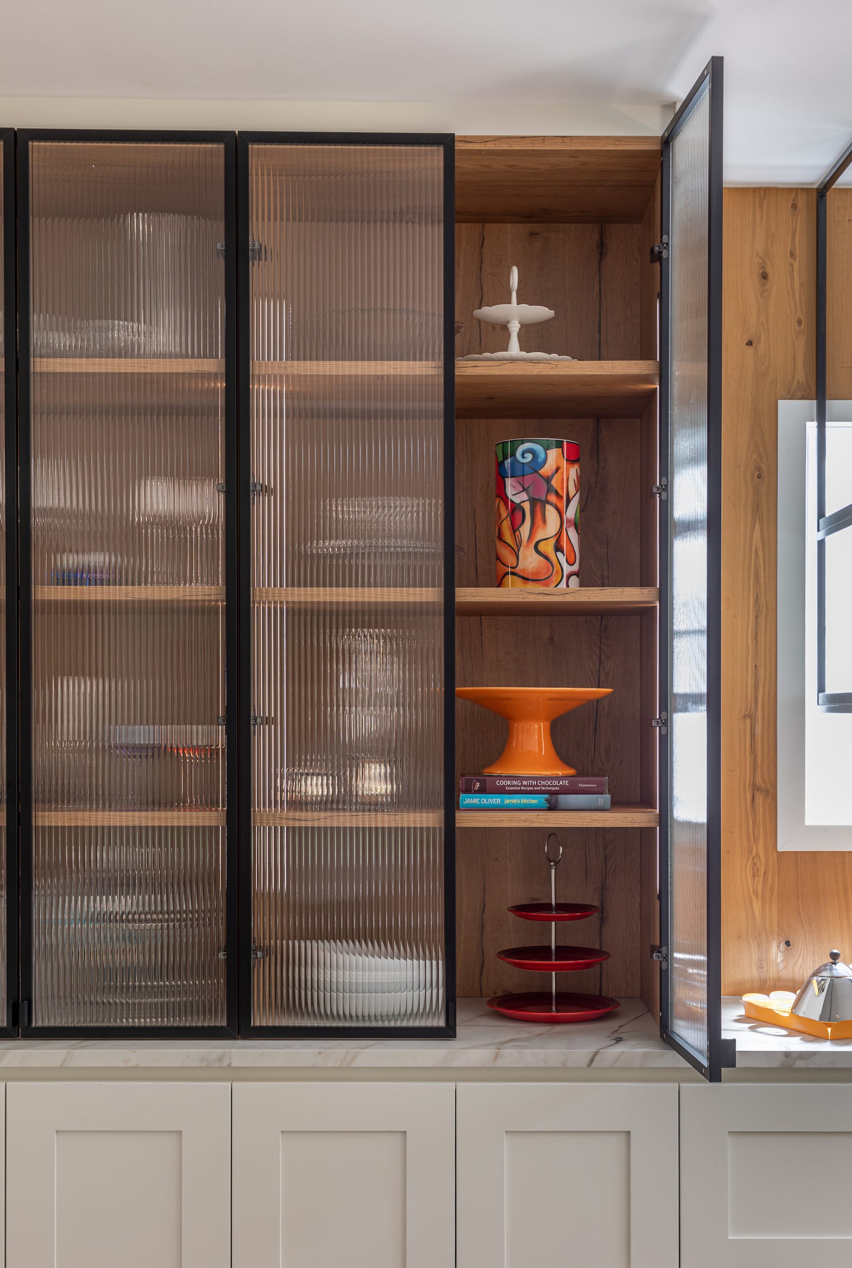The reeded glass ensured that the contents of the cabinets remained hidden, giving the owners peace of mind when it came to organisation.