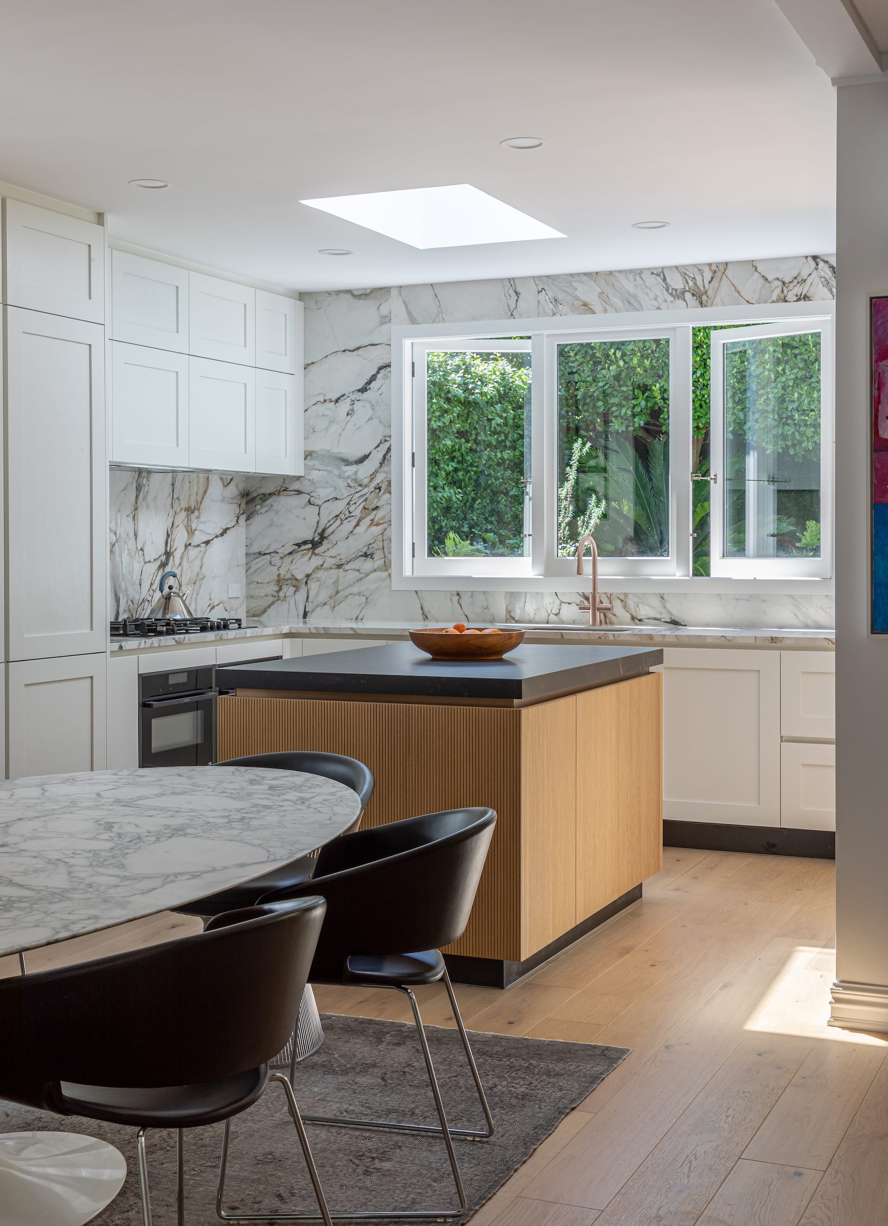 The result is a sophisticated, functional kitchen space perfect for entertaining, while seamlessly blending with the rest of the home’s character.