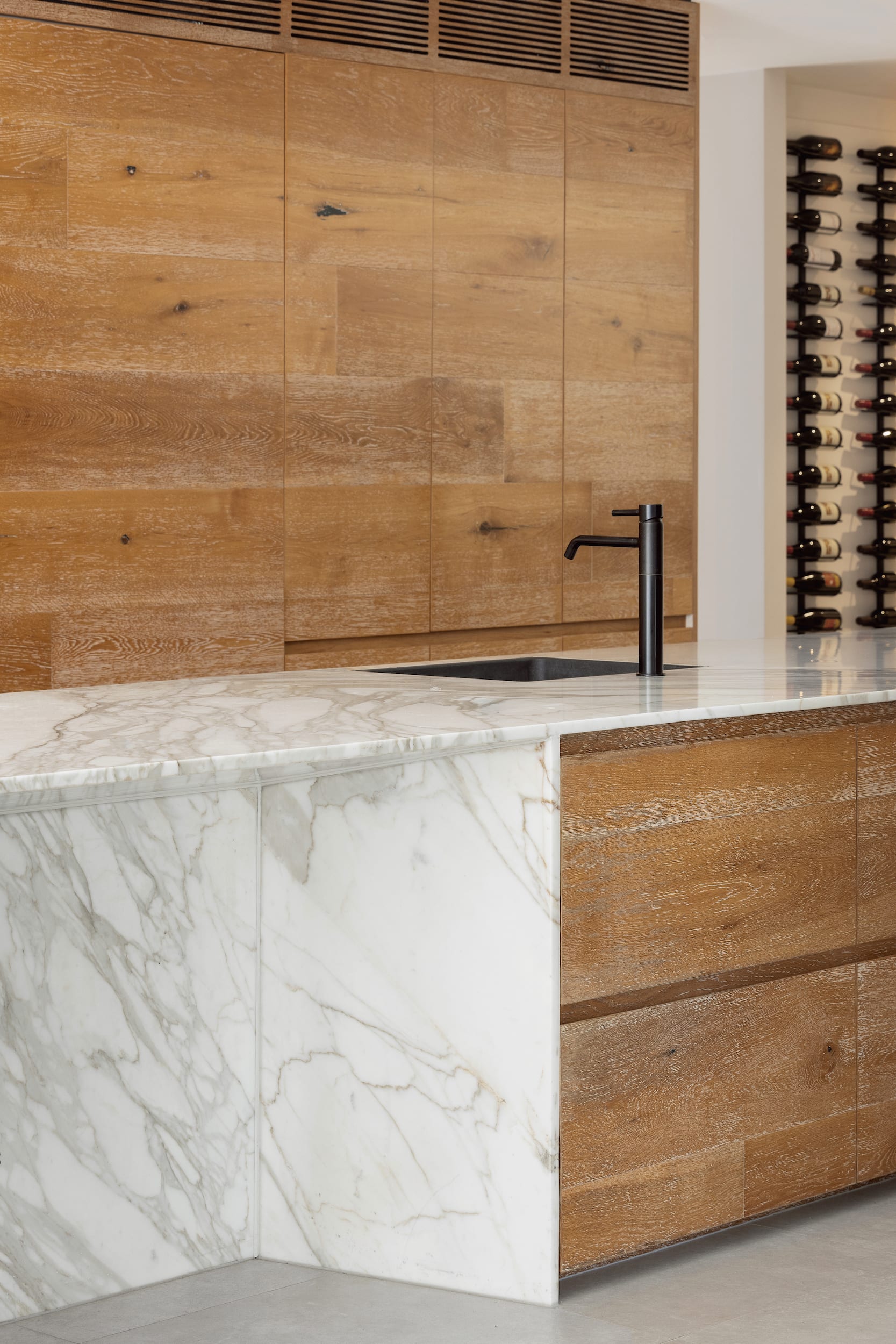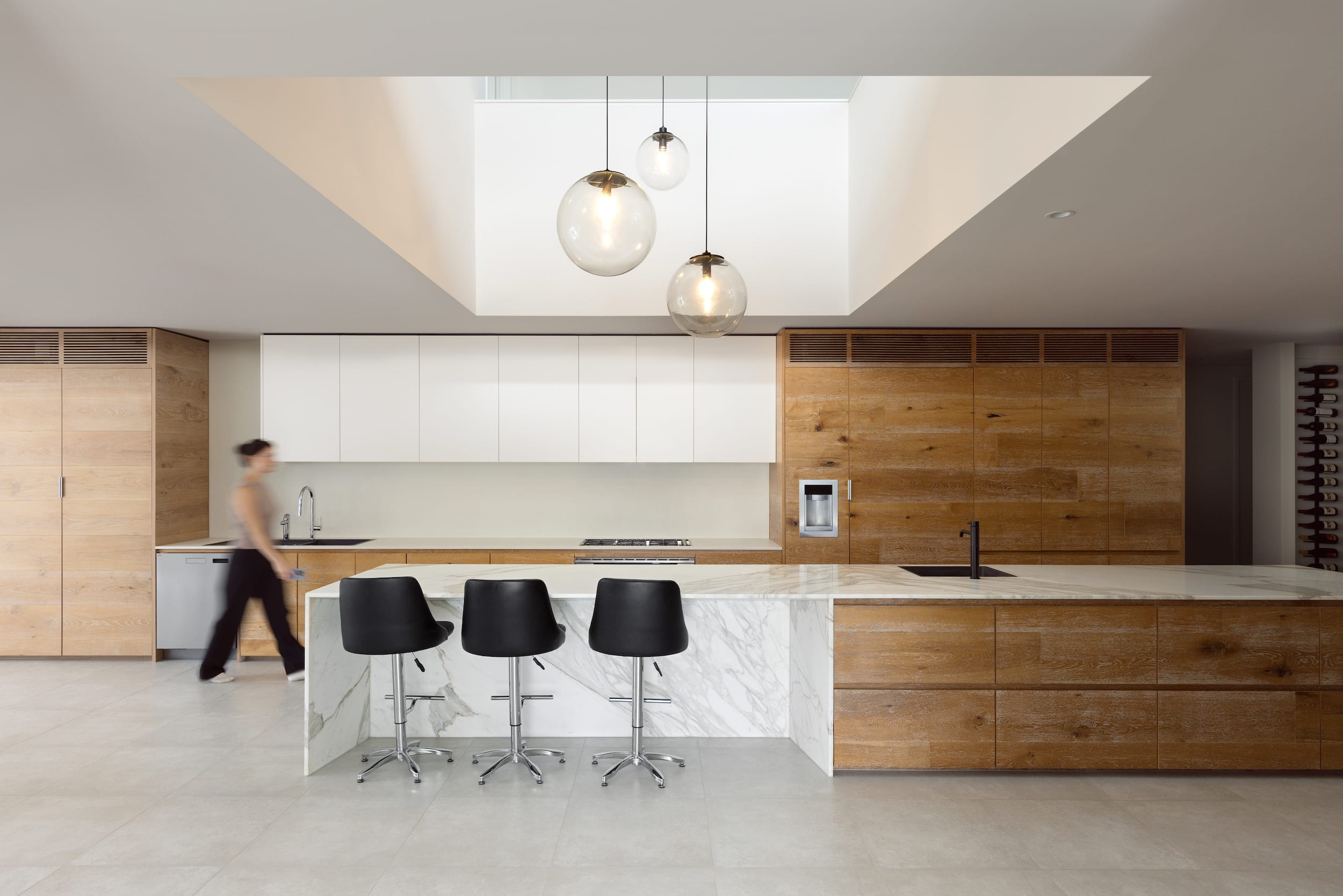 Anchored by a 5.6m-long Calacatta marble island bench, the space serves as both a culinary workspace and a social hub.