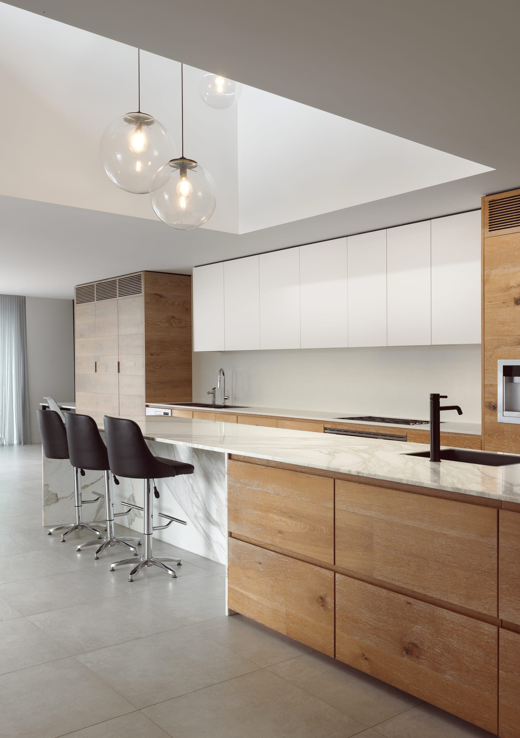 This contemporary kitchen seamlessly integrating luxury materials with functional elegance.