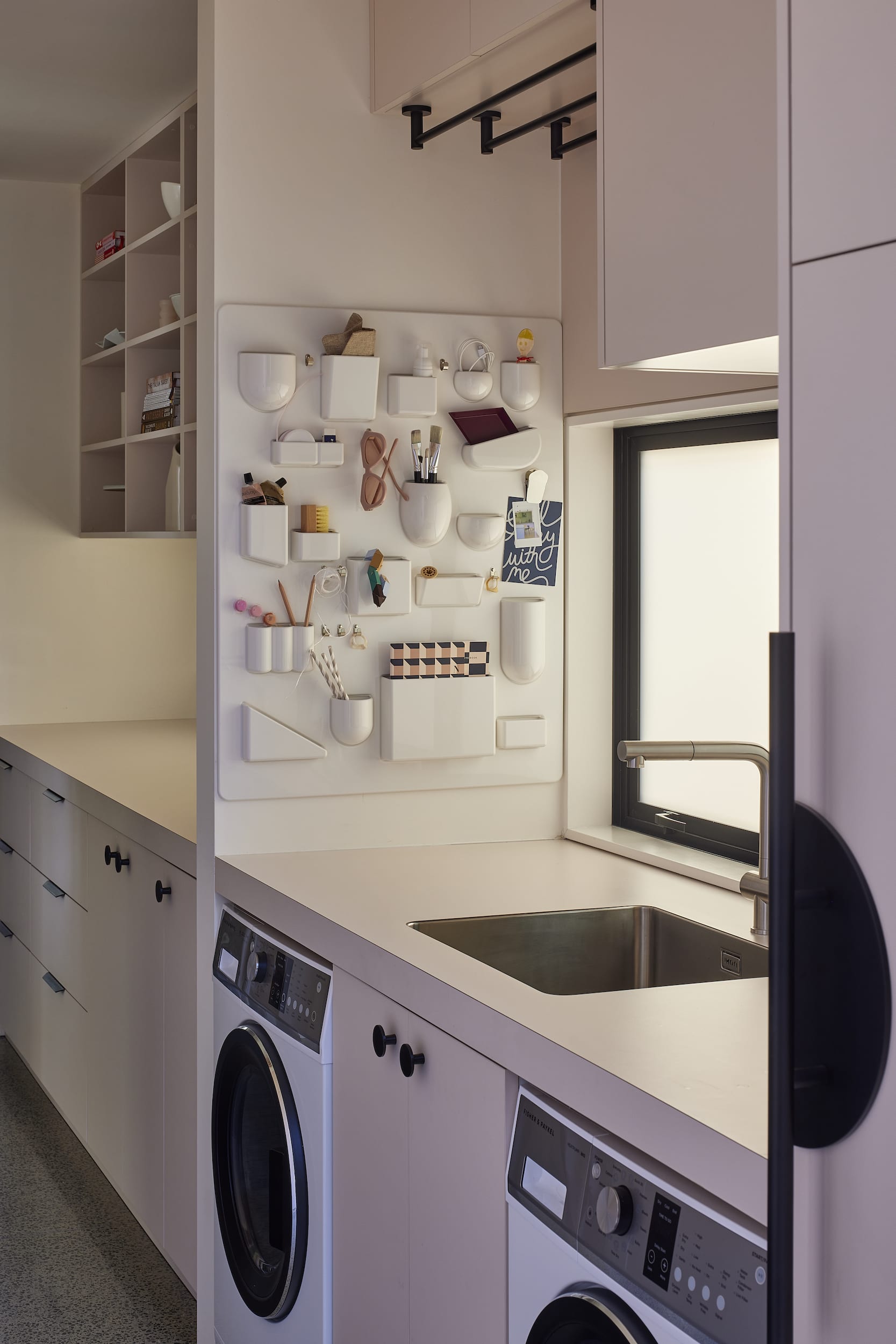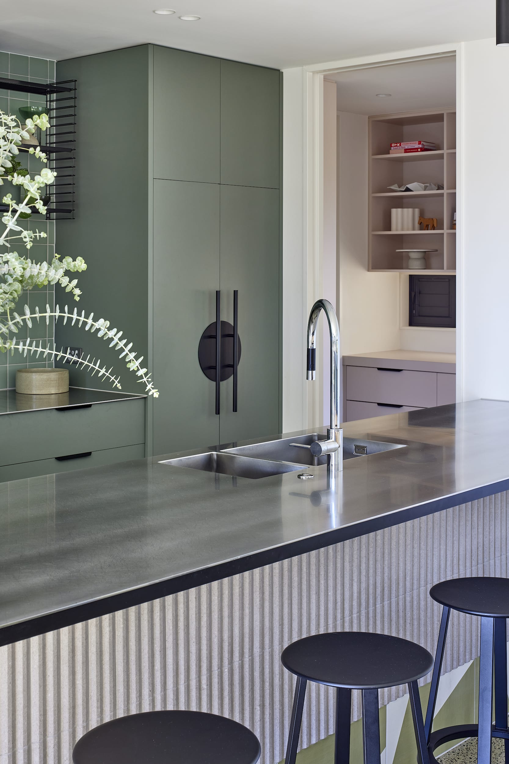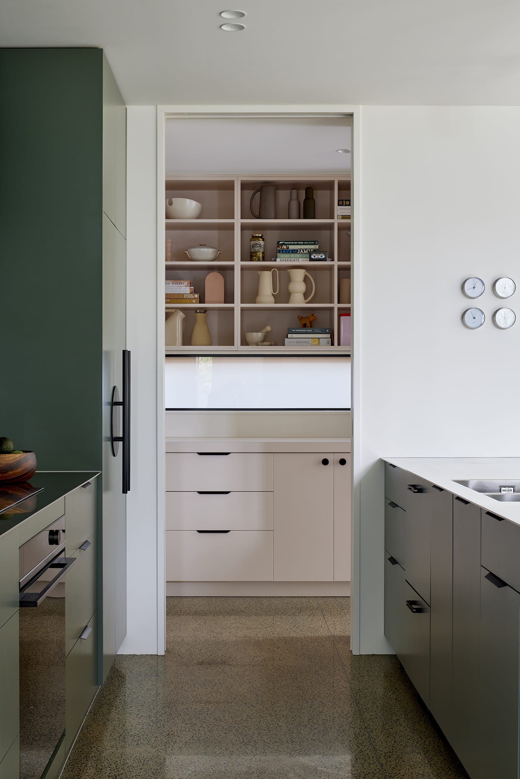 ArchitectKate Rogan and Eva Nash, Rogan Nash Architects | CabinetryKitchen – Laminex Melteca 'Green Slate'; scullery – Laminex Melteca 'Porcelain Blush' |