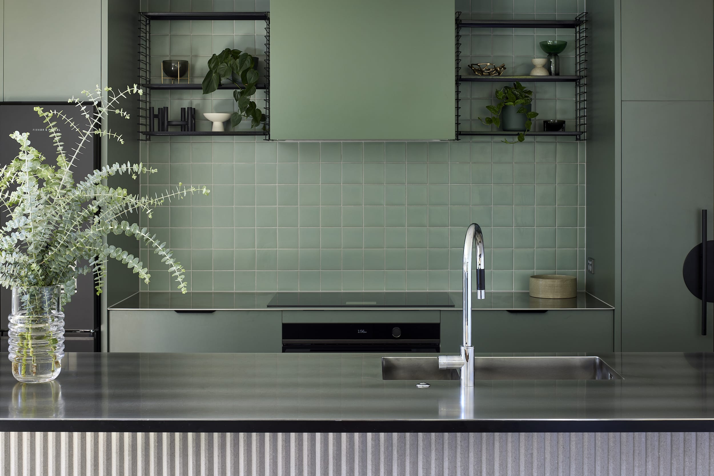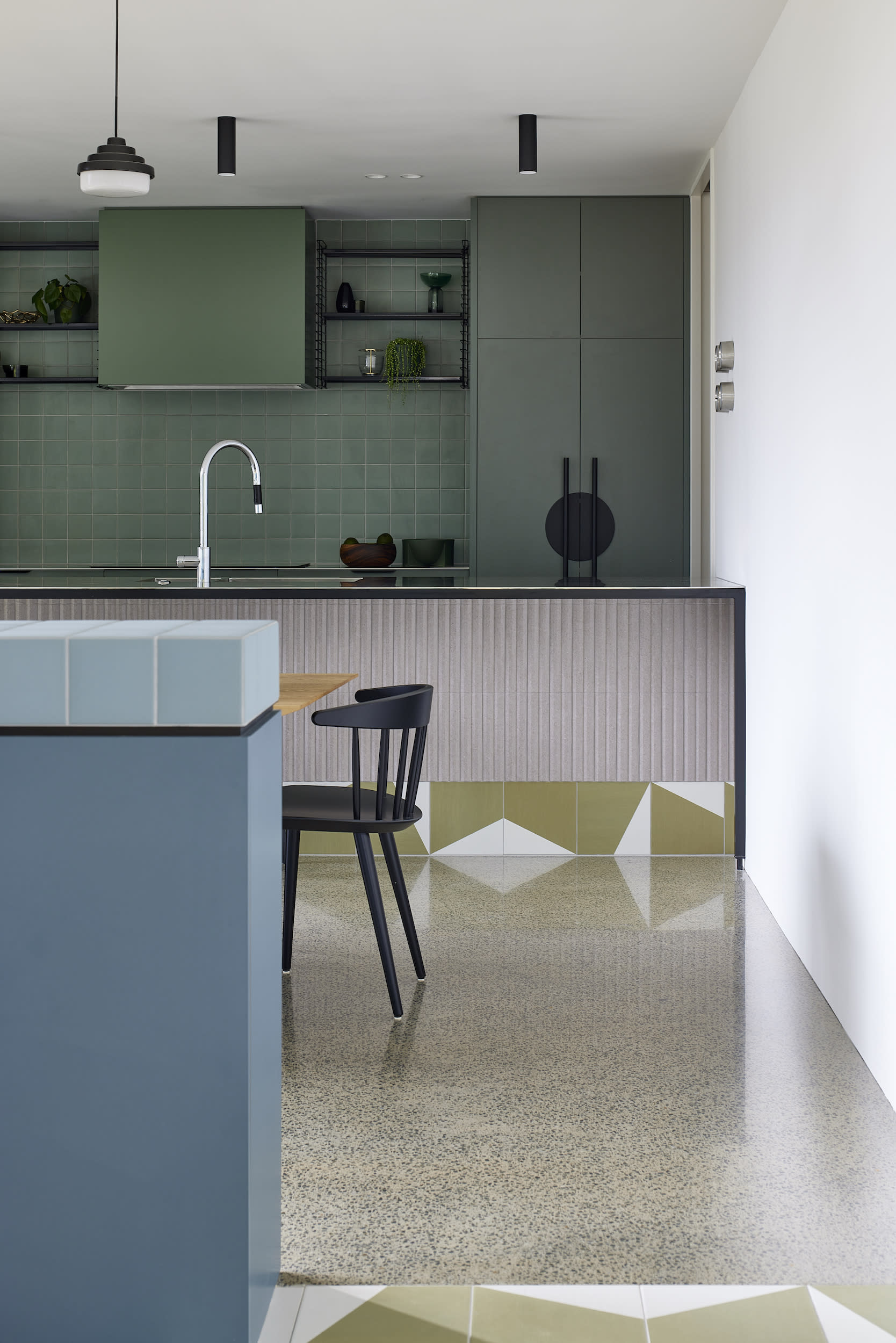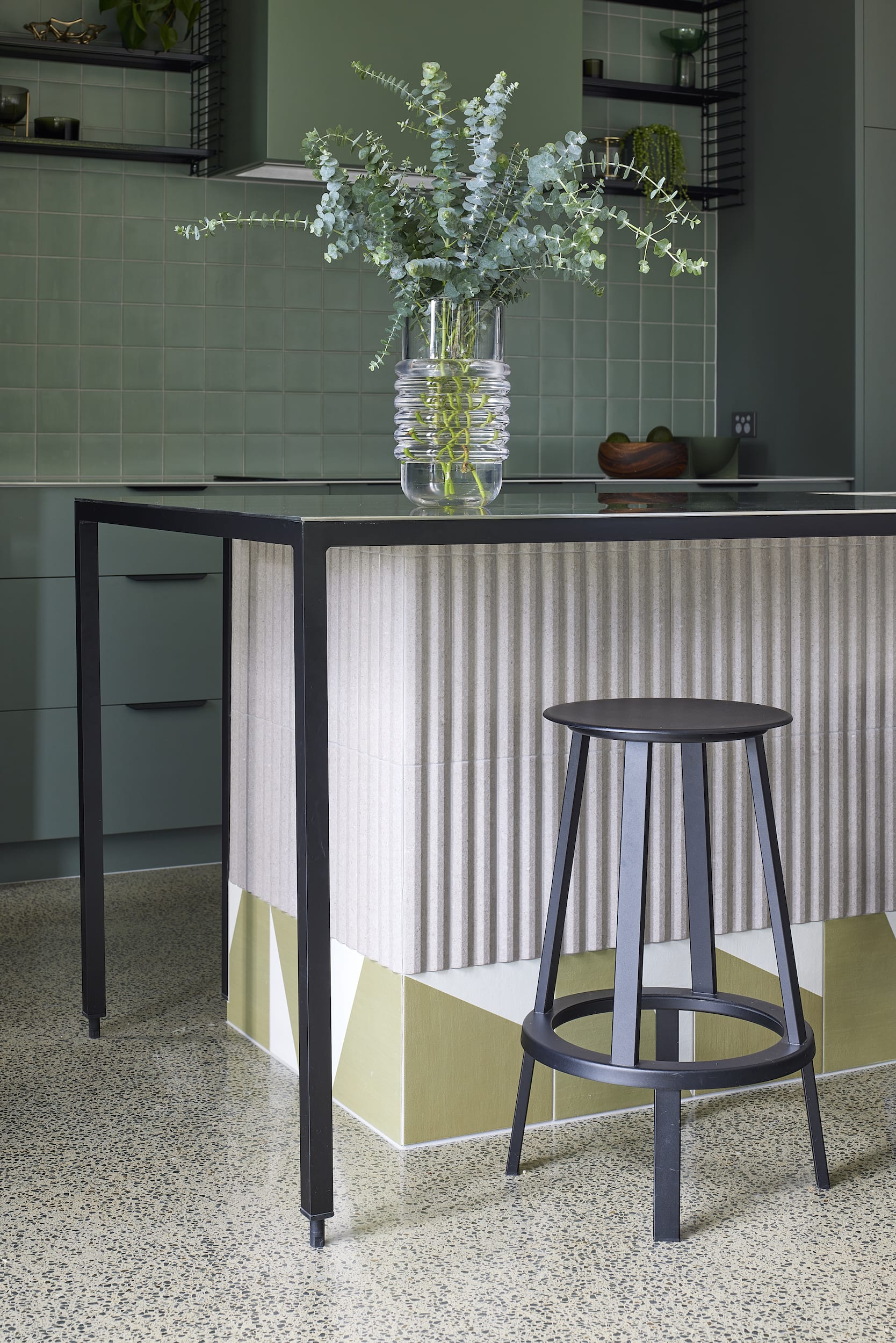 Cabinetry hardwareBankston Super Moon handles and Archant | Island bench tilesWow (stripes) in greige; Mutina (puzzle) in olive – both from European Ceramics |