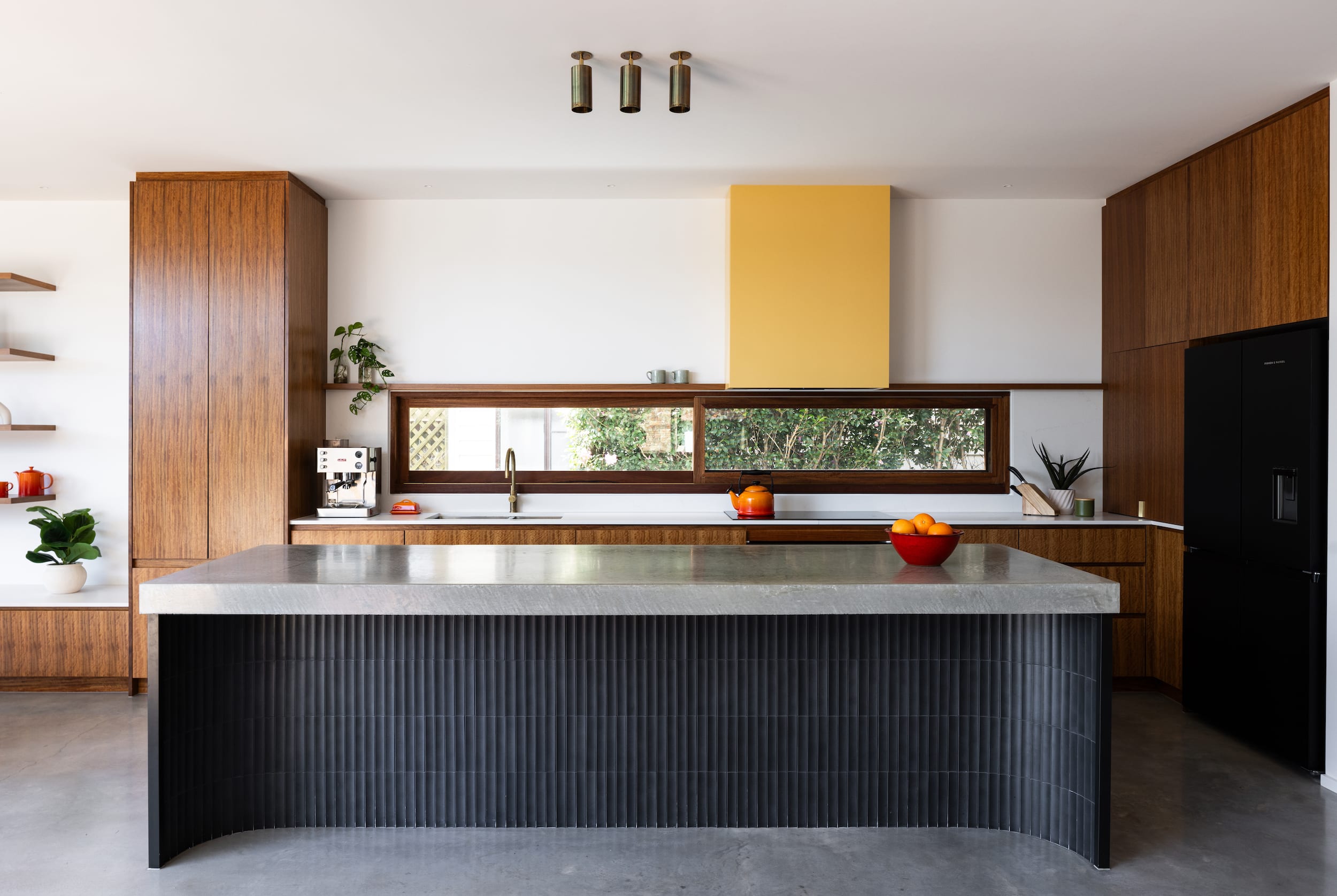 The rangehood’s colour playfully references the owners’ childhood kitchen, adding a nostalgic yet contemporary touch.