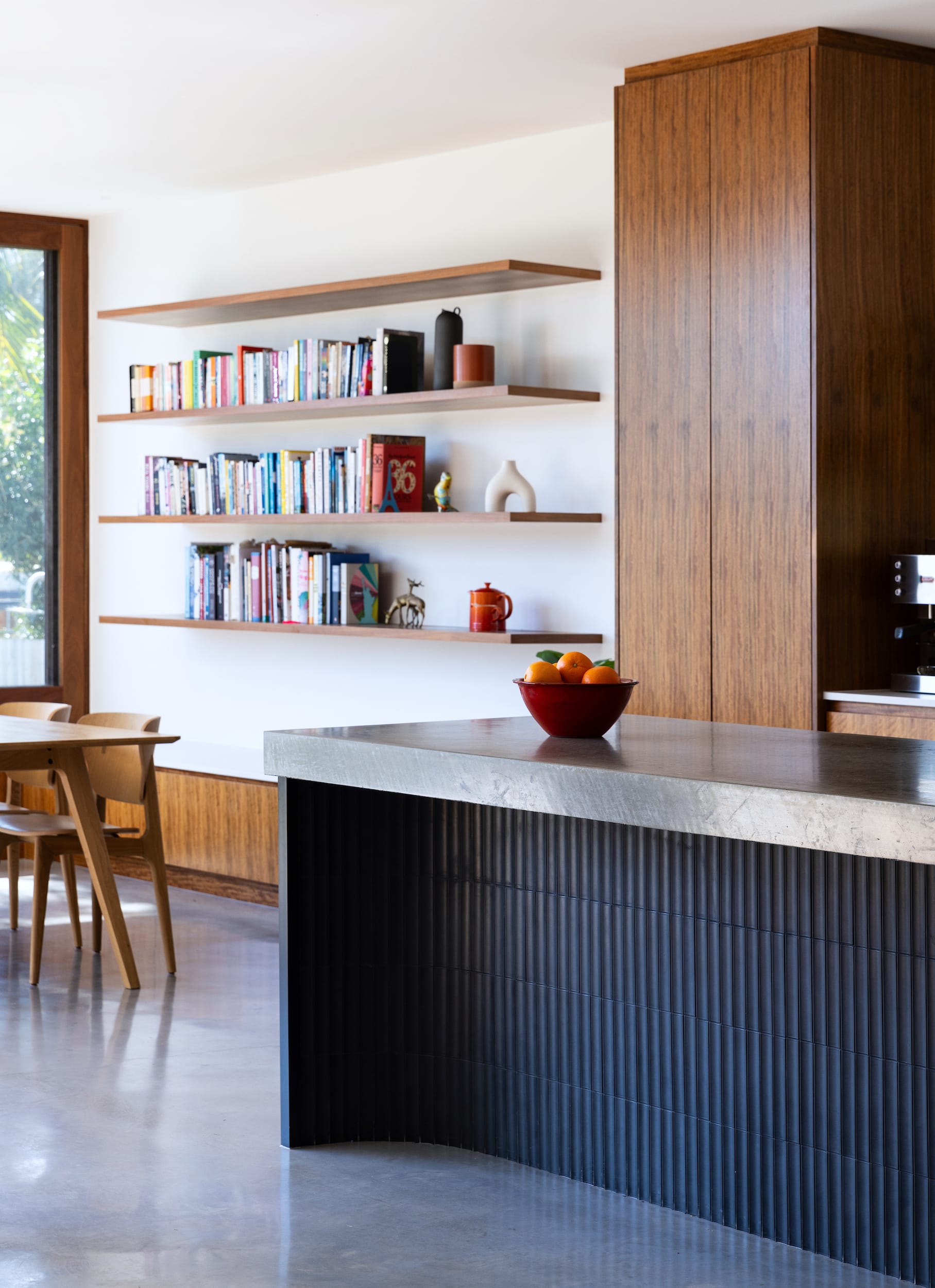 Oversized glass doors open onto the north-facing rear yard, allowing visibility of the sky and ensuring a strong visual and functional link to the outdoor smoker – an element that runs throughout the weekend and needs easy monitoring from the kitchen and living areas.