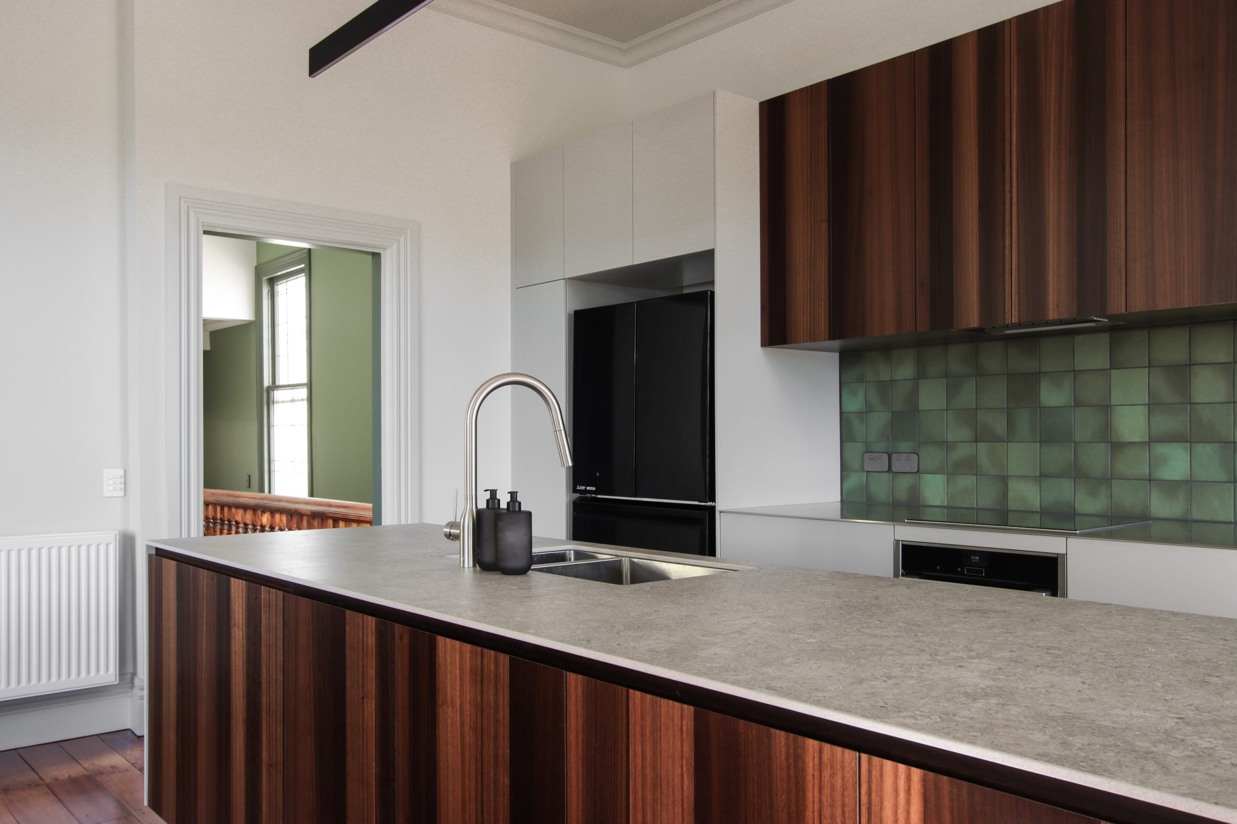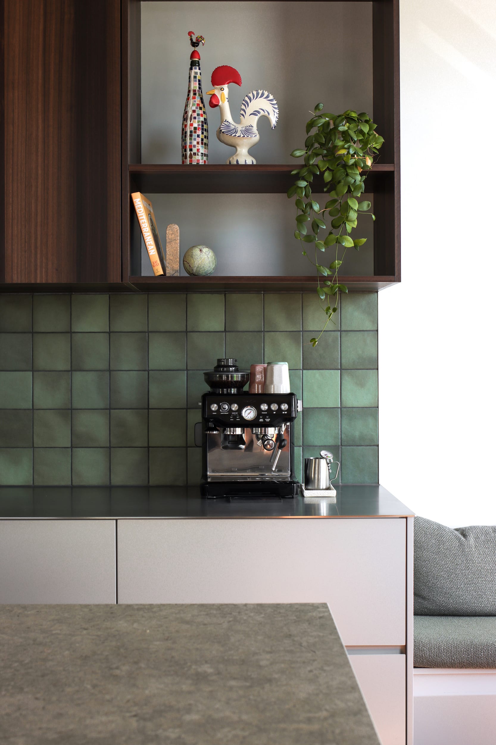 A key material selection was the green tile splashback, chosen because its colour directly reflects the deep green hues used in the adjacent hallway, stairwell, and entryway.