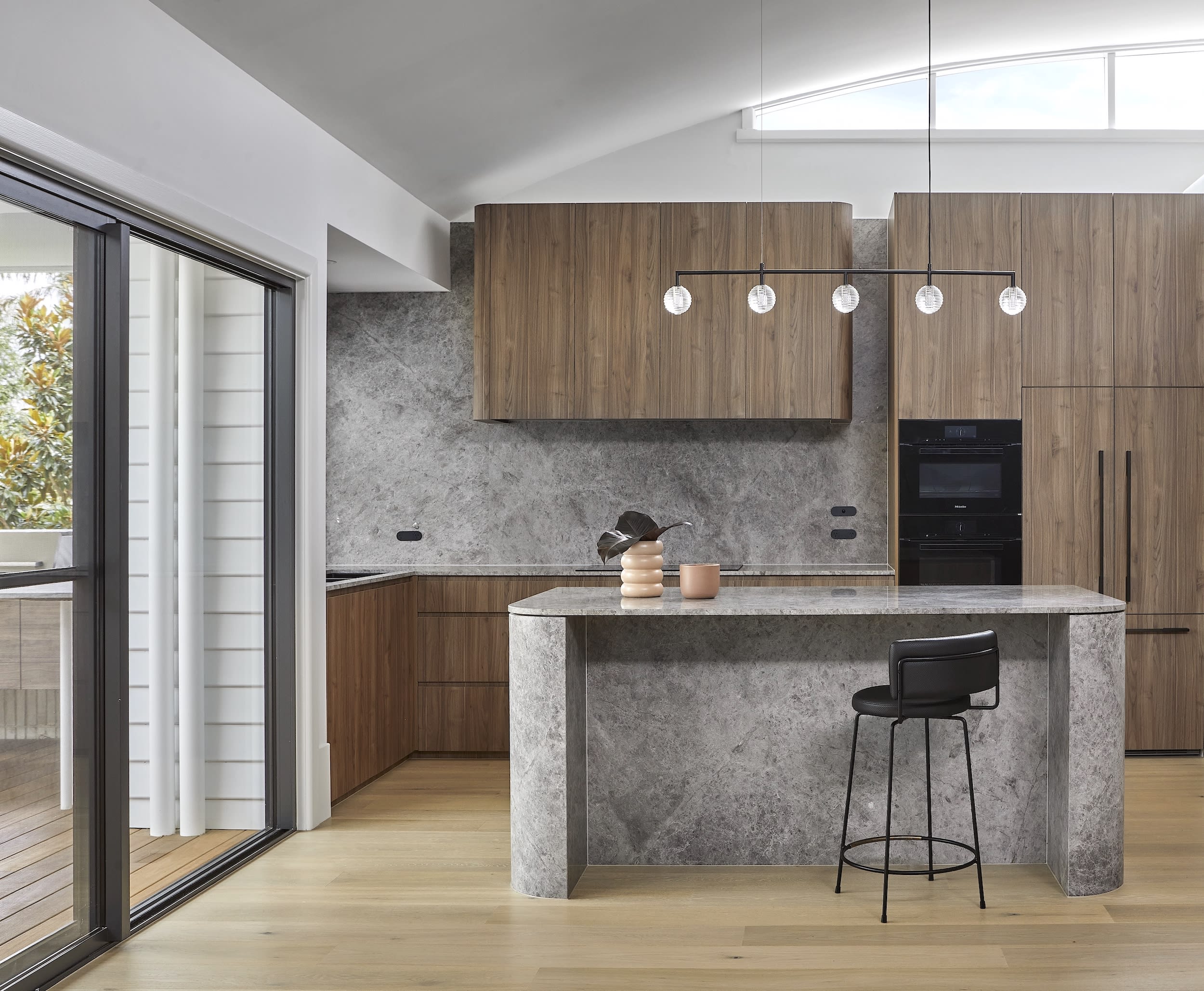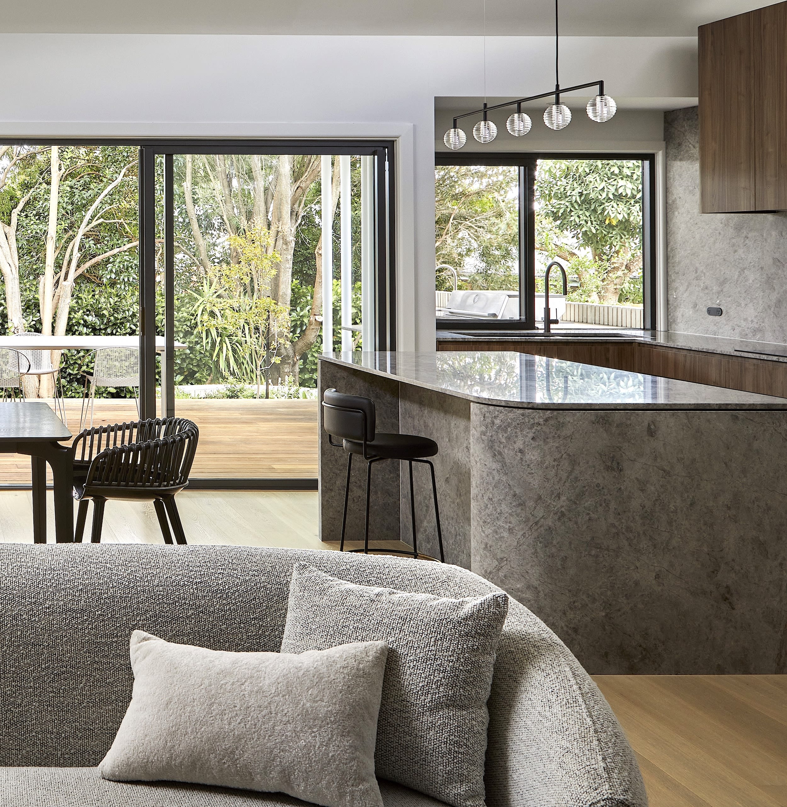 Another key feature was integrating the external materials of clay brick and weatherboard into the kitchens – to achieve this, curved brickwork detail hugs the outdoor kitchen and splashback, while this radius detail follows through into the enclosed indoor kitchen joinery and stone detail.