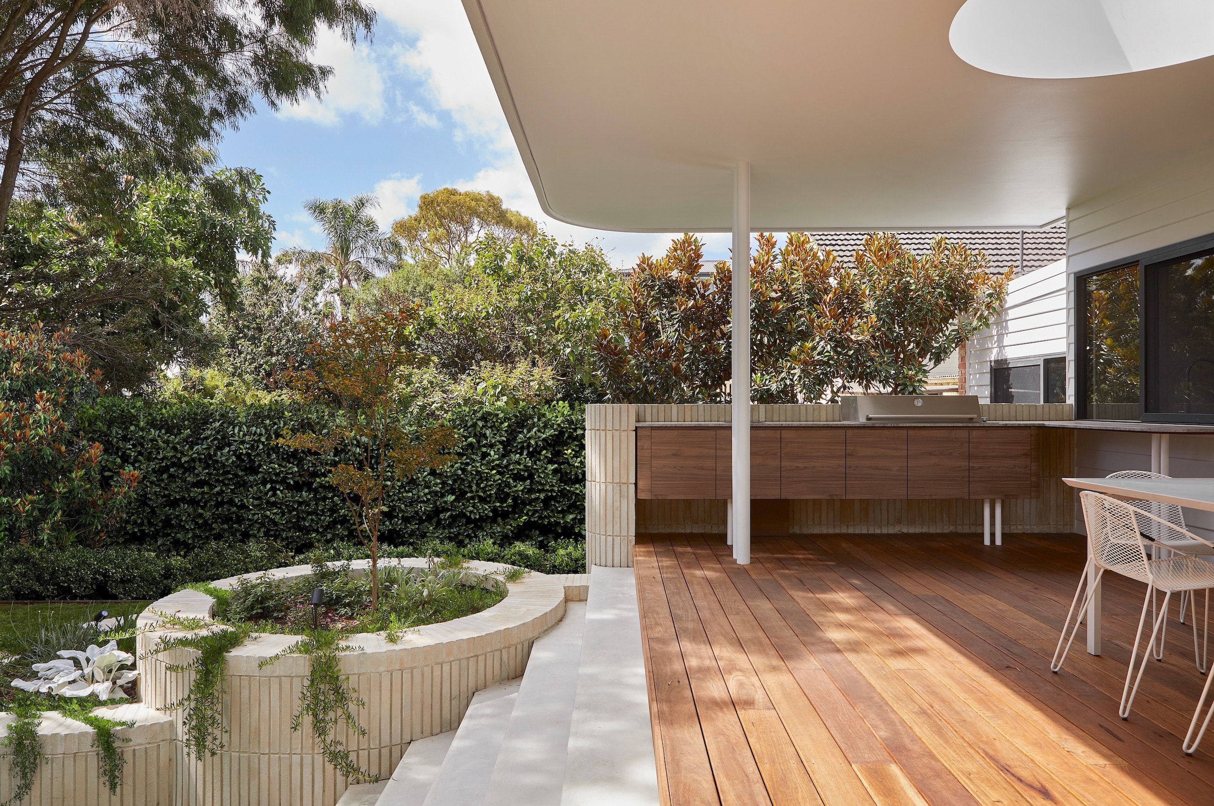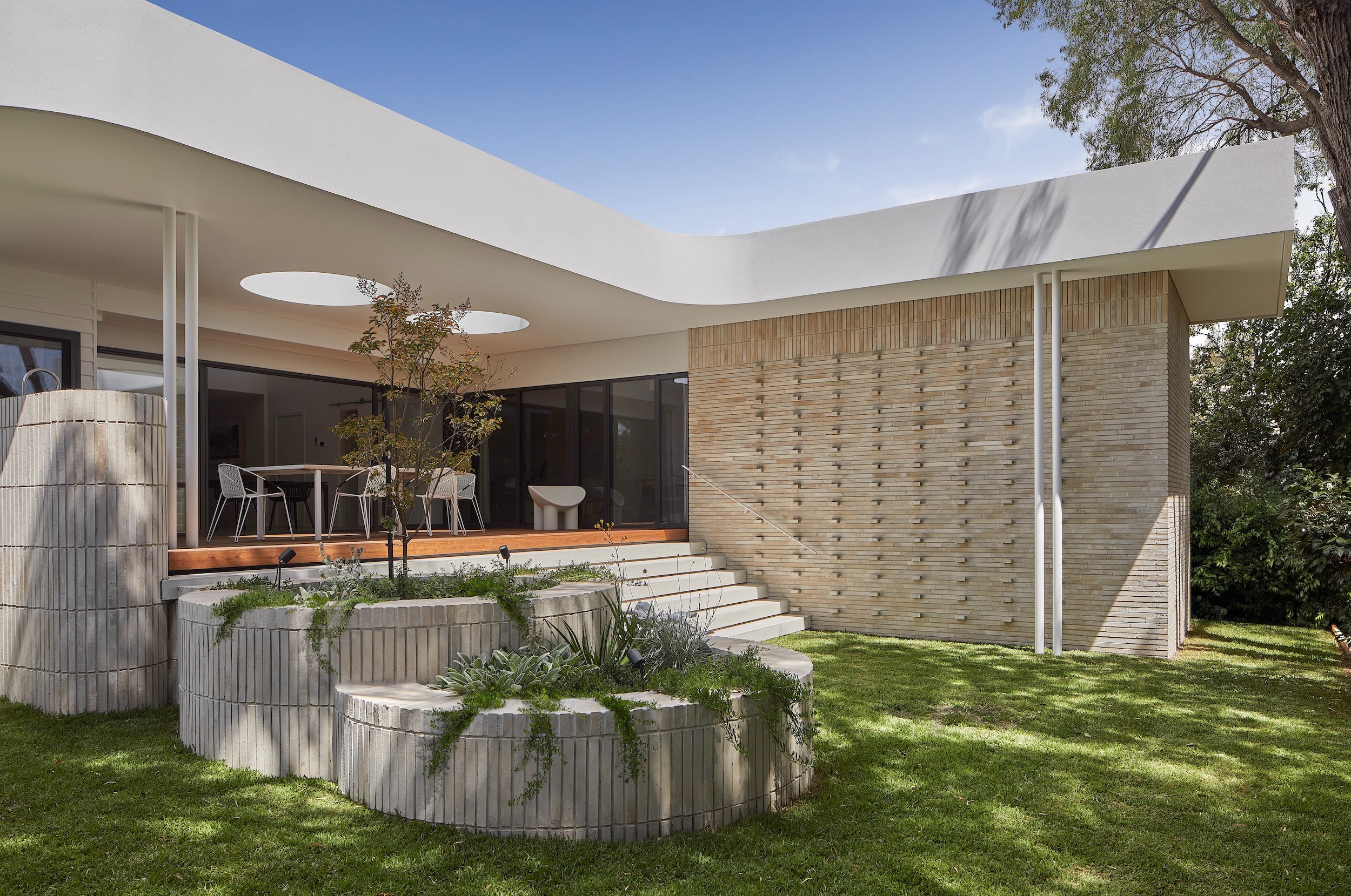 Handcrafted clay bricks with corbelling detail to the new addition and planters add interest and contrast to the existing weatherboard home.