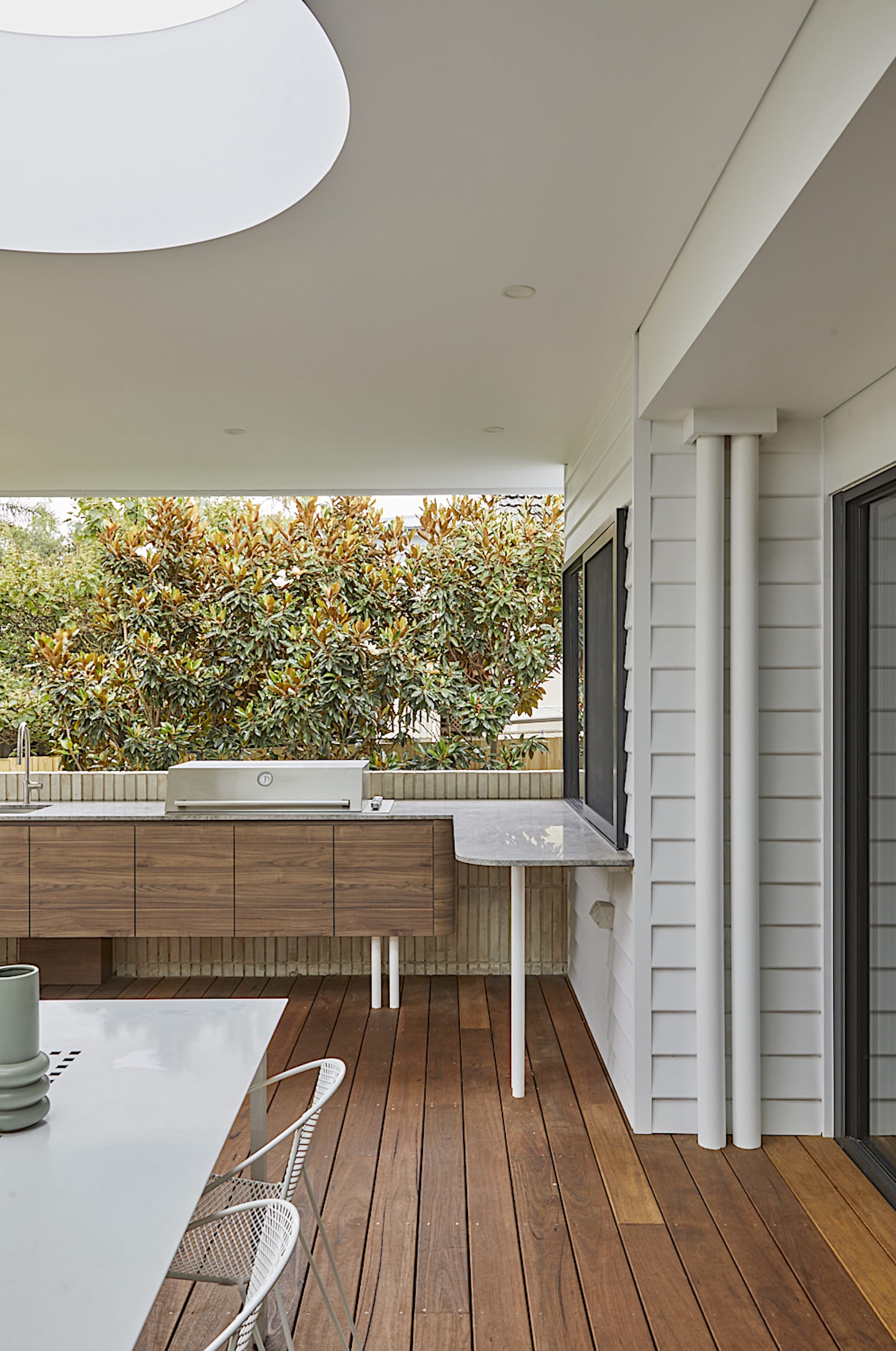 Both internal and external kitchens were treated as a single core idea, although separated between indoors and out – a servery window between the two kitchen spaces achieves this idea of connection while still retaining separation between the two.
