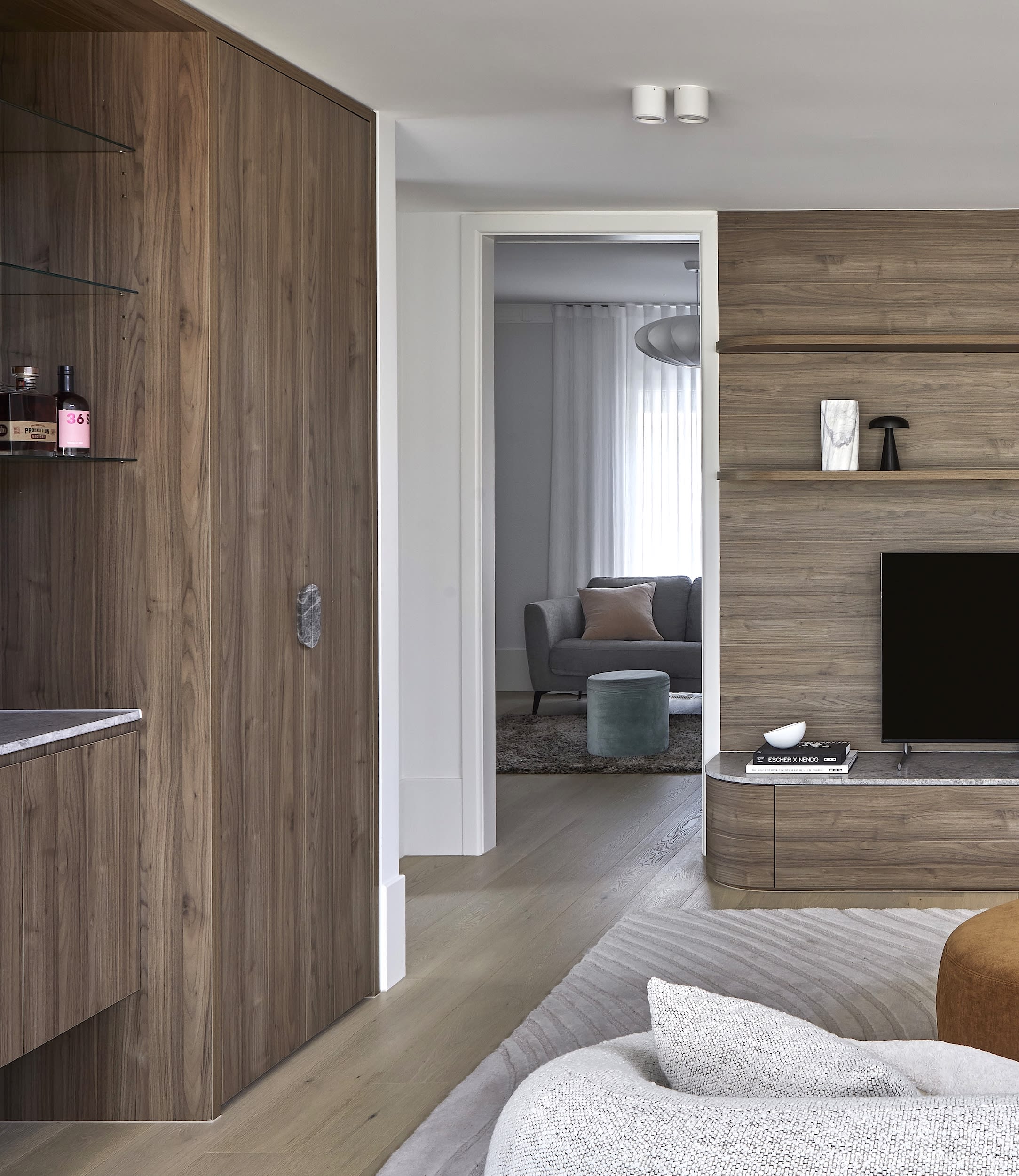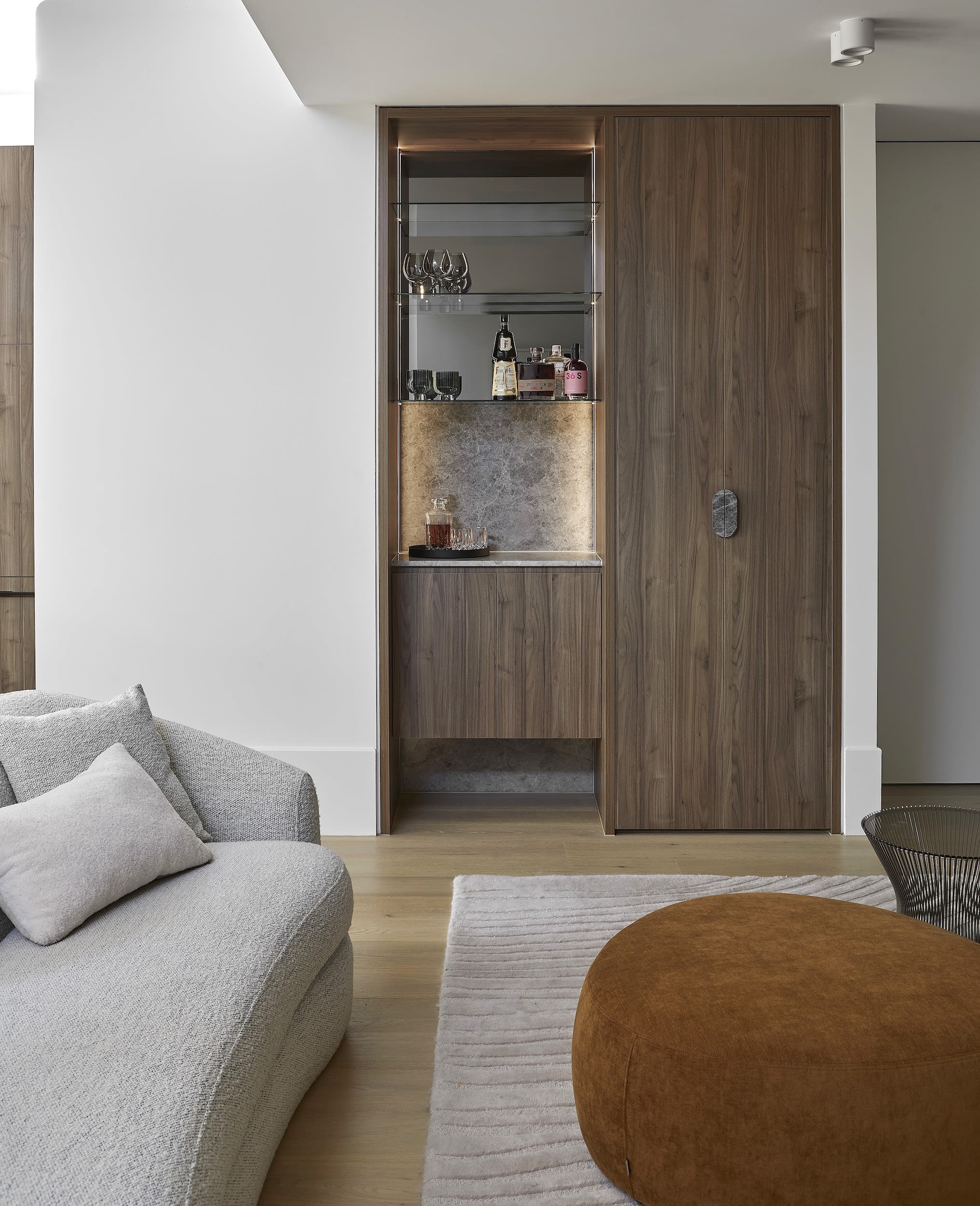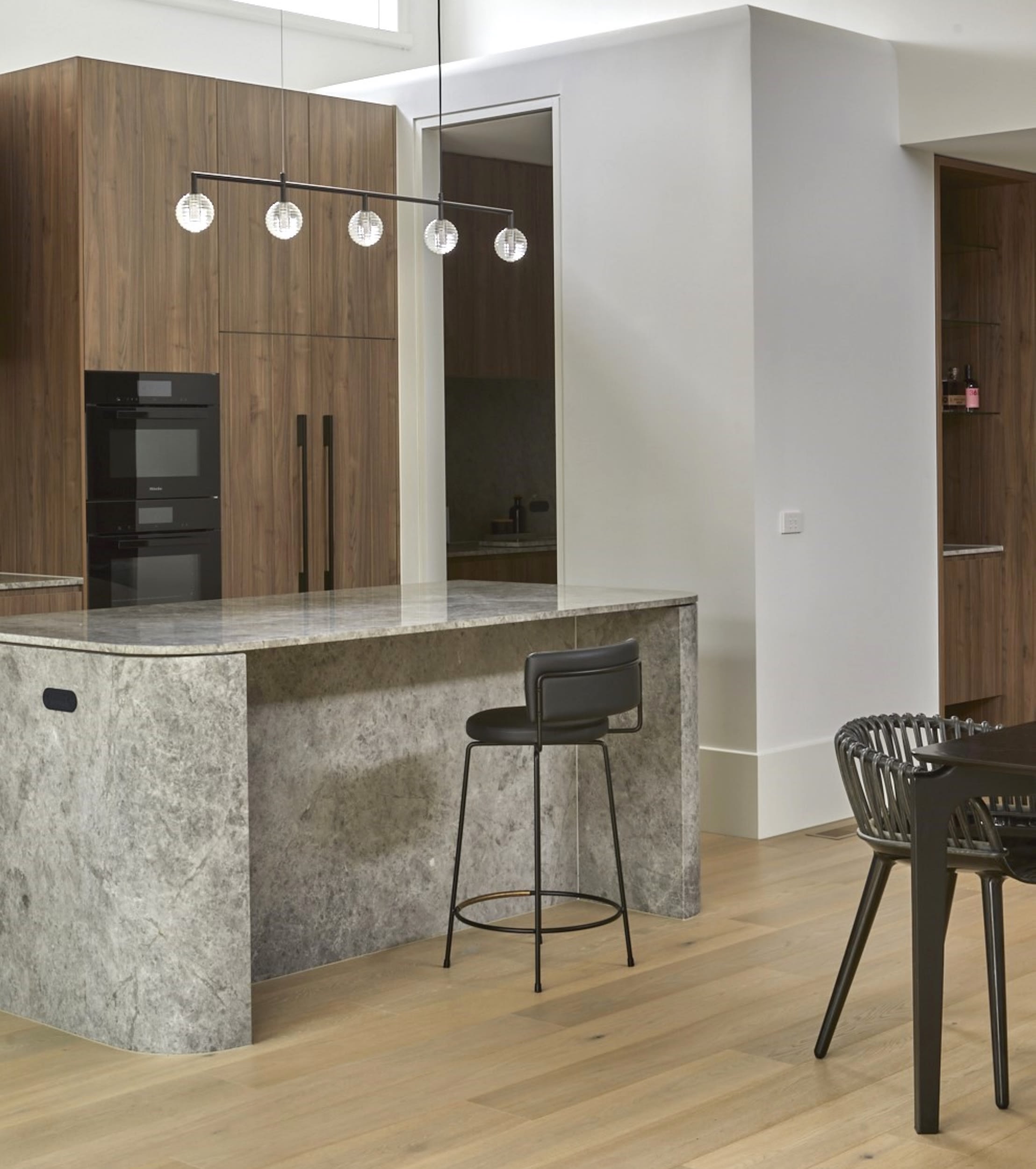 The joinery material palette of deep walnut oak tones and soft radius edge detailing is a nostalgic nod to the home’s modernist mid-century era.