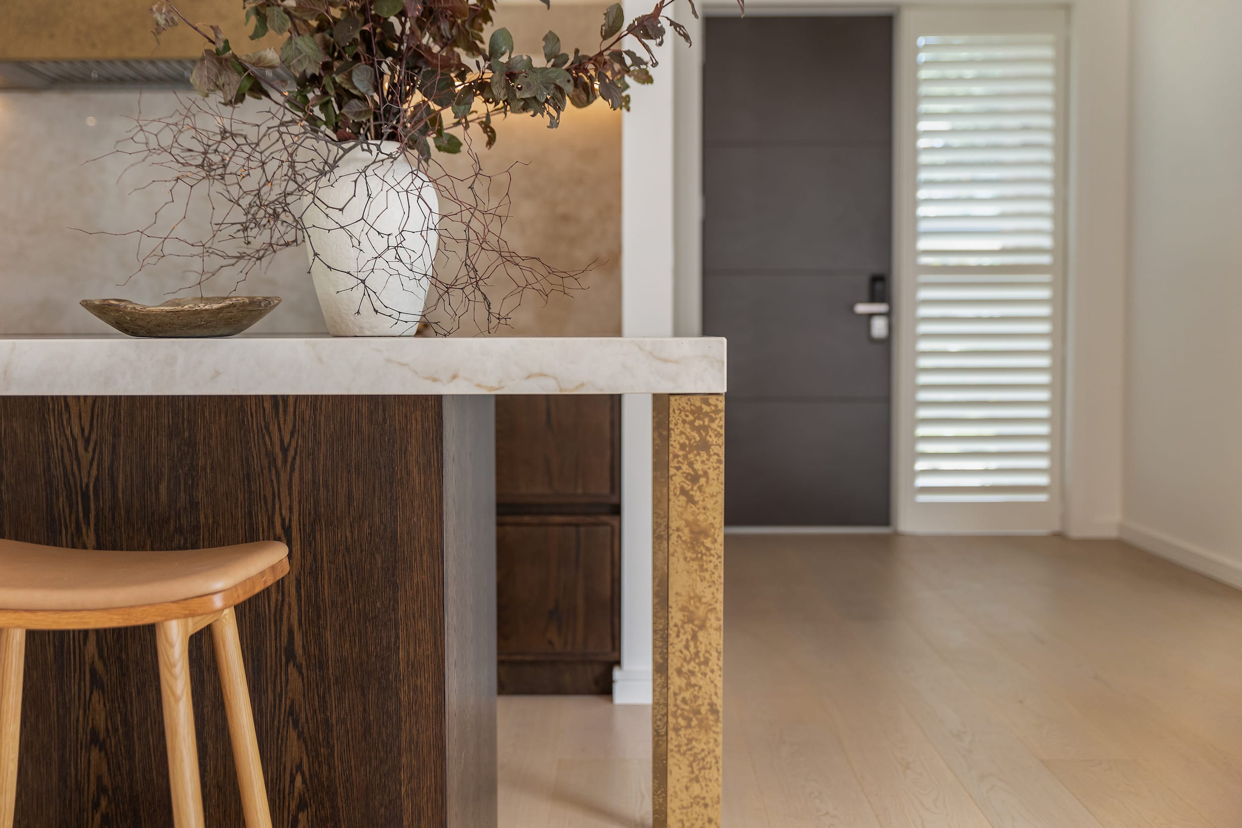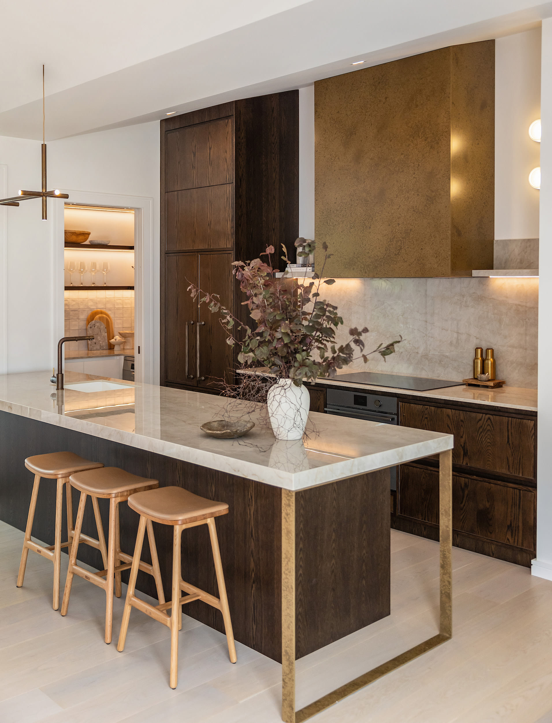 DesignerKate Gardham, Suede + Stone | CabinetryMain: Dezignatek Thermaform – Milan Profile, Ecru Matt; timber: American Walnut, crown cut, custom colour; brass: Rich Gold, Water Aged With Satin Clear Finish, from Metalier Coatings; engineered stone: Taj Nahal Almond, polished, from Ascale |