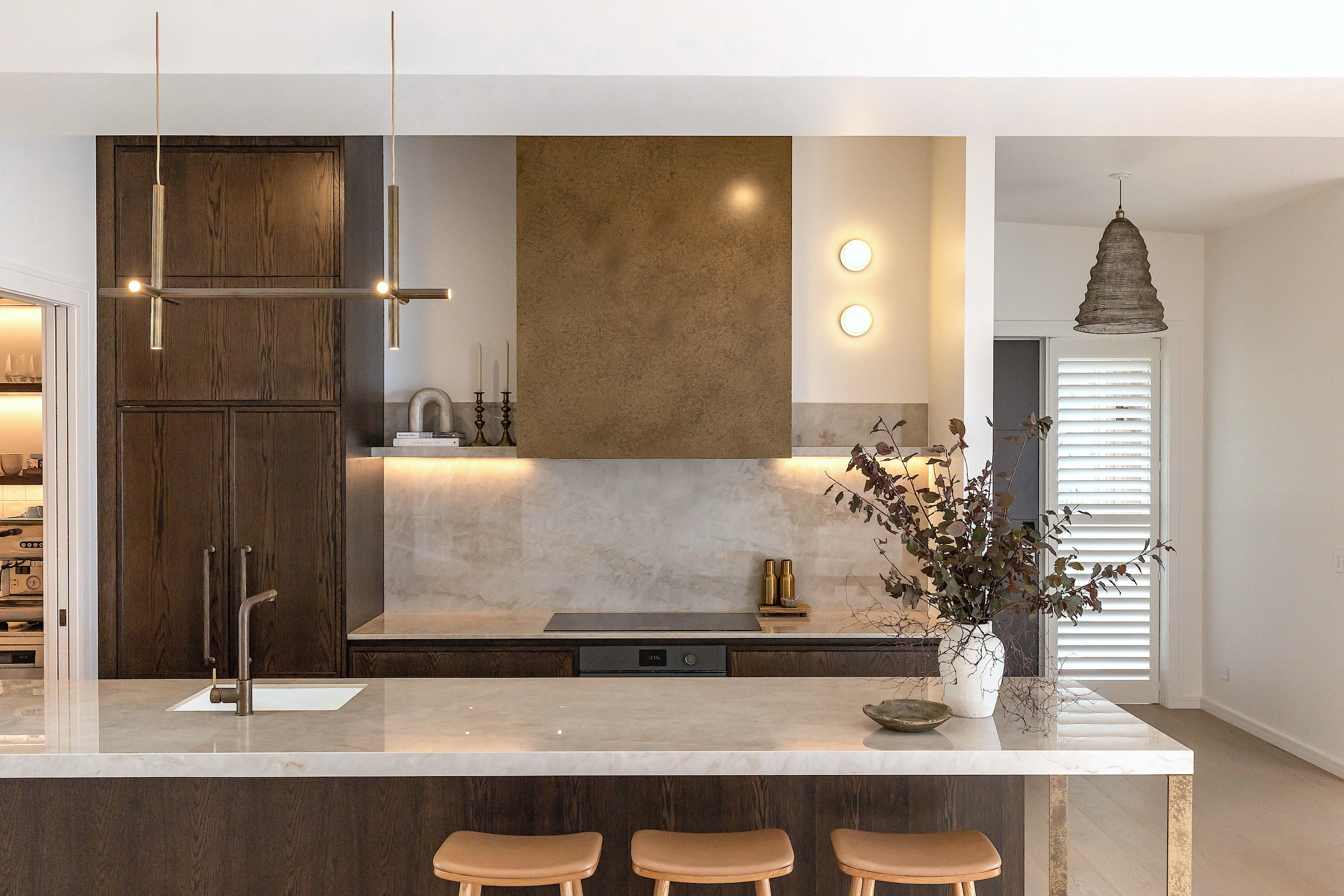 For this coastal kitchen, warm oak cabinetry combines with a veined stone island benchtop and splashback – both wood and stone echo the home's exterior and are in keeping with the seaside location