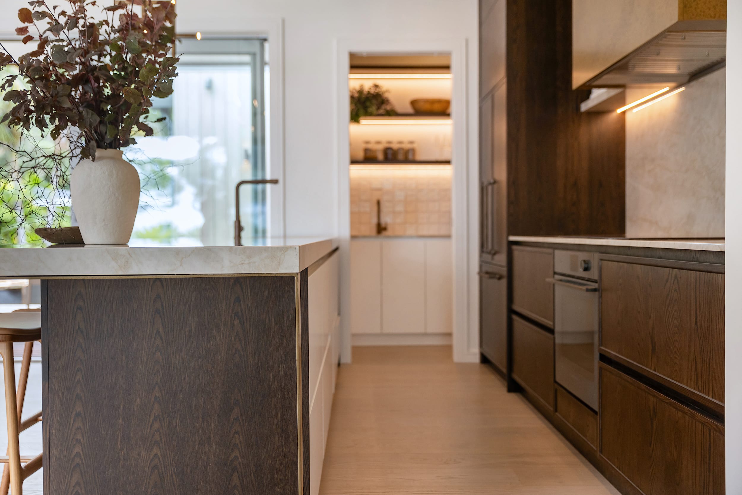- We had to work backwards in this design, when I was brought into the project the building work had already started, so some walls had to be moved to allow for the owner’s appliances and to be able to make the scullery usable with practical walk-in clearances and achieve benchtops deep enough to accommodate a sink and leave adequate space for prepping toast or making coffee.