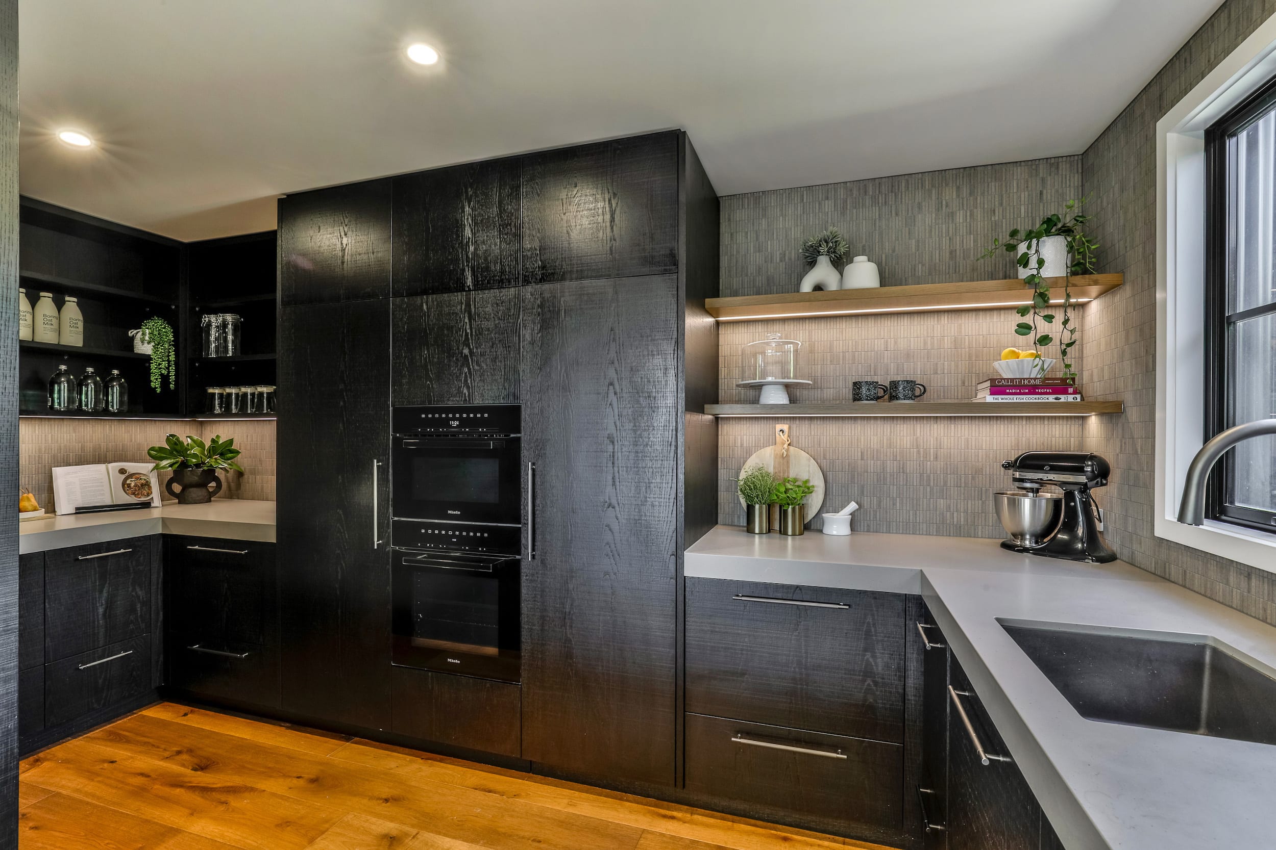 Photography by: Zenith Celsius Hydrotap Arc in Gunmetal AWards Trends International Design Awards (TIDA) Kitchens – Highly Commended Kitchen manufacturer Kitchen Dynamics Cabinetry hardware Drawers – Blum Legrabox Orion Grey; handles – Mardeco Toledo Bronze finish Splashback Bar – Essential Grey Marble by SCE Stone; scullery – Kreuz Dark Grey Matt Finger Mosaic, from Tile Space Flooring Forte Artiste Timber Flooring Taps Island – Buddy Kitchen Mixer with Pullout Spray in Aged Iron; scullery – Zenith Celsius Hydrotap Arc in Gunmetal Refrigeration (integrated) Fisher & Paykel Wine fridge (integrated) Liebherr Photography Jamie Cobel
