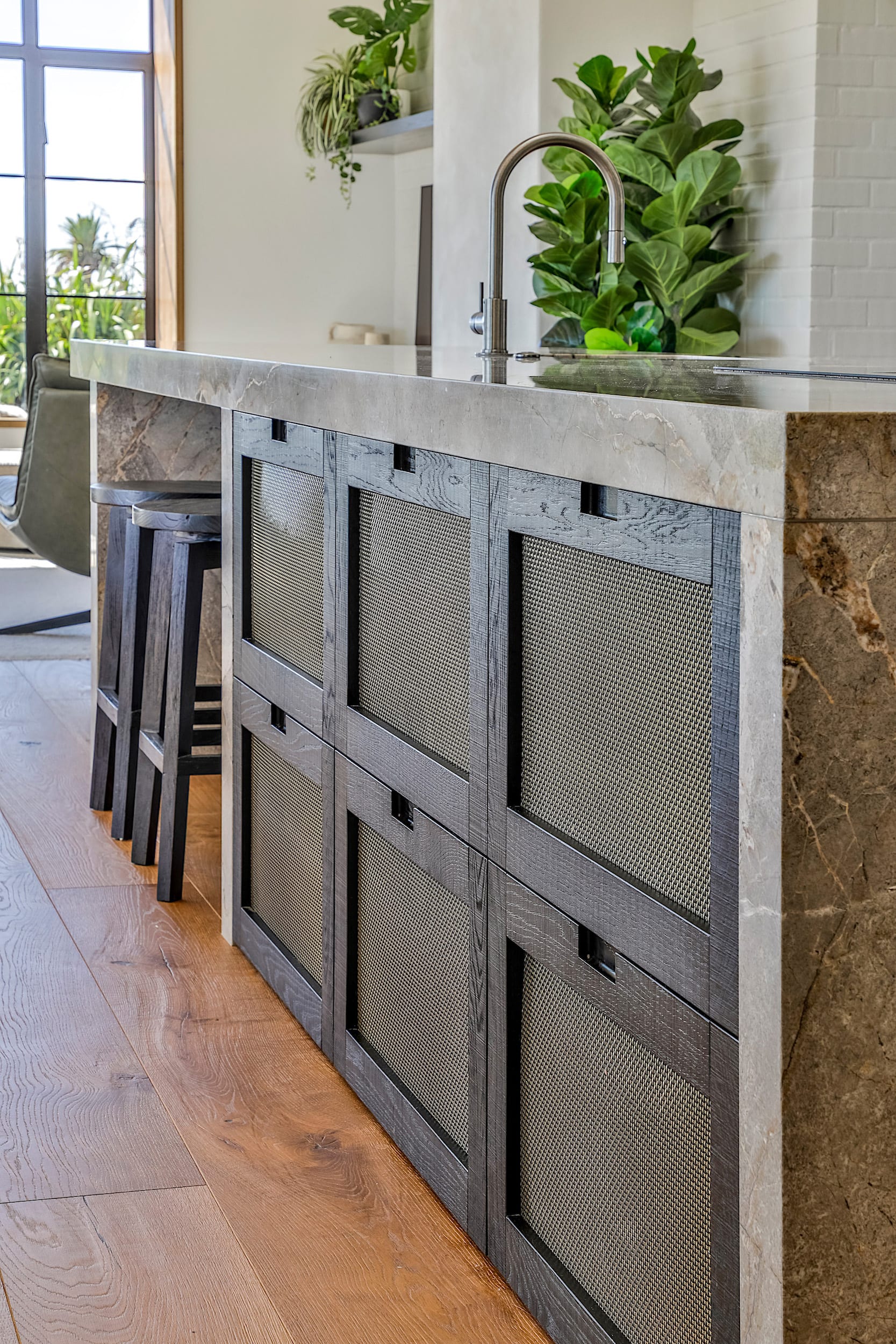 CabinetryPrime Art Planked Veneer – Brushed and Sawn with custom stain; feature shelves – Prime American Oak Veneer quarter cut with custom stain; drawers on front of island – Archant woven panel inserts, by Chadwell Antique Brass | Cabinetry hardwareDrawers – Blum Legrabox Orion Grey; handles – Mardeco Toledo Bronze finish |