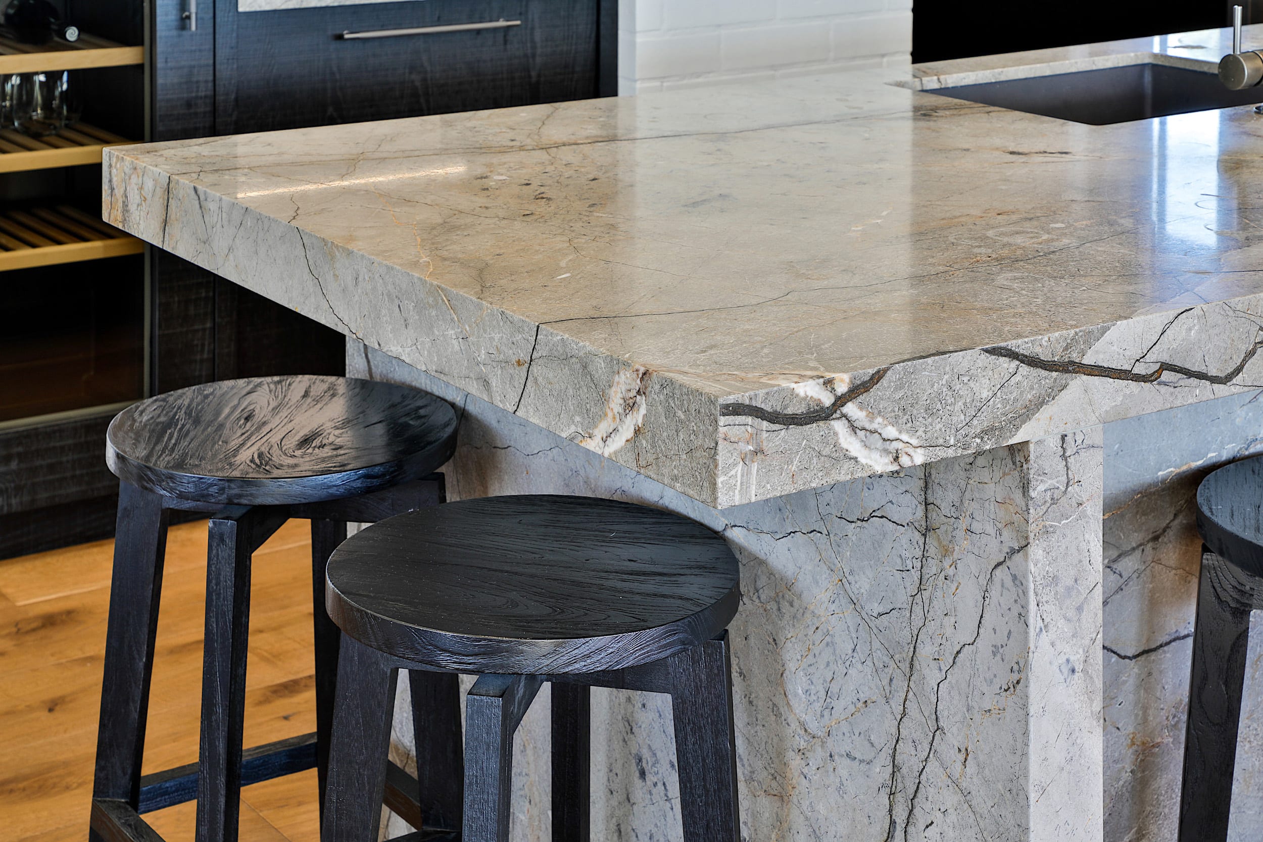 The marble, also seen on the bar benchtops, adds a luxurious touch while complementing the natural tones of the timber flooring and dark elements within the space.