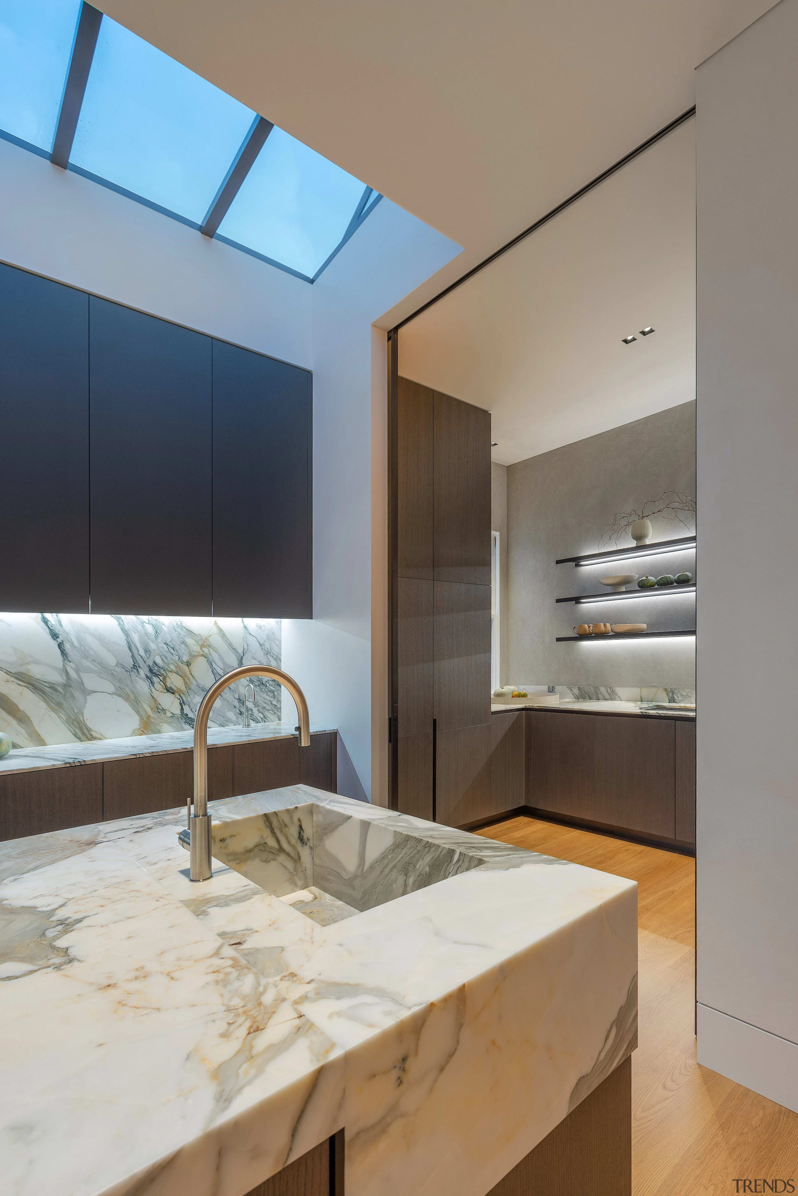 This kitchen deftly balances a sculptural presence with sound functionality – form, materiality, and subtle detailing are all on show while integrated appliances and a discreet pantry all keep their head down